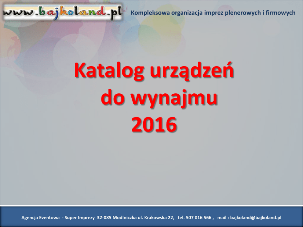 Kompleksowa organizacja imprez plenerowych i firmowych Katalog urządzeo do wynajmu 2016 Agencja Eventowa - Super Imprezy 32-085 Modlniczka ul. Krakowska 22, tel. 507 016 566 , mail : [email protected] Kompleksowa organizacja imprez plenerowych i firmowych Maluch Monster Tuning Art Celem naszej propozycji jest integracja uczestników imprezy . To jest klucz i istota dobrze zorganizowanej imprezy integracyjnej. Oferta zabawy integracyjnej Maluch Monster Tuning Art pozwala doskonale na wykazanie się przez uczestników kreatywnością w duchu dobrej zabawy a każdy z naszych gości znajdzie coś dla siebie Cena wynajmu: PAKIET – I PAKIET – II PAKIET – III PAKIET – IV 3 MALUCHY 5 MALUCHÓW 7 MALUCHÓW 10 MALUCHÓW - 3 600 5 000 8 000 10 000 zł/ netto zł/ netto zł/ netto zł/ netto W cenę wliczone są: Obsługa urządzenia Ubezpieczenie OC Transport Agencja Eventowa - Super Imprezy 32-085 Modlniczka ul. Krakowska 22, tel. 507 016 566 , mail : [email protected] Kompleksowa organizacja imprez plenerowych i firmowych Futbolowe Kule Skaczące Futbolowe Kule Skaczące to wspaniała zabawa na imprezy integracyjne i spotkania plenerowe . To również doskonałe urozmaicenie meczów Piłki Nożnej, oraz innych form rywalizacji. Nasze Futbolowe Kule Skaczące nawet podczas upadków i przewrotów zapewniają pełne bezpieczeostwo użytkowników Cena wynajmu: 250 zł netto/szt Dostępne w kolorze niebieskim i czerwonym W cenę wliczone jest: Obsługa urządzenia (przy wynajmie 4 szt) Ubezpieczenie OC Średnica – 150 cm (dzieci i dorośli od 140 cm do 190 cm wzrostu) Średnica – 120 cm (dzieci od 110 cm do 150 cm wzrostu) Agencja Eventowa - Super Imprezy 32-085 Modlniczka ul. Krakowska 22, tel. 507 016 566 , mail : [email protected] Kompleksowa organizacja imprez plenerowych i firmowych Zjeżdżalnia Dinozaur Duża Wspaniała zabawa dla dzieci przeznaczona na wszelkie imprezy , oraz spotkania plenerowe Urządzenie jest przeznaczone dla nawet najmłodszych dzieci. Cena wynajmu: 1500 zł netto W cenę wliczone jest: Obsługa urządzenia Ubezpieczenie OC Wymiary szerokośd - 5 m wysokośd - 7,5 m długośd - 8m Wiek uczestników: od 3 lat Energia elektryczna: 230V - 1,1KW Agencja Eventowa - Super Imprezy 32-085 Modlniczka ul. Krakowska 22, tel. 507 016 566 , mail : [email protected] Kompleksowa organizacja imprez plenerowych i firmowych Zjeżdżalnia Konik - średnia Zjeżdżalnia Konik to atrakcja, bez której nie może odbyd się żadna impreza dla dzieci. Cena wynajmu: 1200 zł netto W cenę wliczone jest: Obsługa urządzenia Ubezpieczenie OC Wymiary szerokośd - 4 m wysokośd - 6 m długośd - 7,5 m Wiek uczestników: od 3 lat Energia elektryczna: 230V - 1,1KW Agencja Eventowa - Super Imprezy 32-085 Modlniczka ul. Krakowska 22, tel. 507 016 566 , mail : [email protected] Kompleksowa organizacja imprez plenerowych i firmowych Zjeżdżalnia Dino - mała Atrakcja, przeznaczona dla najmłodszych dzieci Wspaniała i bezpieczna zabawa Cena wynajmu: 1200 zł netto W cenę wliczone jest: Obsługa urządzenia Ubezpieczenie OC Wymiary szerokośd - 3,5 m wysokośd - 4,2 m długośd - 4,6 m Wiek uczestników: od 3 lat Energia elektryczna: 230V - 1,1KW Agencja Eventowa - Super Imprezy 32-085 Modlniczka ul. Krakowska 22, tel. 507 016 566 , mail : [email protected] Kompleksowa organizacja imprez plenerowych i firmowych Zjeżdżalnia Pirat Zjeżdżalnia jest bardzo efektowna i kolorowa. Może byd jednym z elementów pikniku pirackiego lub jako samodzielna atrakcja dla dzieci i młodzieży. Cena wynajmu: 1500 zł netto W cenę wliczone jest: Obsługa urządzenia Ubezpieczenie OC Długośd - 9 m Szerokośd -4,5 m Wysokośd – 7,5 m Wiek uczestników: od 3 lat Max. liczba uczestników: 15/os. Energia elektryczna: 1,1kW Agencja Eventowa - Super Imprezy 32-085 Modlniczka ul. Krakowska 22, tel. 507 016 566 , mail : [email protected] Kompleksowa organizacja imprez plenerowych i firmowych Agencja Eventowa - Super Imprezy 32-085 Modlniczka ul. Krakowska 22, tel. 507 016 566 , mail : [email protected] Kompleksowa organizacja imprez plenerowych i firmowych Zjeżdżalnia Delfiny 1 - gigant Zjeżdżalnia duża „Delfiny” jest świetnym rozwiązaniem na imprezy z duża ilością dzieci. Urządzenie jest bardzo bezpieczne. Nie zawiera ostrych krawędzi Cena wynajmu: 1700 zł Netto W cenę wliczone jest: Obsługa urządzenia Ubezpieczenie OC Długośd - 13 m Szerokośd - 8 m Wysokośd - 11 m Wiek uczestników: od 3 lat Max. liczba uczestników: 15/os. Energia elektryczna: 230V, 1,1kW Agencja Eventowa - Super Imprezy 32-085 Modlniczka ul. Krakowska 22, tel. 507 016 566 , mail : [email protected] Kompleksowa organizacja imprez plenerowych i firmowych Zjeżdżalnia Delfiny 2 - gigant Zjeżdżalnia duża „Delfiny” jest świetnym rozwiązaniem na imprezy z duża ilością dzieci. Urządzenie jest bardzo bezpieczne. Nie zawiera ostrych krawędzi Cena wynajmu: 1700 zł Netto W cenę wliczone jest: Obsługa urządzenia Ubezpieczenie OC Długośd - 13 m Szerokośd - 8 m Wysokośd - 11 m Wiek uczestników: od 3 lat Max. liczba uczestników: 15/os. Energia elektryczna: 230V, 1,1kW Agencja Eventowa - Super Imprezy 32-085 Modlniczka ul. Krakowska 22, tel. 507 016 566 , mail : [email protected] Kompleksowa organizacja imprez plenerowych i firmowych Zjeżdżalnia tygrysek Kilka metrów wspinaczki po drabince zjeżdżalni, a następnie super zjazd w dół! To sprawdzone urządzenie na wszystkie imprezy plenerowe. Zjeżdżalnia dmuchana to wspaniała zabawa dla najmłodszych! Cena wynajmu: 1500 zł Netto W cenę wliczone jest: Obsługa urządzenia Ubezpieczenie OC Długośd - 12 m Szerokośd -6 m Wysokośd -8 m Wiek uczestników: od 2 lat Max. liczba uczestników: 10/os. Energia elektryczna: 1,1kW Agencja Eventowa - Super Imprezy 32-085 Modlniczka ul. Krakowska 22, tel. 507 016 566 , mail : [email protected] Kompleksowa organizacja imprez plenerowych i firmowych Zjeżdżalnia Foot Ball Kilka metrów wspinaczki po drabince zje
