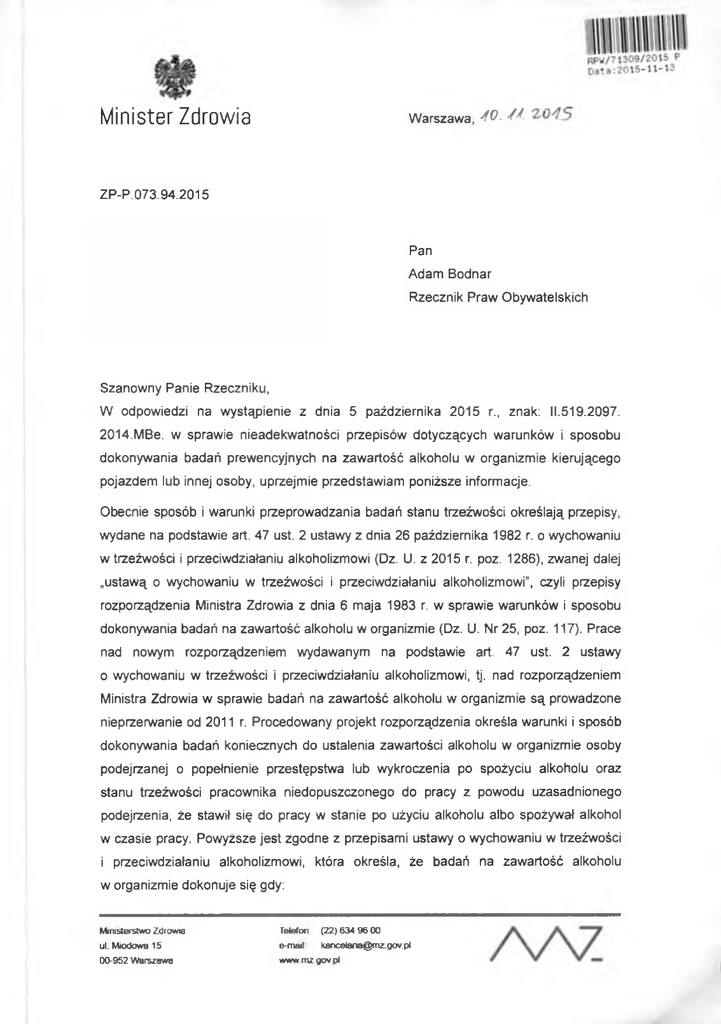 Minister Zdrowia Warszawa, 40 . / / . ZP-P.073.94.2015 Pan Adam Bodnar Rzecznik Praw Obywatelskich Szanowny Panie Rzeczniku, W odpowiedzi na wystąpienie z dnia 5 października 2015 r., znak: 11.519.2097. 2014.MBe. w sprawie nieadekwatności przepisów dotyczących warunków i sposobu dokonywania badań prewencyjnych na zawartość alkoholu w organizmie kierującego pojazdem lub innej osoby, uprzejmie przedstawiam poniższe informacje. Obecnie sposób i warunki przeprowadzania badań stanu trzeźwości określają przepisy, wydane na podstawie art. 47 ust. 2 ustawy z dnia 26 października 1982 r. o wychowaniu w trzeźwości i przeciwdziałaniu alkoholizmowi (Dz. U. z 2015 r. poz. 1286), zwanej dalej „ustawą o wychowaniu w trzeźwości i przeciwdziałaniu alkoholizmowi”, czyli przepisy rozporządzenia Ministra Zdrowia z dnia 6 maja 1983 r. w sprawie warunków i sposobu dokonywania badań na zawartość alkoholu w organizmie (Dz. U. Nr 25, poz. 117). Prace nad nowym rozporządzeniem wydawanym na podstawie art. 47 ust. 2 ustawy 0 wychowaniu w trzeźwości i przeciwdziałaniu alkoholizmowi, tj. nad rozporządzeniem Ministra Zdrowia w sprawie badań na zawartość alkoholu w organizmie są prowadzone nieprzerwanie od 2011 r. Procedowany projekt rozporządzenia określa warunki i sposób dokonywania badań koniecznych do ustalenia zawartości alkoholu w organizmie osoby podejrzanej o popełnienie przestępstwa lub wykroczenia po spożyciu alkoholu oraz stanu trzeźwości pracownika niedopuszczonego do pracy z powodu uzasadnionego podejrzenia, że stawił się do pracy w stanie po użyciu alkoholu albo spożywał alkohol w czasie pracy. Powyższe jest zgodne z przepisami ustawy o wychowaniu w trzeźwości 1 przeciwdziałaniu alkoholizmowi, która określa, że badań na zawartość alkoholu w organizmie dokonuje się gdy: Ministerstwo Zdrowia Telefon (22) 634 96 00 ul. Miodowa 15 e-mai! [email protected] 00-952 Warszawa w w w m zgovpl - zachodzi podejrzenie, że przestępstwo lub wykroczenie zostało popełnione po spożyciu alkoholu: osoba podejrzana może być poddana badaniu koniecznemu do ustalenia zawartości alkoholu w organizmie, w szczególności zabiegowi pobrania krwi (art. 47 ustawy); - zachodzi uzasadnione podejrzenie, że pracownik stawił się do pracy w stanie po użyciu alkoholu albo spożywał alkohol w czasie pracy: kierownik zakładu pracy lub osoba przez niego upoważniona mają obowiązek niedopuszczenia do pracy takiego pracownika a okoliczności stanowiące podstawę decyzji powinny być podane pracownikowi do wiadomości: jednocześnie uprawnienia kierownika zakładu pracy służą również organowi nadrzędnemu nad danym zakładem pracy oraz organowi uprawnionemu do przeprowadzenia kontroli zakładu pracy (art. 17 ustawy). Konieczność wydania nowego rozporządzenia regulującego kwestię sposobu przeprowadzania badań na zawartość alkoholu w organizmie spowodowana jest wejściem w życie ustawy z dnia 25 marca 2011 r. o ograniczaniu barier administracyjnych dla obywateli i przedsiębiorców (Dz. U. Nr 106, poz. 622, z późn. zm.). Ustawa ta wprowadziła zmianę art. 17 ust. 3 ustawy o wychowaniu w trzeźwości i przeciwdziałaniu alkoholizmowi rozszerzając krąg osób uprawnionych do żądania przeprowadzenia badania stanu trzeźwości pracownika, co do którego zachodzi uzasadnione podejrzenie, że stawił się do pracy w stanie po użyciu alkoholu albo spożywał alkohol w czasie pracy, o kierownika zakładu pracy lub osobę przez niego upoważnioną. W wyniku powyższej nowelizacji określono również, że badanie stanu trzeźwości pracownika przeprowadza uprawniony organ powołany do ochrony porządku publicznego, zaś zabiegu pobrania krwi dokonuje fachowy pracownik służby zdrowia. W związku z tą zmianą, na mocy art. 93 ust. 2 ustawy z dnia 25 marca 2011 r. o ograniczaniu barier administracyjnych dla obywateli i przedsiębiorców, obowiązujące rozporządzenie zostało zachowane w mocy do czasu wejścia w życie nowego aktu wykonawczego. Odnosząc się do badania kierowców na zawartość alkoholu w organizmie należy zauważyć, że art. 129i ust. 1 ustawy z dnia 20 czerwca 1997 r. - Prawo o ruchu drogowym (Dz. U. z 2012 r., poz. 1137, z późn. zm.) stanowi, że badanie w celu ustalenia zawartości w organizmie alkoholu przeprowadza się przy użyciu urządzeń elektronicznych dokonujących pomiaru stężenia alkoholu w wydychanym powietrzu. Art. 129i ust. 4 tej ustawy odsyła do rozporządzenia wydawanego na podstawie art. 47 ust. 2 ustawy o wychowaniu w trzeźwości i przeciwdziałaniu alkoholizmowi jedynie 2 w zakresie warunków i sposobu przeprowadzania badań w celu ustalenia zawartości alkoholu w organizmie. Wymaga stanowczego podkreślenia, że Minister Zdrowia w pełni podziela stanowisko Rzecznika Praw Obywatelskich, że regulacje w zakresie nadania Policji uprawnień żądania poddania się przez kierującego pojazdem lub inną osobę, w stosunku do której zachodzi uzasadnione podejrzenie, że mogła kierować pojazdem, badaniu w celu ustalenia zawartości alkoholu w organizmie, a także nałożenia obowiązku poddania się takiemu badaniu przez daną osobę, jako dotykające fundamentalnych, konstytucyjnie strzeżonych, praw i obowiązków organów i obywateli, muszą być precyzyjnie uregulowane. Co więcej muszą być one określone w akcie ustawowym i nie mogą być materią aktu wykonawczego, jakim jest rozporządzenie. Zagadnienia dotyczące uprawnień Policji, w tym w zakresie przeprowadzania badań prewencyjnych (rutynowych) na zawartość alkoholu w organizmie nie mogą zatem być uregulowane obecnie procedowanym, wyżej wskazanym rozporządzeniem Ministra Zdrowia. Trzeba też wskazać, że zasady ruchu na drogach publicznych czy zasady i warunki kontroli ruchu drogowego określono w ustawie z dnia 20 czerwca 1997 r. - Prawo o ruchu drogowym, i to Ministerstwo Spraw Wewnętrznych jest właściwe w zakresie interpretacji b