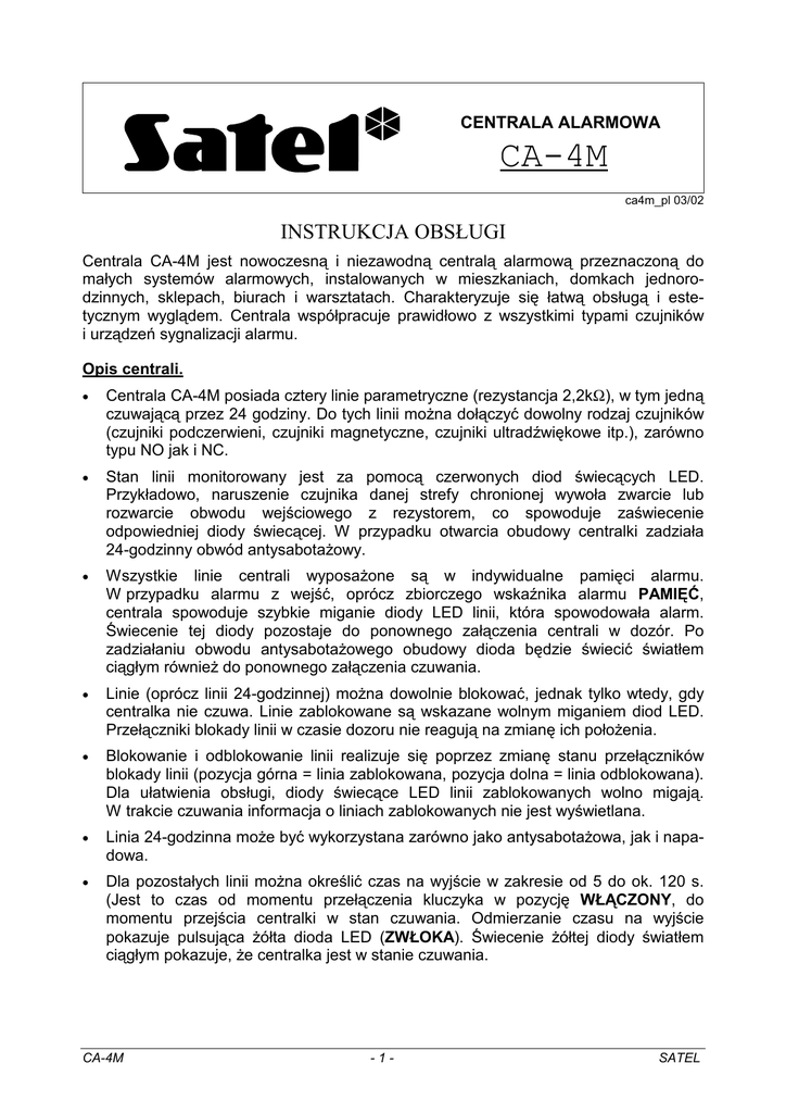 CENTRALA ALARMOWA CA-4M ca4m_pl 03/02 INSTRUKCJA OBSŁUGI Centrala CA-4M jest nowoczesną i niezawodną centralą alarmową przeznaczoną do małych systemów alarmowych, instalowanych w mieszkaniach, domkach jednorodzinnych, sklepach, biurach i warsztatach. Charakteryzuje się łatwą obsługą i estetycznym wyglądem. Centrala współpracuje prawidłowo z wszystkimi typami czujników i urządzeń sygnalizacji alarmu. Opis centrali. • Centrala CA-4M posiada cztery linie parametryczne (rezystancja 2,2kΩ), w tym jedną czuwającą przez 24 godziny. Do tych linii można dołączyć dowolny rodzaj czujników (czujniki podczerwieni, czujniki magnetyczne, czujniki ultradźwiękowe itp.), zarówno typu NO jak i NC. • Stan linii monitorowany jest za pomocą czerwonych diod świecących LED. Przykładowo, naruszenie czujnika danej strefy chronionej wywoła zwarcie lub rozwarcie obwodu wejściowego z rezystorem, co spowoduje zaświecenie odpowiedniej diody świecącej. W przypadku otwarcia obudowy centralki zadziała 24-godzinny obwód antysabotażowy. • Wszystkie linie centrali wyposażone są w indywidualne pamięci alarmu. W przypadku alarmu z wejść, oprócz zbiorczego wskaźnika alarmu PAMIĘĆ, centrala spowoduje szybkie miganie diody LED linii, która spowodowała alarm. Świecenie tej diody pozostaje do ponownego załączenia centrali w dozór. Po zadziałaniu obwodu antysabotażowego obudowy dioda będzie świecić światłem ciągłym również do ponownego załączenia czuwania. • Linie (oprócz linii 24-godzinnej) można dowolnie blokować, jednak tylko wtedy, gdy centralka nie czuwa. Linie zablokowane są wskazane wolnym miganiem diod LED. Przełączniki blokady linii w czasie dozoru nie reagują na zmianę ich położenia. • Blokowanie i odblokowanie linii realizuje się poprzez zmianę stanu przełączników blokady linii (pozycja górna = linia zablokowana, pozycja dolna = linia odblokowana). Dla ułatwienia obsługi, diody świecące LED linii zablokowanych wolno migają. W trakcie czuwania informacja o liniach zablokowanych nie jest wyświetlana. • Linia 24-godzinna może być wykorzystana zarówno jako antysabotażowa, jak i napadowa. • Dla pozostałych linii można określić czas na wyjście w zakresie od 5 do ok. 120 s. (Jest to czas od momentu przełączenia kluczyka w pozycję WŁĄCZONY, do momentu przejścia centralki w stan czuwania. Odmierzanie czasu na wyjście pokazuje pulsująca żółta dioda LED (ZWŁOKA). Świecenie żółtej diody światłem ciągłym pokazuje, że centralka jest w stanie czuwania. CA-4M -1- SATEL • Czas na wejście (opóźnienie) można określić tylko dla linii pierwszej Z1, w zakresie od 5 do ok. 120 s. Czas ten odmierzany jest tylko wtedy, gdy wejście inicjatora zwłoki DLY jest zwarte do masy. Jeżeli wejście DLY jest rozwarte, to centrala po naruszeniu wejscia Z1 alarmuje natychmiast, jak po naruszeniu pozostałych wejść centrali. • Centrala CA-4M posiada wyjścia na dwa sygnalizatory akustyczne, oraz niezależne wyjście na sygnalizator optyczny. • Czas działania sygnalizatorów akustycznych jest regulowany w zakresie od 10 do ok. 300 s. Wyjście optyczne pozostaje załączone do czasu skasowania alarmu kluczykiem. • Wszystkie wyjścia sygnalizatorów oraz zasilanie czujników zabezpieczone są bezpiecznikami. • Centrala CA-4M zasilana jest z sieci ∼220V oraz z akumulatora 12V (przewidziano miejsce wewnątrz centralki na akumulator o pojemności 6,5 Ah). • Zasilacz centralki doładowuje akumulator oraz zasila czujniki. INSTALOWANIE Centrala alarmowa jest podłączona do zasilania sieciowego na stałe. W związku z tym, przed przystąpieniem do wykonania okablowania systemu, należy zapoznać się z instalacją elektryczną obiektu. Do zasilania centrali należy wybrać obwód, w którym napięcie będzie obecne cały czas, zabezpieczony właściwym bezpiecznikiem. 1. Zdjąć płytę czołową, odłączyć stacyjkę i zamontować centralkę. 2. Podłączyć wyjścia czujników i zasilanie czujników. W stanie normalnym, obwód wejściowy każdej linii (także 24-godzinnej) musi być zamknięty do masy rezystorem 2,2kΩ. Rezystor ten montuje się w czujniku (w czujnikach NO równolegle do wyjścia czujnika, a w czujnikach NC szeregowo). 3. Podłączyć sygnalizatory. Pomiędzy wyjście i masę (równolegle do sygnalizatora) należy włączyć rezystor 2,2kΩ. Jeden rezystor do jednego z wyjść OUT1 lub OUT2, a drugi do wyjścia OUT3. Rezystory te zapobiegają nieporządanym dźwiękom lub przypadkowemu wyzwoleniu się sygnalizacji. 4. Podłączyć inicjator zwłoki (jeśli występuje) poprzez zwarcie obwodu DLY do masy. +12V NC COM ZAS.CZUJNIKÓW wejście LINIA TMP GND MASA Podłączenie czujnika typu NC +12V NO COM ZAS.CZUJNIKÓW wejście LINIA TMP GND MASA Podłączenie czujnika typu NO 5. Podłączyć sieć i uruchomić system alarmowy. 6. Ustawić za pomocą potencjometrów montażowych czasy na wyjście, na wejście i czas alarmu. 7. Podłączyć stacyjkę do obwodu KEY-COM (masa), akumulator i zamontować płytę czołową. CA-4M -2- SATEL UWAGA ! Ponieważ centrala zasilana jest z sieci ~220V, nieostrożność podczas podłączania lub błędne podłączenie może grozić porażeniem i stanowić zagrożenie życia ! W związku z tym, przy podłączaniu centrali należy zachować szczególną ostrożność. Przewód, którym podłączone będzie zasilanie sieciowe, w trakcie montażu i podłączania centrali nie może być pod napięciem ! Przed dołączeniem centrali do obwodu, z którego będzie ona zasilana, należy wyłączyć w tym obwodzie napięcie. UWAGI • Aby uniknąć włączenia sygnalizatorów po podłączeniu zasilania, należy wcześniej wyjąć bezpieczniki sygnalizatorów. • Uruchamianie systemu najlepiej przeprowadzić z zasilacza sieciowego, który zabezpieczony jest przed ewentualnym zwarciem. Przypadkowe zwarcie przy podłączonym akumulatorze może spowodować poważne uszk