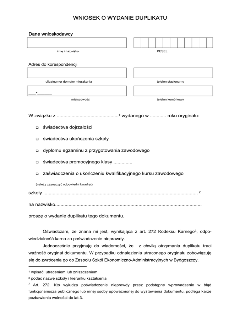 Wniosek o duplikat świadectwa - Zespół Szkół Ekonomiczno