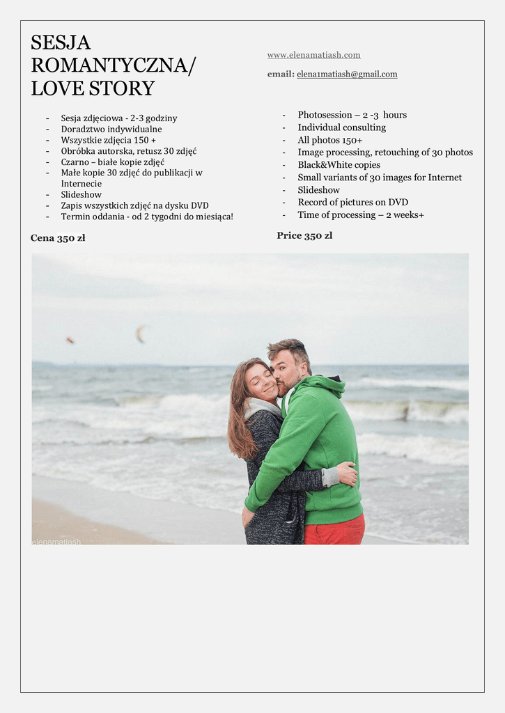 SESJA ROMANTYCZNA/ LOVE STORY - Sesja zdjęciowa - 2-3 godziny Doradztwo indywidualne Wszystkie zdjęcia 150 + Obróbka autorska, retusz 30 zdjęć Czarno – białe kopie zdjęć Małe kopie 30 zdjęć do publikacji w Internecie Slideshow Zapis wszystkich zdjęć na dysku DVD Termin oddania - od 2 tygodni do miesiąca! Cena 350 zł www.elenamatiash.com email: [email protected] - Photosession – 2 -3 hours Individual consulting All photos 150+ Image processing, retouching of 30 photos Black&White copies Small variants of 30 images for Internet Slideshow Record of pictures on DVD Time of processing – 2 weeks+ Price 350 zl