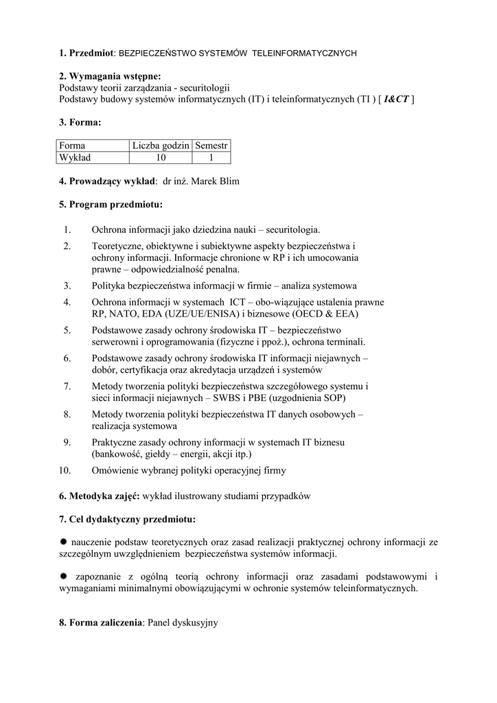 1. Przedmiot: BEZPIECZEŃSTWO SYSTEMÓW TELEINFORMATYCZNYCH 2. Wymagania wstępne: Podstawy teorii zarządzania - securitologii Podstawy budowy systemów informatycznych (IT) i teleinformatycznych (TI ) [ I&CT ] 3. Forma: Forma Wykład Liczba godzin Semestr 10 1 4. Prowadzący wykład: dr inż. Marek Blim 5. Program przedmiotu: 1. Ochrona informacji jako dziedzina nauki – securitologia. 2. Teoretyczne, obiektywne i subiektywne aspekty bezpieczeństwa i ochrony informacji. Informacje chronione w RP i ich umocowania prawne – odpowiedzialność penalna. 3. Polityka bezpieczeństwa informacji w firmie – analiza systemowa 4. Ochrona informacji w systemach ICT – obo-wiązujące ustalenia prawne RP, NATO, EDA (UZE/UE/ENISA) i biznesowe (OECD & EEA) 5. Podstawowe zasady ochrony środowiska IT – bezpieczeństwo serwerowni i oprogramowania (fizyczne i ppoż.), ochrona terminali. 6. Podstawowe zasady ochrony środowiska IT informacji niejawnych – dobór, certyfikacja oraz akredytacja urządzeń i systemów 7. Metody tworzenia polityki bezpieczeństwa szczegółowego systemu i sieci informacji niejawnych – SWBS i PBE (uzgodnienia SOP) 8. Metody tworzenia polityki bezpieczeństwa IT danych osobowych – realizacja systemowa 9. Praktyczne zasady ochrony informacji w systemach IT biznesu (bankowość, giełdy – energii, akcji itp.) 10. Omówienie wybranej polityki operacyjnej firmy 6. Metodyka zajęć: wykład ilustrowany studiami przypadków 7. Cel dydaktyczny przedmiotu: nauczenie podstaw teoretycznych oraz zasad realizacji praktycznej ochrony informacji ze szczególnym uwzględnieniem bezpieczeństwa systemów informacji. zapoznanie z ogólną teorią ochrony informacji oraz zasadami podstawowymi i wymaganiami minimalnymi obowiązującymi w ochronie systemów teleinformatycznych. 8. Forma zaliczenia: Panel dyskusyjny 9. Literatura Autor Dening D.E. Gałach A. Kaczor P. Konieczny J. Liderman K. Lukatsky A. Pipkin D.L. Praca zbiorowa : K. Waćkowski, J. Krawiec, J. Bereda, E. Chmielewska, M. Malińska Stallings W Stawowski M. Yourdon E. Dokumenty normatywne Tytuł Rok wydania „Wojna informacyjna i bezpieczeństwo informacji”, seria TAO, wyd. WNT, Warszawa 2002 „Instrukcja zarządzania bezpieczeństwem systemu informatycznego”, wyd. ODDK, Gdańsk „Hacking, cracking, phreacking czyli ochrona przed cyberoszustami”, wyd. MIKOM, W-wa „Wprowadzenie do bezpieczeństwa biznesu”, wyd. Konsalnet S.A., Warszawa „Standardy w ocenie bezpieczeństwa teleinformatycznego”, Biuletyn IAiR Nr 17,WAT, W-wa „Wykrywanie włamań i aktywna ochrona danych. Elita rosyjskich hakerów prezentuje Ну Погоди !”, wyd. Helion, Gliwice „Bezpieczeństwo informacji. Ochrona globalnego przedsiębiorstwa”, seria TAO, wyd. WNT, Warszawa „Informatyka. Terminologia znormalizowana i wykaz norm.” wyd. Polski Komitet Normalizacyjny, Warszawa + suplement z 2008r. 2005 „Ochrona danych w sieci i intersieci. W teorii i praktyce.”, wyd. WNT, Warszawa „Ochrona informacji w sieciach komputerowych”, wyd. ArsKom, Warszawa „Wojna na bity”, seria TAO, wyd. WNT, Warszawa ISO/IEC 27005:2008 Risk management ISO/IEC 15408:2005 Evaluation criteria for IT security (2 edition) ISO/IEC 17971-1:2005 Security assessment for operational system ISO/IEC 13335-1:2004 Management of information and communications technology security - Concepts and Models PN-ISO/IEC TR 13335-3:2003 Techniki zarządzania bezpieczeństwem informacji PN-ISO/IEC TR 13335-2:2002 Planowanie i zarządzanie bezpieczeństwem systemów informatycznych PN-I-02000:1998 Technika informatyczna. Zabezpieczenia w systemach informatycznych 10. Wydział: Elektryczny Rodzaj studiów: podyplomowe 2004 2004 2002 2005 2002 2006 1997 1998 2004
