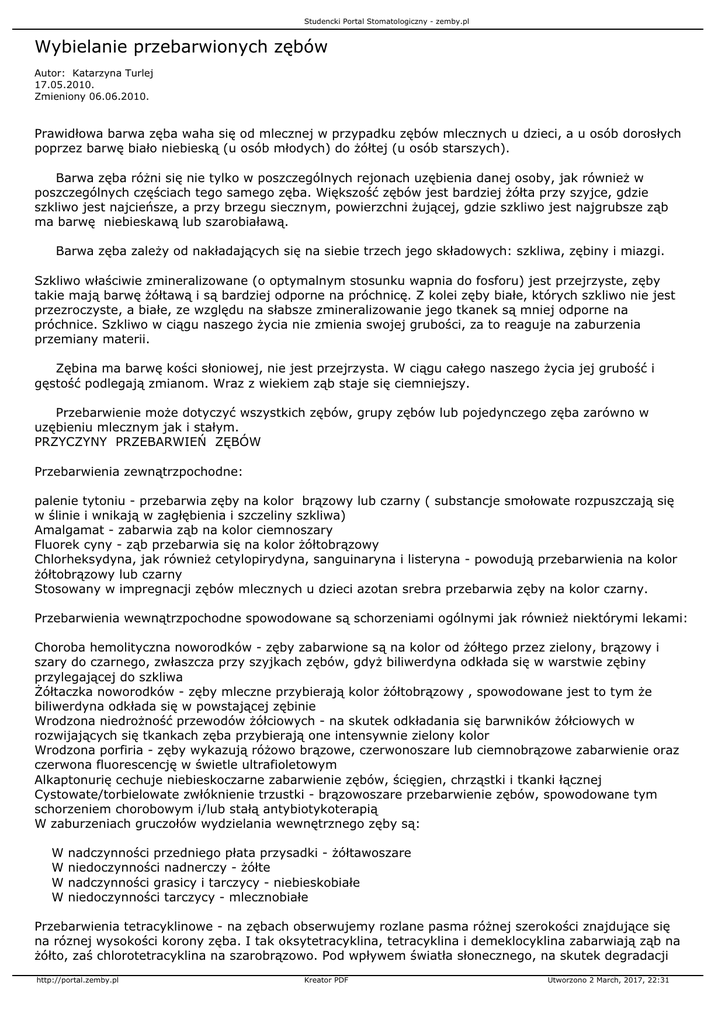 Studencki Portal Stomatologiczny - zemby.pl Wybielanie przebarwionych zębów Autor: Katarzyna Turlej 17.05.2010. Zmieniony 06.06.2010. Prawidłowa barwa zęba waha się od mlecznej w przypadku zębów mlecznych u dzieci, a u osób dorosłych poprzez barwę biało niebieską (u osób młodych) do żółtej (u osób starszych). Barwa zęba różni się nie tylko w poszczególnych rejonach uzębienia danej osoby, jak również w poszczególnych częściach tego samego zęba. Większość zębów jest bardziej żółta przy szyjce, gdzie szkliwo jest najcieńsze, a przy brzegu siecznym, powierzchni żującej, gdzie szkliwo jest najgrubsze ząb ma barwę niebieskawą lub szarobiaławą. Barwa zęba zależy od nakładających się na siebie trzech jego składowych: szkliwa, zębiny i miazgi. Szkliwo właściwie zmineralizowane (o optymalnym stosunku wapnia do fosforu) jest przejrzyste, zęby takie mają barwę żółtawą i są bardziej odporne na próchnicę. Z kolei zęby białe, których szkliwo nie jest przezroczyste, a białe, ze względu na słabsze zmineralizowanie jego tkanek są mniej odporne na próchnice. Szkliwo w ciągu naszego życia nie zmienia swojej grubości, za to reaguje na zaburzenia przemiany materii. Zębina ma barwę kości słoniowej, nie jest przejrzysta. W ciągu całego naszego życia jej grubość i gęstość podlegają zmianom. Wraz z wiekiem ząb staje się ciemniejszy. Przebarwienie może dotyczyć wszystkich zębów, grupy zębów lub pojedynczego zęba zarówno w uzębieniu mlecznym jak i stałym. PRZYCZYNY PRZEBARWIEŃ ZĘBÓW Przebarwienia zewnątrzpochodne: palenie tytoniu - przebarwia zęby na kolor brązowy lub czarny ( substancje smołowate rozpuszczają się w ślinie i wnikają w zagłębienia i szczeliny szkliwa) Amalgamat - zabarwia ząb na kolor ciemnoszary Fluorek cyny - ząb przebarwia się na kolor żółtobrązowy Chlorheksydyna, jak również cetylopirydyna, sanguinaryna i listeryna - powodują przebarwienia na kolor żółtobrązowy lub czarny Stosowany w impregnacji zębów mlecznych u dzieci azotan srebra przebarwia zęby na kolor czarny. Przebarwienia wewnątrzpochodne spowodowane są schorzeniami ogólnymi jak również niektórymi lekami: Choroba hemolityczna noworodków - zęby zabarwione są na kolor od żółtego przez zielony, brązowy i szary do czarnego, zwłaszcza przy szyjkach zębów, gdyż biliwerdyna odkłada się w warstwie zębiny przylegającej do szkliwa Żółtaczka noworodków - zęby mleczne przybierają kolor żółtobrązowy , spowodowane jest to tym że biliwerdyna odkłada się w powstającej zębinie Wrodzona niedrożność przewodów żółciowych - na skutek odkładania się barwników żółciowych w rozwijających się tkankach zęba przybierają one intensywnie zielony kolor Wrodzona porfiria - zęby wykazują różowo brązowe, czerwonoszare lub ciemnobrązowe zabarwienie oraz czerwona fluorescencję w świetle ultrafioletowym Alkaptonurię cechuje niebieskoczarne zabarwienie zębów, ścięgien, chrząstki i tkanki łącznej Cystowate/torbielowate zwłóknienie trzustki - brązowoszare przebarwienie zębów, spowodowane tym schorzeniem chorobowym i/lub stałą antybiotykoterapią W zaburzeniach gruczołów wydzielania wewnętrznego zęby są: W W W W nadczynności przedniego płata przysadki - żółtawoszare niedoczynności nadnerczy - żółte nadczynności grasicy i tarczycy - niebieskobiałe niedoczynności tarczycy - mlecznobiałe Przebarwienia tetracyklinowe - na zębach obserwujemy rozlane pasma różnej szerokości znajdujące się na róznej wysokości korony zęba. I tak oksytetracyklina, tetracyklina i demeklocyklina zabarwiają ząb na żółto, zaś chlorotetracyklina na szarobrązowo. Pod wpływem światła słonecznego, na skutek degradacji http://portal.zemby.pl Kreator PDF Utworzono 2 March, 2017, 22:31 Studencki Portal Stomatologiczny - zemby.pl tetracyklin barwa zęba zmienia się na szaroczarną. W przypadku zębów mlecznych krytyczny jest okres od 5-6 miesiąca życia płodowego do pierwszego roku życia dziecka. Natomiast dla uzębienia stałego okres ten stanowi czas od urodzenia do 8 roku życia dziecka Minocykliny stosowane w infekcjach trądziku i RZS przebarwiają korony zębów na kolor szaroniebieski, a korzenie na ciemnozielono Poza tym przebarwienia zębów mogą być spowodowane niewłaściwym leczeniem endodontycznym (kanałowym). Zęby mogą zmienić barwę na żółtą (w przypadku kalcyfikacji miazgi), ciemnoszarą (w momencie obumarcia miazgi). Poza tym do przebarwienia korony zęba na kolor różowy lub żółtawy dochodzi w następstwie urazu (doprowadzającego do wynaczynienia w miazdze). WYBIELANIE ZĘBÓW ŻYWYCH Pacjent w celu wybielenia zębów żywych (nie poddanych leczeniu kanałowemu) ma do wyboru wybielanie w warunkach domowych po uzyskaniu odpowiednich instrukcji od lekarza, bądź wybielanie profesjonalne w gabinecie stomatologicznym. WYBIELANIE DOMOWE Zęby przed wybielaniem powinny być profesjonalnie oczyszczone ze wszelkich złogów nazębnych w gabinecie stomatologicznym. Pacjent otrzymuje wykonaną indywidualnie dla niego nakładkę oraz odpowiednią ilość preparatu wybielającego (najczęściej 10% nadtlenek karbamidu). Etapy postępowania podczas wybielania domowego: Oczyszczenie zębów Nakładkę napełnić żelem wybielającym, zgodnie z instrukcjami otrzymanymi od lekarza prowadzącego Założyć nakładkę na zęby i lekko docisnąć Palcem lub szczoteczka do zębów usunąć ewentualny nadmiar żelu wybielającego Trzymać w jamie ustnej zgodnie z instrukcjami uzyskanymi od lekarza prowadzącego (najczęściej poleca się noszenie nakładki po obiedzie aż do kolacji i w nocy lub tylko w nocy) Wyjąć nakładkę, wypłukać usta wodą 1-2 razy (nie należy połykać wody) Nakładkę, jeśli lekarz prowadzący nie zaleci inaczej stosujemy od 2 do 4 tygodni (w zależności od efektów wybielania, jakie chcemy osiągnąć) Jeśli wymaga tego s