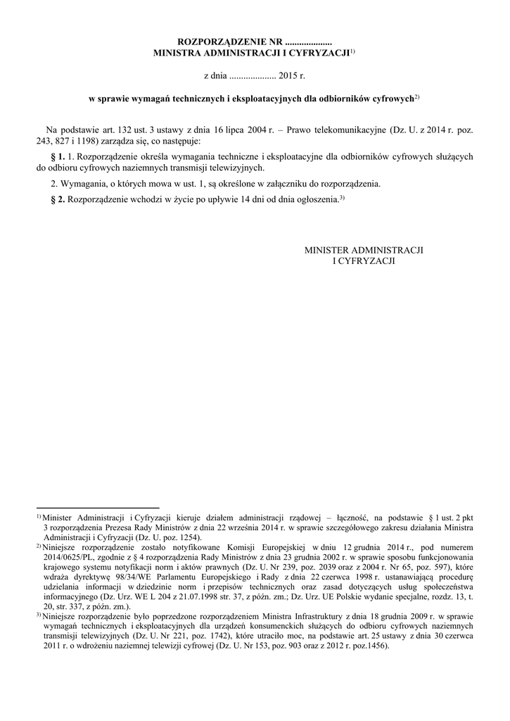 ROZPORZĄDZENIE NR .................... MINISTRA ADMINISTRACJI I CYFRYZACJI1) z dnia .................... 2015 r. w sprawie wymagań technicznych i eksploatacyjnych dla odbiorników cyfrowych2) Na podstawie art. 132 ust. 3 ustawy z dnia 16 lipca 2004 r. – Prawo telekomunikacyjne (Dz. U. z 2014 r. poz. 243, 827 i 1198) zarządza się, co następuje: § 1. 1. Rozporządzenie określa wymagania techniczne i eksploatacyjne dla odbiorników cyfrowych służących do odbioru cyfrowych naziemnych transmisji telewizyjnych. 2. Wymagania, o których mowa w ust. 1, są określone w załączniku do rozporządzenia. § 2. Rozporządzenie wchodzi w życie po upływie 14 dni od dnia ogłoszenia.3) MINISTER ADMINISTRACJI I CYFRYZACJI 1) Minister Administracji i Cyfryzacji kieruje działem administracji rządowej – łączność, na podstawie § 1 ust. 2 pkt 3 rozporządzenia Prezesa Rady Ministrów z dnia 22 września 2014 r. w sprawie szczegółowego zakresu działania Ministra Administracji i Cyfryzacji (Dz. U. poz. 1254). 2) Niniejsze rozporządzenie zostało notyfikowane Komisji Europejskiej w dniu 12 grudnia 2014 r., pod numerem 2014/0625/PL, zgodnie z § 4 rozporządzenia Rady Ministrów z dnia 23 grudnia 2002 r. w sprawie sposobu funkcjonowania krajowego systemu notyfikacji norm i aktów prawnych (Dz. U. Nr 239, poz. 2039 oraz z 2004 r. Nr 65, poz. 597), które wdraża dyrektywę 98/34/WE Parlamentu Europejskiego i Rady z dnia 22 czerwca 1998 r. ustanawiającą procedurę udzielania informacji w dziedzinie norm i przepisów technicznych oraz zasad dotyczących usług społeczeństwa informacyjnego (Dz. Urz. WE L 204 z 21.07.1998 str. 37, z późn. zm.; Dz. Urz. UE Polskie wydanie specjalne, rozdz. 13, t. 20, str. 337, z późn. zm.). 3) Niniejsze rozporządzenie było poprzedzone rozporządzeniem Ministra Infrastruktury z dnia 18 grudnia 2009 r. w sprawie wymagań technicznych i eksploatacyjnych dla urządzeń konsumenckich służących do odbioru cyfrowych naziemnych transmisji telewizyjnych (Dz. U. Nr 221, poz. 1742), które utraciło moc, na podstawie art. 25 ustawy z dnia 30 czerwca 2011 r. o wdrożeniu naziemnej telewizji cyfrowej (Dz. U. Nr 153, poz. 903 oraz z 2012 r. poz.1456). Załącznik do rozporządzenia Ministra Administracji i Cyfryzacji z dnia (poz. ) WYMAGANIA TECHNICZNE I EKSPLOATACYJNE DLA ODBIORNIKÓW CYFROWYCH SŁUŻĄCYCH DO ODBIORU CYFROWYCH NAZIEMNYCH TRANSMISJI TELEWIZYJNYCH 1.Postanowienia ogólne Załącznik określa wymagania techniczne i eksploatacyjne, których spełnienie jest niezbędne do poprawnego odbioru przez odbiorniki cyfrowe sygnałów dostarczanych drogą rozsiewczą naziemną w oparciu o system DVB-T, wykorzystujący strumień transportowy MPEG-2 do dostarczania treści audiowizualnych oraz innych danych i usług dodatkowych. Jako podstawowe przyjęto parametry odbiornika telewizji cyfrowej zdefiniowanego w ETSI TS 101 154 [7] jako „25 Hz H.264/AVC HDTV video, MPEG-2 Layer 2 and E-AC-3 audio, for a Baseline IRD able to decode up to 1920 x 1080 interlaced 25 Hz video pictures or 1280 x 720 progressive 50 Hz video pictures”. Spełnienie wymagań określonych w załączniku nie wyklucza rozbudowy odbiornika cyfrowego o inne funkcje podnoszące jego walory funkcjonalne lub użytkowe. Parametry techniczne oznaczone zwrotem „o ile występuje” nie są obowiązkowe do stosowania, ale jeżeli występują, to spełniają podane wymagania. 2.Polskie Normy i dokumenty powołane: 2.1. Wykaz Polskich Norm i dokumentów powoływanych w załączniku: [1] ETSI EN 300 468 V1.14.1 Digital Video Broadcasting (DVB); Specification for Service Information (SI) in DVB systems (Specyfikacja informacji o usługach (SI) w systemach DVB) [2] ETSI EN 300 743 V1.5.1 Telewizja cyfrowa (DVB) – Wymagania techniczne dotyczące przenoszenia teletekstu systemu B ITU-R w strumieniach bitowych DVB [3] ETSI EN 300 706 V1.2.1 Enhanced Teletext specification (Wymagania na wzbogacony teletekst) [4] ETSI EN 300 743 V1.3.1 Digital Video Broadcasting (DVB); Subtitling systems (Systemy podpisów DVB) [5] ETSI EN 300 744 V1.6.1 Digital Video Broadcasting (DVB); Framing structure, channel coding and modulation for digital terrestrial television (Telewizja cyfrowa (DVB) - Struktura ramkowania, kodowanie kanałowe i modulacja dla naziemnej telewizji cyfrowej) [6] ETSI TS 100 289 V1.1.1 Digital Video Broadcasting (DVB); Support for use of the DVB Scrambling Algorithm version 3 within digital broadcasting systems [7] ETSI TS 101 154 V1.11.1 Digital Video Broadcasting (DVB); Specification for the use of Video and Audio Coding in Broadcasting Applications based on the MPEG-2 Transport Stream (Specyfikacja procesu kodowania wizji i fonii w aplikacjach telewizyjnych w oparciu o strumień transportowy MPEG-2) [8] ETSI TS 102 006 V1.3.2 Digital Video Broadcasting (DVB); Specification for system software update in the DVB systems (Specyfikacja systemu aktualizacji oprogramowania w systemach DVB) [9] ETSI TS 102 366 V1.2.1 Digital Audio Compression (AC-3, Enhanced AC-3) Standard (Standard cyfrowej kompresji fonii (AC-3, Enhanced AC-3)) [10] PN-ISO/IEC 8859-2 Technika informatyczna – Zestawy znaków graficznych w jednobajtowym kodzie 8-bitowym – Alfabet łaciński nr 2 [11] ISO/IEC 13818-3:1998 Information technology – Generic coding of moving picture and associated audio information; Part 3: Audio (Technika informatyczna – Ogólne zasady kodowania obrazów ruchomych i towarzyszącej im informacji dźwiękowej; Część 3: Dźwięk) [12] PN-EN 50049-1:2003 Wymagania dotyczące połączeń wzajemnych elektronicznego sprzętu powszechnego użytku: Złącze peritelevision [13] PN-EN 50157-2-1 Wymagania dotyczące połączeń elektronicznych urządzeń powszechnego użytku: łącze AV.link – Część 2-1: Uzgadnianie jakości sygnału i automatyczny wybór urządzeń źródłowych [14] PN-EN 50160 Parametry napięcia w sieciach rozdzielczych [15] PN-IEC 60038 Napięcia znormalizowane IEC [16] PN-E