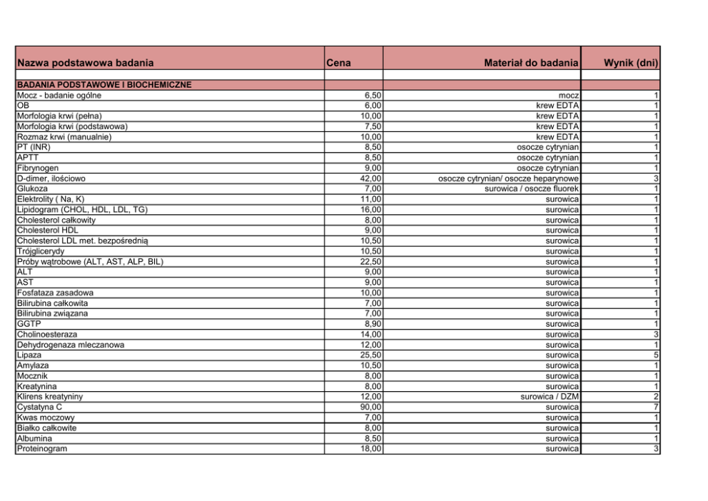 Nazwa podstawowa badania BADANIA PODSTAWOWE I BIOCHEMICZNE Mocz - badanie ogólne OB Morfologia krwi (pełna) Morfologia krwi (podstawowa) Rozmaz krwi (manualnie) PT (INR) APTT Fibrynogen D-dimer, ilościowo Glukoza Elektrolity ( Na, K) Lipidogram (CHOL, HDL, LDL, TG) Cholesterol całkowity Cholesterol HDL Cholesterol LDL met. bezpośrednią Trójglicerydy Próby wątrobowe (ALT, AST, ALP, BIL) ALT AST Fosfataza zasadowa Bilirubina całkowita Bilirubina związana GGTP Cholinoesteraza Dehydrogenaza mleczanowa Lipaza Amylaza Mocznik Kreatynina Klirens kreatyniny Cystatyna C Kwas moczowy Białko całkowite Albumina Proteinogram Materiał do badania podwykonawca Wynik (dni) Cena 6,50 6,00 10,00 7,50 10,00 8,50 8,50 9,00 42,00 7,00 11,00 16,00 8,00 9,00 10,50 10,50 22,50 9,00 9,00 10,00 7,00 7,00 8,90 14,00 12,00 25,50 10,50 8,00 8,00 12,00 90,00 7,00 8,00 8,50 18,00 mocz krew EDTA krew EDTA krew EDTA krew EDTA osocze cytrynian osocze cytrynian osocze cytrynian osocze cytrynian/ osocze heparynowe surowica / osocze fluorek surowica surowica surowica surowica surowica surowica surowica surowica surowica surowica surowica surowica surowica surowica surowica surowica surowica surowica surowica surowica / DZM surowica CZMP surowica surowica surowica MSWiA surowica 1 1 1 1 1 1 1 1 3 1 1 1 1 1 1 1 1 1 1 1 1 1 1 3 1 5 1 1 1 2 7 1 1 1 3 Żelazo Ferrytyna Wapń całkowity Wapń zjonizowany Chlorki Fosfor nieorganiczny Magnez BADANIA KAŁU Kał - badanie ogólne Kał - resztki pokarmowe Kał - pasożyty (1 ozn.) Owsiki (wymaz parazytologiczny) Kał - G. lamblia met. ELISA Kał - krew utajona (bez diety) Kał - krew utajona (z zachowaniem diety) Helicobacter pylori - antygen w kale MARKERY ODCZYNÓW ZAPALNYCH I CHORÓB REUMATOLOGICZNYCH CRP, ilościowo ASO, ilościowo RF, ilościowo Odczyn Waalera-Rosego anty-CCP DIAGNOSTYKA CHOROBY WIEŃCOWEJ I CHORÓB SERCA CK CK-MB mass Troponina T Mioglobina Homocysteina HEMATOLOGIA Retikulocyty Płytki krwi (manualnie) SEROLOGIA Grupa krwi Grupa krwi z kartą identyfikacyjną (2 ozn.) Grupa krwi z kartą identyfikacyjną (1 ozn.) P/c. odpornościowe (dawniej t. Coombsa) DIAGNOSTYKA CHORÓB TARCZYCY TSH FT4 9,00 26,00 8,00 11,00 14,00 8,00 8,00 surowica surowica surowica krew heparyna litowa surowica surowica surowica 1 10 1 3 2 1 1 15,00 15,00 9,00 9,00 22,00 19,00 8,00 26,00 kał kał kał kał kał kał kał kał 3 3 1 1 5 1 1 1 9,50 9,50 9,00 9,50 65,00 surowica surowica surowica surowica surowica 1 1 1 1 21 9,50 18,50 50,00 29,50 35,00 surowica surowica surowica surowica surowica 1 3 3 14 3 11,00 9,00 krew EDTA krew polokaina 1 1 45,00 90,00 55,00 45,00 krew żylna krew żylna krew żylna krew żylna 4 7 7 4 15,50 15,50 surowica surowica 1 1 FT3 T4 T3 anty-TPO anty-TG P/c. p. receptorom TSH Tyreoglobulina HORMONY PŁCIOWE I INNE BADANIA GINEKOLOGICZNE FSH LH Estradiol Progesteron Prolaktyna Test ciążowy HCG HCG wolna podjednostka beta Estriol wolny PAPP-A DHEA S04 DHEA Androstendion Testosteron Testosteron wolny SHBG 17-hydroksyprogesteron Oksytocynaza Izooksytocynaza PRISCA 4 – ocena ryzyka genetycznych wad płodu I trymestr PRISCA 4 – ocena ryzyka genetycznych wad płodu II trymestr DIAGNOSTYKA ANEMII Transferyna Witamina B12 Kwas foliowy Erytropoetyna TIBC UIBC DIAGNOSTYKA CUKRZYCY Hemoglobina glikowana met. HPLC Hemoglobina glikowana met. immunoturb. 15,50 15,50 15,50 30,00 30,00 42,00 32,00 18,50 18,50 19,50 19,50 19,50 12,00 25,00 36,00 24,00 33,00 25,00 30,00 34,00 21,00 47,00 28,00 33,00 21,00 35,00 130,00 160,00 surowica surowica surowica surowica surowica surowica surowica surowica surowica surowica surowica surowica mocz surowica surowica surowica surowica surowica surowica surowica surowica surowica IZO-MED. surowica surowica surowica SzU surowica SzU surowica surowica 1 2 2 1 3 14 14 1 1 1 1 1 1 1 3 3 3 3 7 10 1 6 3 10 do 6 do 6 14 14 38,00 24,00 24,00 24,00 11,00 11,00 surowica surowica surowica surowica surowica surowica 10 7 7 7 1 1 24,00 22,00 krew EDTA krew EDTA 6 1 Insulina C-peptyd P/c. p. dekarboksylazie kw. Glutaminowego (anty-GAD) P/c. p. fosfatazie tyrozynowej (IA2) DIAGNOSTYKA OSTEOPOROZY I ZABURZEŃ KOSTNYCH Parathormon (intact) Kalcytonina Osteokalcyna Fosfataza kwaśna całkowita Fosfataza zasadowa izoenzym kostny C-telopeptyd kolagenu typu I Pyrylinks D w moczu Witamina D metabolit 25(OH) (ICD-9: 091) INNE HORMONY I METABOLITY ACTH Kortyzol Kortyzol w DZM 17-hydroksykortykosteroidy w DZM 17-ketosterydy w DZM Aldosteron Katecholaminy (A, NA, D) w DZM Kwas 5-hydroksyindolooctowy w DZM Kwas wanilinomigdałowy w DZM Hormon wzrostu IGF-1 Gastryna Leptyna DIAGNOSTYKA CHORÓB NOWOTWOROWYCH PSA całkowity PSA wolny Fosfataza kwaśna sterczowa CEA AFP CA 125 CA 15-3 CA 19-9 TPS Beta-2-mikroglobulina Beta-2-mikroglobulina w moczu 28,00 28,00 65,00 55,00 surowica surowica IZO-MED. surowica WCM surowica WCM 3 3 15 15 29,00 44,00 46,00 8,00 26,00 53,00 53,00 45,00 surowica surowica krew pełna heparyna surowica surowica surowica mocz surowica 7 7 7 3 7 10 3 20 37,00 35,00 54,00 92,00 64,00 50,00 160,00 54,00 47,00 37,00 54,00 70,00 54,00 oscze EDTA surowica DZM DZM DZM surowica DZM + HCl DZM+ kwac octowy + toluen DZM +HCl surowica surowica surowica surowica 3 3 14 14 14 14 14 14 14 3 3 7 30 25,00 26,00 16,00 26,00 26,00 29,00 29,00 29,00 85,00 45,00 45,00 surowica surowica surowica surowica surowica surowica surowica surowica surowica surowica mocz USzD Synevo Synevo IMiD SzK nr 5 SzK nr 5 1 3 3 1 3 1 3 1 7 14 14 BRCA 1 met. PCR HTGR met. PCR UKŁAD KRZEPNIĘCIA Czas krwawienia i krzepnięcia Antytrombina III, aktywność Białko C, aktywność Białko S wolne Czynnik V Leiden ( met.PCR) Mutacja 20210 G-A genu protrombiny ( met. PCR) Termolabilny wariant MTHFR ( met PCR) IMMUNOGLOBULINY, SKŁADNIKI DOPEŁNIACZA I INNE ENZYMY Immunoglobuliny IgG, IgM, IgA IgG IgM IgA Dopełniacz, składowa C-3c Dopełniacz, składowa C-4 Alfa-1-antytrypsyna Ceruloplazmina BADANIA Z MOCZU Białko w DZM Wapń w DZM Fosfor w DZM Mocznik w DZM Kreatynina w DZM K