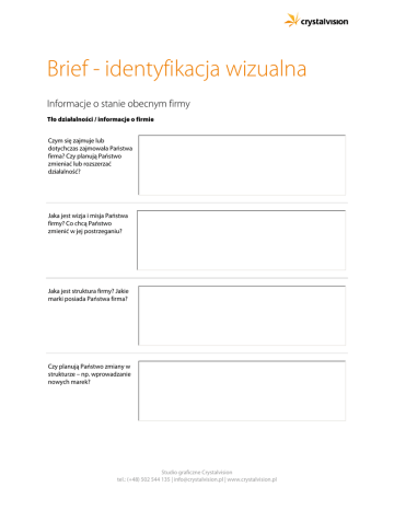 Brief - identyfikacja wizualna Informacje o stanie obecnym firmy Tło działalności / informacje o firmie Czym się zajmuje lub dotychczas zajmowała Państwa firma? Czy planują Państwo zmieniać lub rozszerzać działalność? Jaka jest wizja i misja Państwa firmy? Co chcą Państwo zmienić w jej postrzeganiu? Jaka jest struktura firmy? Jakie marki posiada Państwa firma? Czy planują Państwo zmiany w strukturze – np. wprowadzanie nowych marek? Studio graficzne Crystalvision tel.: (+48) 502 544 135 | [email protected] | www.crystalvision.pl Specyfika działalności Jaki produkt/usługę Państwo oferują? Jak długi jest cykl jego życia? Jaka jest jego cena? Jakimi kanałami docierają Państwo do klientów? Czy planują Państwo zmianę lub otworzenie nowych kanałów docierania do klientów? Kim są odbiorcy/konsumenci Państwa produktów lub usług? Czy chcą lub planują Państwo zmienić grupę docelową konsumentów? Jacy są główni konkurenci firmy? Co odróżnia firmę od konkurencji? Studio graficzne Crystalvision tel.: (+48) 502 544 135 | [email protected] | www.crystalvision.pl Wizerunek - stan obecny Jak oceniają Państwo obecny wizerunek własnej firmy? W jaki sposób postrzegają Państwa firmę klienci? Czy podejmowali już Państwo działania wizerunkowe? Jeśli tak – to z jakim skutkiem? Cele Dlaczego planują Państwo wdrożenie identyfikacji wizualnej? Jaki cel zamierzają Państwo przez to osiągnąć? Jakie są długo- i krótkoterminowe cele Państwa firmy? W jaki sposób – Państwa zdaniem – firma powinna być postrzegana przez klientów/ konsumentów? Studio graficzne Crystalvision tel.: (+48) 502 544 135 | [email protected] | www.crystalvision.pl Informacje szczegółowe W jakim terminie planują Państwo przeprowadzić wdrożenie identyfikacji wizualnej? Jaki budżet przewidują Państwo na realizację projektu? Jakie elementy identyfikacji / komunikacji wizualnej wykorzystywali Państwo dotychczas? Jakie elementy są wg Państwa potrzebna do działania firmy? (np.: logo, papeteria, projekty opakowań) þÿ�w�y�[�l�i�j� �f�o�r�m�u�l�a�r�z� þÿ�d�r�u�k�u�j� �e�-�m�a�i�l�e�m �f�o�r�m�u�l�a� Studio graficzne Crystalvision tel.: (+48) 502 544 135 | [email protected] | www.crystalvision.pl