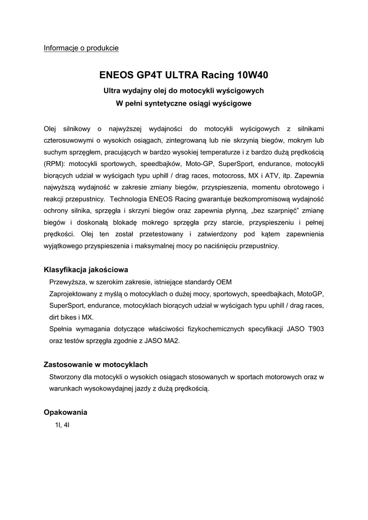 Informacje o produkcie ENEOS GP4T ULTRA Racing 10W40 Ultra wydajny olej do motocykli wyścigowych W pełni syntetyczne osiągi wyścigowe Olej silnikowy o najwyższej wydajności do motocykli wyścigowych z silnikami czterosuwowymi o wysokich osiągach, zintegrowaną lub nie skrzynią biegów, mokrym lub suchym sprzęgłem, pracujących w bardzo wysokiej temperaturze i z bardzo dużą prędkością (RPM): motocykli sportowych, speedbajków, Moto-GP, SuperSport, endurance, motocykli biorących udział w wyścigach typu uphill / drag races, motocross, MX i ATV, itp. Zapewnia najwyższą wydajność w zakresie zmiany biegów, przyspieszenia, momentu obrotowego i reakcji przepustnicy. Technologia ENEOS Racing gwarantuje bezkompromisową wydajność ochrony silnika, sprzęgła i skrzyni biegów oraz zapewnia płynną, „bez szarpnięć” zmianę biegów i doskonałą blokadę mokrego sprzęgła przy starcie, przyspieszeniu i pełnej prędkości. Olej ten został przetestowany i zatwierdzony pod kątem zapewnienia wyjątkowego przyspieszenia i maksymalnej mocy po naciśnięciu przepustnicy. Klasyfikacja jakościowa Przewyższa, w szerokim zakresie, istniejące standardy OEM Zaprojektowany z myślą o motocyklach o dużej mocy, sportowych, speedbajkach, MotoGP, SuperSport, endurance, motocyklach biorących udział w wyścigach typu uphill / drag races, dirt bikes i MX. Spełnia wymagania dotyczące właściwości fizykochemicznych specyfikacji JASO T903 oraz testów sprzęgła zgodnie z JASO MA2. Zastosowanie w motocyklach Stworzony dla motocykli o wysokich osiągach stosowanych w sportach motorowych oraz w warunkach wysokowydajnej jazdy z dużą prędkością. Opakowania 1l, 4l Typowe właściwości Klasa lepkości SAE 10W-40 Gęstość (15oC), g/cm3 0,852 Temperatura zapłonu (COC), oC 236 Lepkość kinematyczna (40 C), mm /s 86,84 (100oC), mm2/s 14,02 o 2 Wskaźnik lepkości 167 Temperatura płynięcia, oC -40,0 Całkowita Liczba Zasadowa – TBN 6,27 (HClO4), mg KOH/g Wygląd Bezbarwny Uwaga: Typowe właściwości mogą ulec zmianie bez uprzedzenia (Grudzień 2015)