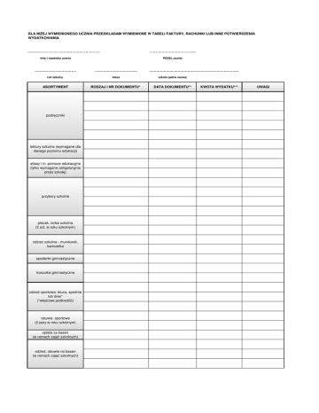 DLA NIŻEJ WYMIENIONEGO UCZNIA PRZEDKŁADAM WYMIENIONE W TABELI FAKTURY, RACHUNKI LUB INNE POTWIERDZENIA WYDATKOWANIA ………………………………………….…………………… ……………………………….. imię i nazwisko ucznia PESEL ucznia ……………………………. …………………………….. ……………………………………………..…..…………………………………………… rok szkolny klasa szkoła (pełna nazwa) ASORTYMENT RODZAJ I NR DOKUMENTU* DATA DOKUMENTU** podręczniki lektury szkolne (wymagane dla danego poziomu edukacji) atlasy i in. pomoce edukacyjne (tylko wymagane obligatoryjnie przez szkołę) przybory szkolne plecak, torba szkolna (2 szt. w roku szkolnym) odzież szkolna - mundurek, kamizelka spodenki gimnastyczne koszulka gimnastyczna odzież sportowa: bluza, spodnie lub dres* (*właściwe podkreślić) obuwie sportowe (2 pary w roku szkolnym) opłata za basen (w ramach zajęć szkolnych) odzież, obuwie na basen (w ramach zajęć szkolnych) KWOTA WYDATKU*** UWAGI sprzęt sportowy (wyłącznie dla uczniów szkół sportowych) instrument muzyczny odzież na akademie szkolne, tj. koszula wizytowa i spodnie wizytowe lub bluzka wizytowa i spódnica wizytowa obuwie wizytowe na akademie szkolne (1 para) wycieczki i wyjścia szkolne zielona lub biała szkoła opłata za pozaszkolne zajęcia edukacyjne opłata za zajęcia terapeutyczne zalecone przez poradnię pedagogiczną odzież i obuwie ochronne (w przypadku ZSZ) opłata za bilety, zakwaterowanie w bursie lub internacie (wyłącznie dla uczniów szkół ponadgimnazjalnych uczących się poza miejscem zamieszkania) inne ………………………. RAZEM**** ……………………………………. imię i nazwisko wnioskodawcy …………………………………………………………………………………. ……………………………………. PESEL wnioskodawcy * należy wpisać rodzaj przestawianego dokumentu, np. faktura, rachunek, umowa kupna-sprzedaży ** należy wpisać datę sprzedaży z przedstawianego dokumentu *** należy wpisać kwotę brutto dotyczącą danego asortymentu **** należy zsumować pozycje data , czytelny podpis wnioskodawcy
