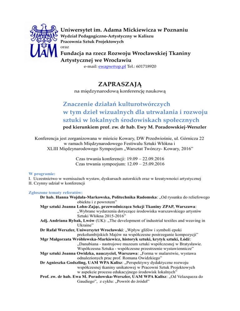 Uniwersytet im. Adama Mickiewicza w Poznaniu Wydział Pedagogiczno-Artystyczny w Kaliszu Pracownia Sztuk Projektowych oraz Fundacja na rzecz Rozwoju Wrocławskiej Tkaniny Artystycznej we Wrocławiu e-mail: [email protected] Tel.: 601718920 ZAPRASZAJĄ na międzynarodową konferencję naukową Znaczenie działań kulturotwórczych w tym dzieł wizualnych dla utrwalania i rozwoju sztuki w lokalnych środowiskach społecznych pod kierunkiem prof. zw. dr hab. Ewy M. Poradowskiej-Werszler Konferencja jest zorganizowana w mieście Kowary, DW Przedwiośnie, ul. Górnicza 22 w ramach Międzynarodowego Festiwalu Sztuki Włókna i XLIII Międzynarodowego Sympozjum „Warsztat Twórczy- Kowary, 2016” Czas trwania konferencji: 19.09 – 22.09.2016 Czas trwania sympozjum: 12.09 – 25.09.2016 W programie: I. Uczestnictwo w wernisażach wystaw, dyskursach autorskich oraz w kreatywności artystycznej II. Czynny udział w konferencji Zgłoszone tematy referatów: Dr hab. Hanna Wojdała-Markowska, Politechnika Radomska: „Od rysunku do reliefowego obiektu i z powrotem” Mgr sztuki Joanna Lohn-Zając, przewodnicząca Sekcji Tkaniny ZPAP, Warszawa: „Wybrane wydarzenia dotyczące środowiska warszawskiego artystów Sztuki Włókna 2015-2016” Adj. Andriana Rybak, Lwów (UK): „The development of industrial textiles and weaving in Ukraine” Dr Rafał Werszler, Uniwersytet Wrocławski: „Wpływ glifów i symboli epoki prekolumbijskich Majów na współczesne postrzeganie kompozycji” Mgr Małgorzata Wróblewska-Markiewicz, historyk sztuki, krytyk sztuki, Łódź: „Danubiana - nastrojowe muzeum sztuki współczesnej w Bratysławie. Współczesna Sztuka - współczesne przestrzenie wystawiennicze” Mgr sztuki Joanna Owidzka, nauczyciel, Warszawa: „Forma w malarstwie, wystawa odnalezionych prac prof. Romana Owidzkiego” Dr Agnieszka Godszling, UAM WPA Kalisz: „Perspektywy dydaktyczne rozwoju współczesnej tkaniny unikatowej w Pracowni Sztuk Projektowych w aspekcie procesu edukacyjnego środowisk lokalnych” Prof. zw. dr hab. Ewa M. Poradowska-Werszler, UAM WPA Kalisz: „Od Velazqueza do Gaudiego”, z cyklu: „Powrót do źródeł”