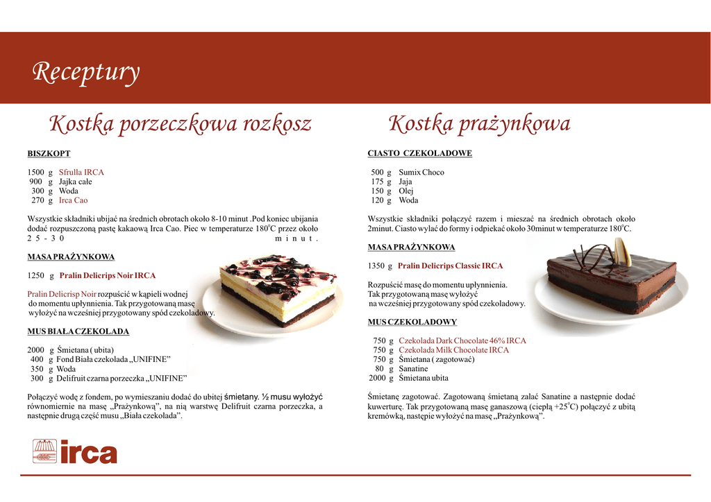 Receptury Kostka prażynkowa Kostka porzeczkowa rozkosz BISZKOPT 1500 900 300 270 g g g g Sfrulla IRCA Jajka całe Woda Irca Cao Wszystkie składniki ubijać na średnich obrotach około 8-10 minut .Pod koniec ubijania dodać rozpuszczoną pastę kakaową Irca Cao. Piec w temperaturze 1800C przez około m i n u t . 2 5 - 3 0 CIASTO CZEKOLADOWE 500 175 150 120 g g g g Sumix Choco Jaja Olej Woda Wszystkie składniki połączyć razem i mieszać na średnich obrotach około 2minut. Ciasto wylać do formy i odpiekać około 30minut w temperaturze 1800C. MASA PRAŻYNKOWA MASA PRAŻYNKOWA 1350 g Pralin Delicrips Classic IRCA 1250 g Pralin Delicrips Noir IRCA Pralin Delicrisp Noir rozpuścić w kąpieli wodnej do momentu upłynnienia. Tak przygotowaną masę wyłożyć na wcześniej przygotowany spód czekoladowy. Rozpuścić masę do momentu upłynnienia. Tak przygotowaną masę wyłożyć na wcześniej przygotowany spód czekoladowy. MUS CZEKOLADOWY MUS BIAŁA CZEKOLADA 2000 400 350 300 g Śmietana ( ubita) g Fond Biała czekolada „UNIFINE” g Woda g Delifruit czarna porzeczka „UNIFINE” Połączyć wodę z fondem, po wymieszaniu dodać do ubitej śmietany. ½ musu wyłożyć równomiernie na masę „Prażynkową”, na nią warstwę Delifruit czarna porzeczka, a następnie drugą część musu „Biała czekolada”. 750 750 750 80 2000 g g g g g Czekolada Dark Chocolate 46% IRCA Czekolada Milk Chocolate IRCA Śmietana ( zagotować) Sanatine Śmietana ubita Śmietanę zagotować. Zagotowaną śmietaną zalać Sanatine a następnie dodać kuwerturę. Tak przygotowaną masę ganaszową (ciepłą +250C) połączyć z ubitą kremówką, następie wyłożyć na masę „Prażynkową”.