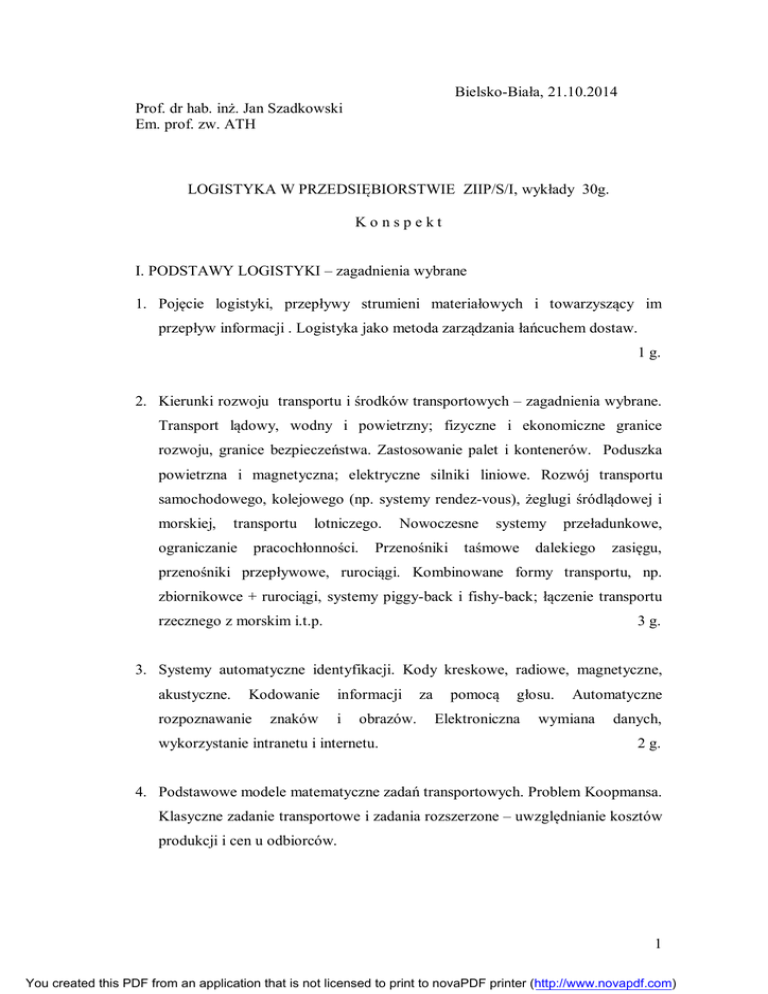 1 Bielsko-Biała, 21.10.2014 Prof. dr hab. inż. Jan Szadkowski