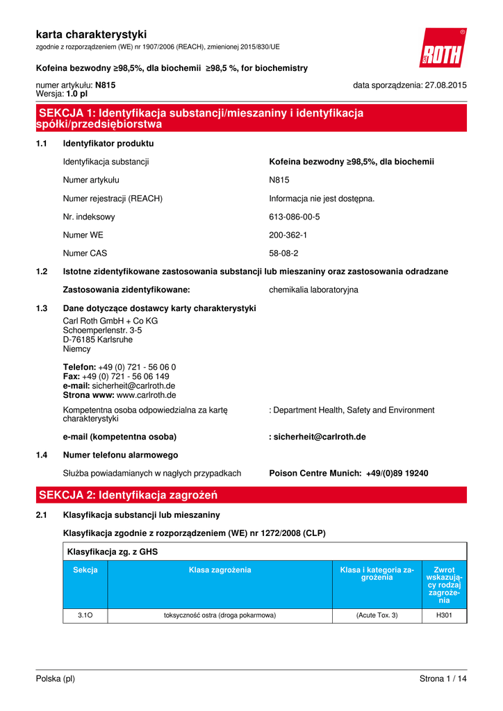 karta charakterystyki zgodnie z rozporządzeniem (WE) nr 1907/2006 (REACH), zmienionej 2015/830/UE Kofeina bezwodny ≥98,5%, dla biochemii ≥98,5 %, for biochemistry numer artykułu: N815 Wersja: 1.0 pl data sporządzenia: 27.08.2015 SEKCJA 1: Identyfikacja substancji/mieszaniny i identyfikacja spółki/przedsiębiorstwa 1.1 1.2 Identyfikator produktu Identyfikacja substancji Kofeina bezwodny ≥98,5%, dla biochemii Numer artykułu N815 Numer rejestracji (REACH) Informacja nie jest dostępna. Nr. indeksowy 613-086-00-5 Numer WE 200-362-1 Numer CAS 58-08-2 Istotne zidentyfikowane zastosowania substancji lub mieszaniny oraz zastosowania odradzane Zastosowania zidentyfikowane: 1.3 chemikalia laboratoryjna Dane dotyczące dostawcy karty charakterystyki Carl Roth GmbH + Co KG Schoemperlenstr. 3-5 D-76185 Karlsruhe Niemcy Telefon: +49 (0) 721 - 56 06 0 Fax: +49 (0) 721 - 56 06 149 e-mail: [email protected] Strona www: www.carlroth.de 1.4 Kompetentna osoba odpowiedzialna za kartę charakterystyki : Department Health, Safety and Environment e-mail (kompetentna osoba) : [email protected] Numer telefonu alarmowego Służba powiadamianych w nagłych przypadkach Poison Centre Munich: +49/(0)89 19240 SEKCJA 2: Identyfikacja zagrożeń 2.1 Klasyfikacja substancji lub mieszaniny Klasyfikacja zgodnie z rozporządzeniem (WE) nr 1272/2008 (CLP) Klasyfikacja zg. z GHS Sekcja Klasa zagrożenia Klasa i kategoria zagrożenia Zwrot wskazujący rodzaj zagrożenia 3.1O toksyczność ostra (droga pokarmowa) (Acute Tox. 3) H301 Polska (pl) Strona 1 / 14 karta charakterystyki zgodnie z rozporządzeniem (WE) nr 1907/2006 (REACH), zmienionej 2015/830/UE Kofeina bezwodny ≥98,5%, dla biochemii ≥98,5 %, for biochemistry numer artykułu: N815 2.2 Elementy oznakowania Oznakowania zgodnie z rozporządzeniem (WE) nr 1272/2008 (CLP) Hasło ostrzegawcze Niebezpieczeństwo Piktogramy Zwroty wskazujące rodzaj zagrożenia H301 Działa toksycznie po połknięciu. Zwroty wskazujące środki ostrożności Zwroty wskazujące środki ostrożności - zapobieganie P264 P270 Dokładnie umyć po użyciu. Nie jeść, nie pić i nie palić podczas używania produktu. Zwroty wskazujące środki ostrożności - reagowanie P301+P310 W PRZYPADKU POŁKNIĘCIA: natychmiast skontaktować się z OŚRODKIEM ZATRUĆ lub z lekarzem. Zwroty wskazujące środki ostrożności - przechowywanie P405 Przechowywać pod zamknięciem. Oznakowanie opakowań, których zawartość nie przekracza 125 ml Hasło ostrzegawcze: Niebezpieczeństwo Symbol(-e) 2.3 H301 Działa toksycznie po połknięciu. P260 P270 P301+P310 P405 Nie wdychać pyłu/dymu/gazu/mgły/par/rozpylonej cieczy. Nie jeść, nie pić i nie palić podczas używania produktu. W PRZYPADKU POŁKNIĘCIA: natychmiast skontaktować się z OŚRODKIEM ZATRUĆ lub z lekarzem. Przechowywać pod zamknięciem. Inne zagrożenia Nie ma dodatkowych informacji. Polska (pl) Strona 2 / 14 karta charakterystyki zgodnie z rozporządzeniem (WE) nr 1907/2006 (REACH), zmienionej 2015/830/UE Kofeina bezwodny ≥98,5%, dla biochemii ≥98,5 %, for biochemistry numer artykułu: N815 SEKCJA 3: Skład/informacja o składnikach 3.1 Substancje Nazwa substancji Kofeina bezwodny ≥98,5%, dla biochemii Nr. indeksowy 613-086-00-5 Numer WE 200-362-1 Numer CAS 58-08-2 Wzór cząsteczkowy C₈H₁₀N₄O₂ Masa cząsteczkowa 194,2 g/mol SEKCJA 4: Środki pierwszej pomocy 4.1 Opis środków pierwszej pomocy Uwagi ogólne Zdjąć zanieczyszczoną odzież. Po narażeniu przez drogi oddechowe Zapewnić dostęp do świeżego powietrza. Zasięgnąć porady lekarza w przypadku pojawienia się jakichkolwiek wątpliwości, lub jeżeli objawy nie ustępują. Po kontakcie ze skórą Spłukać skórę pod strumieniem wody/prysznicem. Należy udać się do dermatologa. Po kontakcie z oczami Ostrożnie płukać wodą przez kilka minut. Zasięgnąć porady lekarza w przypadku pojawienia się jakichkolwiek wątpliwości, lub jeżeli objawy nie ustępują. Po narażeniu przez przewód pokarmowy Natychmiast wypłukać usta i wypić dużą ilość wody. Natychmiast wezwać lekarza. 4.2 Najważniejsze ostre i opóźnione objawy oraz skutki narażenia Pobudzenie, Zawroty głowy, Ból głowy, Wymioty, Biegunka, Omdlenie, Nieświadomość 4.3 Wskazania dotyczące wszelkiej natychmiastowej pomocy lekarskiej i szczególnego postępowania z poszkodowanym żadne Polska (pl) Strona 3 / 14 karta charakterystyki zgodnie z rozporządzeniem (WE) nr 1907/2006 (REACH), zmienionej 2015/830/UE Kofeina bezwodny ≥98,5%, dla biochemii ≥98,5 %, for biochemistry numer artykułu: N815 SEKCJA 5: Postępowanie w przypadku pożaru 5.1 Środki gaśnicze Odpowiednie środki gaśnicze Środki gaśnicze należy dostosować do otoczenia rozpylona woda, piana, suchy proszek gaśniczy, dwutlenek węgla (CO2) Niewłaściwe środki gaśnicze silny strumień wody 5.2 Szczególne zagrożenia związane z substancją lub mieszaniną Palny. Niebezpieczeństwo wybuchu pyłu. Produkty spalania stwarzające zagrożenie Podczas pożaru mogą powstawać: tlenki azotu (NOx), tlenek węgla (CO), dwutlenek węgla (CO2) 5.3 Informacje dla straży pożarnej Gasić pożar z rozsądnej odległości z zachowaniem zwykłych środków ostrożności. Nosić autonomiczny aparat oddechowy. SEKCJA 6: Postępowanie w przypadku niezamierzonego uwolnienia do środowiska 6.1 Indywidualne środki ostrożności, sprzęt ochronny i procedury w sytuacjach awaryjnych Dla osób nienależących do personelu udzielającego pomocy Nie wdychać pyłu. Zapobiegać kontaktowi ze skórą. Noszenie odpowiedniego sprzętu ochronnego (w tym osobiste wyposażenie ochronne, o których mowa w sekcji 8 karty charakterystyki), aby zapobiec skażeniu skóry, oczu lub odzieży. 6.2 Środki ostrożności w zakresie ochrony środowiska Zapobiegać przedostaniu się do kanalizacji, wód powierzchniowych i gruntowych. 6.3 Metody i materiały zapobiegające rozprzestrzenianiu się skażenia i służące do usuwania skażenia Por