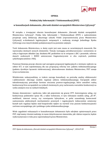 OPINIA Polskiej Izby Informatyki i Telekomunikacji [PIIT] w konsultacjach dokumentu „Kierunki działań europejskich Ministerstwa Cyfryzacji” W związku z trwającymi obecnie konsultacjami dokumentu „Kierunki działań europejskich Ministerstwa Cyfryzacji”, Polska Izba Informatyki i Telekomunikacji [PIIT] z zadowoleniem przyjmuje samą deklarację aktywnego udziału Polski (reprezentowanej przez Ministerstwo Cyfryzacji) w działaniach legislacyjnych związanych z realizacją strategii Jednolitego Rynku Cyfrowego oraz innych działań podejmowanych na poziomie unijnym. Treść dokumentu Ministerstwa, w dużej części jest nam znana ze wcześniejszych stanowisk. Nie wprowadza istotnych nowych elementów. Tematy wymagają ustrukturyzowania i zestawienia ze sobą w logicznym układzie (np. działania MC podzielone na te związane z JRC i pozostałe, ochrona danych osobowych i RODO umieszczone fragmentarycznie w obu częściach, podobnie cyberbezpieczeństwo i NIS). Ponieważ Komisja pracuje obecnie nad szeregiem propozycji legislacyjnych o istotnym wpływie na sektor ICT, w tym najistotniejszą dla nas propozycją reformy tzw. pakietu telekomunikacyjnego (pakietu dyrektyw łączności elektronicznej), ukierunkowane działania Ministerstwa, PIIT uznaje wręcz za konieczne. Wielokrotnie wskazywaliśmy, w trakcie szeregu konsultacji, na potrzebę analizy efektowności i adekwatności obecnego modelu regulacji sektora telekomunikacyjnego. Europejski sektor teleinformatyczny potrzebuje bowiem otoczenia prawno-regulacyjnego, które umożliwi realną konkurencję firm europejskich na rynkach światowych, przy zachowaniu warunków konkurencji na rynku unijnym oraz na rynkach lokalnych. Zmiany ekonomiczne i społeczne, takie jak pojawienie się graczy OTT, konwergencja usług, czy konkurencja podmiotów spoza UE, a także techniczne, w tym wdrażanie modelu usług „all IP”, mobilność, internet rzeczy, czy rozwiązania hybrydowe, w pełni uzasadniają konieczność zastosowania adekwatnych mechanizmów prawnych i regulacyjnych. Jednocześnie ostateczny kształt tych regulacji będzie miał bezpośredni wpływ na wartość oraz poziom konkurencyjności zarówno europejskiego, jak i polskiego rynku telekomunikacyjnego. Wiele zagadnień wskazanych w konsultowanym dokumencie było odrębnie opiniowanych przez PIIT, stąd mamy również nadzieję, że nasze dotychczasowe stanowiska, jak i dalsze wsparcie, będzie wykorzystywane w toku prac zapowiadanych przez Ministerstwo. PIIT: Opinia do dokumentu „Kierunki działań europejskich Ministerstwa Cyfryzacji” , 2016.07.28 Strona 1 Naszym zdaniem, pierwszym etapem zwiększenia skuteczności działań Polski na arenie międzynarodowej, powinno być wypracowanie silnej, merytorycznie podbudowanej pozycji negocjacyjnej na poziomie krajowym, przy współudziale przedsiębiorców zrzeszonych m.in. w Polskiej Izbie Informatyki i Telekomunikacji. Odnosząc się szczegółowo do kwestii przedstawionych w konsultowanym dokumencie (uwagi zgodne z kolejnością i układem zagadnień wskazanych przez MC): Ad. Działania MC w zakresie Jednolitego Rynku Cyfrowego Wnioski ustawodawcze w sprawie reformy obecnych ram regulacyjnych łączności elektronicznej Odnosząc się do planowanych kierunków działań MC, w zakresie kolejnej reformy ram regulacyjnych, należy, co do zasady, poprzeć ogólnie sformułowane założenia przyszłych polskich stanowisk, jakie będą prezentowane w toku prac legislacyjnych zaprezentowanych w przedmiotowym dokumencie. Niemniej jednak, w naszej ocenie, pragmatyka unijnego procesu legislacyjnego, wskazuje na konieczność bardziej dogłębnej analizy oraz wypracowania, już na obecnym etapie konkretnych stanowisk odnoszących się do poszczególnych zagadnień ram regulacyjnych. Takie podejście wydaje nam się niezbędne dla skutecznego reprezentowania polskich interesów, w unijnej debacie, charakteryzującej się wysoką dynamiką oraz wielostronnością. Jednocześnie, po nieoficjalnym opublikowaniu, projektu dokumentu pt. „Towards connectivity for European Gigabit society”, w którym przedstawiono założenia przyszłej reformy, możemy już realnie, przewidywać, jaki będzie kształt ogłoszonych projektów legislacyjnych, co sprzyja dostosowaniu strategii konsultacyjnej. Stanowisko Ministerstwa na arenie europejskiej w zakresie ram regulacyjnych łączności elektronicznej powinno zostać oparte na następujących założeniach regulacyjnych: 1) 2) 3) a także: wprowadzenia do regulacji zasady „te same usługi, te same zasady”; zwiększenia nacisku na proporcjonalność stosowanych regulacji; harmonizacji i uproszczenia regulacji dotyczących ochrony konsumentów; zapewnienia lepszego dostępu do treści cyfrowych - zapobieganiu blokowaniu geograficznemu z uwzględnieniem podziału kosztów i odpowiedzialności z tytułu zniesienia blokad, wspieraniu sprzyjających regulacji w zakresie praw autorskich, ochrony treści przed kradzieżą; zapewnienia bezpieczeństwa sieci i danych w całym łańcuchu wartości, a nie tylko w odniesieniu do operatorów infrastrukturalnych (np. dostawcy sprzętu). Strona 2 PIIT: Opinia do dokumentu „Kierunki działań europejskich Ministerstwa Cyfryzacji” , 2016.01.27 1. Te same usługi, te same zasady – usługi cyfrowe vs usługi łączności elektronicznej Ramy prawne powinny mieć zastosowanie do wszystkich „usług cyfrowych”, niezależnie od ich dostawców - w myśl zasady „te same usługi, te same zasady” - w celu zapewnienia większej spójności w zakresie ochrony konsumentów i bezpieczeństwa, jak również ochrony danych osobowych i ochrony prywatności. W tym kontekście, należy odpowiednio zmodyfikować m.in. definicję usługi łączności elektronicznej, która dzisiaj de facto ogranicza krąg podmiotów regulowanych do dostawców usług telekomunikacyjnych, gdyż obecna definicja usługi mówi, że to usługa polegającą całkowicie lub częściowo na 