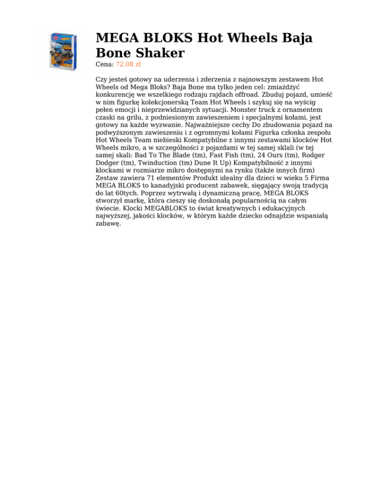MEGA BLOKS Hot Wheels Baja Bone Shaker Cena: 72.08 zł Czy jesteś gotowy na uderzenia i zderzenia z najnowszym zestawem Hot Wheels od Mega Bloks? Baja Bone ma tylko jeden cel: zmiażdżyć konkurencję we wszelkiego rodzaju rajdach offroad. Zbuduj pojazd, umieść w nim figurkę kolekcjonerską Team Hot Wheels i szykuj się na wyścig pełen emocji i nieprzewidzianych sytuacji. Monster truck z ornamentem czaski na grilu, z podniesionym zawieszeniem i specjalnymi kołami, jest gotowy na każde wyzwanie. Najważniejsze cechy Do zbudowania pojazd na podwyższonym zawieszeniu i z ogromnymi kołami Figurka członka zespołu Hot Wheels Team niebieski Kompatybilne z innymi zestawami klocków Hot Wheels mikro, a w szczególności z pojazdami w tej samej sklali (w tej samej skali: Bad To The Blade (tm), Fast Fish (tm), 24 Ours (tm), Rodger Dodger (tm), Twinduction (tm) Dune It Up) Kompatybilność z innymi klockami w rozmiarze mikro dostępnymi na rynku (także innych firm) Zestaw zawiera 71 elementów Produkt idealny dla dzieci w wieku 5 Firma MEGA BLOKS to kanadyjski producent zabawek, sięgający swoją tradycją do lat 60tych. Poprzez wytrwałą i dynamiczną pracę, MEGA BLOKS stworzył markę, która cieszy się doskonałą popularnością na całym świecie. Klocki MEGABLOKS to świat kreatywnych i edukacyjnych najwyższej, jakości klocków, w którym każde dziecko odnajdzie wspaniałą zabawę.