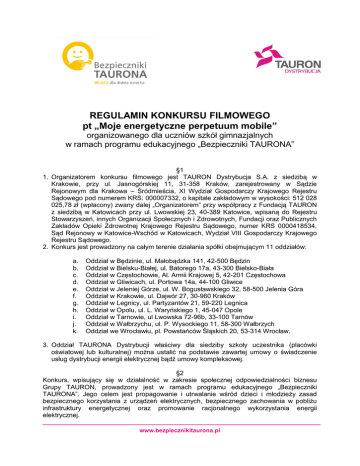 REGULAMIN KONKURSU FILMOWEGO pt „Moje energetyczne perpetuum mobile” organizowanego dla uczniów szkół gimnazjalnych w ramach programu edukacyjnego „Bezpieczniki TAURONA” §1 1. Organizatorem konkursu filmowego jest TAURON Dystrybucja S.A. z siedzibą w Krakowie, przy ul. Jasnogórskiej 11, 31-358 Kraków, zarejestrowany w Sądzie Rejonowym dla Krakowa – Śródmieścia, XI Wydział Gospodarczy Krajowego Rejestru Sądowego pod numerem KRS: 000007332, o kapitale zakładowym w wysokości: 512 028 025,78 zł (wpłacony) zwany dalej „Organizatorem” przy współpracy z Fundacją TAURON z siedzibą w Katowicach przy ul. Lwowskiej 23, 40-389 Katowice, wpisaną do Rejestru Stowarzyszeń, innych Organizacji Społecznych i Zdrowotnych, Fundacji oraz Publicznych Zakładów Opieki Zdrowotnej Krajowego Rejestru Sądowego, numer KRS 0000418534, Sąd Rejonowy w Katowice-Wschód w Katowicach, Wydział VIII Gospodarczy Krajowego Rejestru Sądowego. 2. Konkurs jest prowadzony na całym terenie działania spółki obejmującym 11 oddziałów: a. b. c. d. e. f. g. h. i. j. k. Oddział w Będzinie, ul. Małobądzka 141, 42-500 Będzin Oddział w Bielsku-Białej, ul. Batorego 17a, 43-300 Bielsko-Biała Oddział w Częstochowie, Al. Armii Krajowej 5, 42-201 Częstochowa Oddział w Gliwicach, ul. Portowa 14a, 44-100 Gliwice Oddział w Jeleniej Górze, ul. W. Bogusławskiego 32, 58-500 Jelenia Góra Oddział w Krakowie, ul. Dajwór 27, 30-960 Kraków Oddział w Legnicy, ul. Partyzantów 21, 59-220 Legnica Oddział w Opolu, ul. L. Waryńskiego 1, 45-047 Opole Oddział w Tarnowie, ul Lwowska 72-96b, 33-100 Tarnów Oddział w Wałbrzychu, ul. P. Wysockiego 11, 58-300 Wałbrzych Oddział we Wrocławiu, pl. Powstańców Śląskich 20, 53-314 Wrocław. 3. Oddział TAURONA Dystrybucji właściwy dla siedziby szkoły uczestnika (placówki oświatowej lub kulturalnej) można ustalić na podstawie zawartej umowy o świadczenie usług dystrybucji energii elektrycznej bądź umowy kompleksowej. §2 Konkurs, wpisujący się w działalność w zakresie społecznej odpowiedzialności biznesu Grupy TAURON, prowadzony jest w ramach programu edukacyjnego „Bezpieczniki TAURONA”. Jego celem jest propagowanie i utrwalanie wśród dzieci i młodzieży zasad bezpiecznego korzystania z urządzeń elektrycznych, bezpiecznego zachowania w pobliżu infrastruktury energetycznej oraz promowanie racjonalnego wykorzystania energii elektrycznej. www.bezpiecznikitaurona.pl §3 1. W konkursie mogą brać udział uczniowie szkół gimnazjalnych zlokalizowanych na terenie działania oddziałów spółki TAURON Dystrybucja wymienionych w §1 pkt. 1. 2. Uczniowie przygotowują prace w formie filmu nakręconego za pomocą telefonu komórkowego na temat: „Moje energetyczne perpetuum mobile”. 3. Uczestnikiem konkursu jest klasa. §4 1. Uczestnicy przygotowują samodzielnie prace w formie filmu przedstawiającego historię na temat „Moje energetyczne perpetuum mobile”. 2. Zgłoszone do konkursu filmy nie mogą być dłuższe niż 3 minuty. 3. Wielkość pliku zawierającego film zgłoszony do konkursu musi się mieścić w przedziale od 1 do 250 MB. 4. Film zgłoszony do konkursu musi mieć formę pliku cyfrowego w formacie avi, mov lub mp4. Film musi być nagrany na płytę CD/DVD. 5. Jedna klasa może zgłosić do konkursu tylko jedną pracę. 6. Każda praca powinna być czytelnie opisana: kategoria: Konkurs filmowy; klasa, nazwa i adres szkoły. Do każdej pracy należy dołączyć Oświadczenie stanowiące załącznik do niniejszego regulaminu. Prace nadesłane bez oświadczeń nie będą zakwalifikowane do konkursu. 7. Oświadczenie należy nadesłać wraz z pracą konkursową na adres oddziału TAURON Dystrybucja S.A. wymieniony w §1 pkt. 2 właściwy dla siedziby szkoły uczestnika. Oświadczenia nie mogą być przyklejane do rewersu pracy. §5 1. Konkurs rozpoczyna się 17.09.2013 roku. 2. Prace należy nadsyłać do 31.03.2014 roku na adres oddziału TAURON Dystrybucja S.A. właściwego dla siedziby szkoły uczestnika. 3. W przypadku przesłania pracy pocztą, o zakwalifikowaniu jej do konkursu decyduje data stempla pocztowego, nie późniejsza niż określona w §5 pkt 2 Regulaminu. 4. Organizator dopuszcza możliwość osobistego dostarczenia pracy, do siedziby właściwego oddziału, wymienionego w par. 1 pkt. 1. 5. Organizator nie ponosi odpowiedzialności za usługi pocztowe lub za działalność osób trzecich. §6 1. Oceny prac konkursowych dokona Komisja Konkursowa powołana przez Organizatora. 2. Z przebiegu prac Komisji Konkursowej będą sporządzone odpowiednie protokoły. §7 1. Organizator konkursu nagrodzi jedną pracę w województwie: dolnośląskim, opolskim, śląskim oraz jedną spośród prac przesłanych z województw małopolskiego i części podkarpackiego. 2. Nagrodą w konkursie jest: dla klasy - wycieczka do Centrum Nauki Kopernik, dla szkoły nagroda finansowa. 3. Fundatorem nagród w konkursie są TAURON Dystrybucja S.A. i Fundacja TAURON. §8 1. Wyniki konkursu zostaną ogłoszone na stronach internetowych www.tauron-dystrybucja.pl oraz akcji: www.bezpiecznikitaurona.pl do dnia 16.04.2014 r. 2. Szkoły, których uczniowie są laureatami konkursu, zostaną powiadomione o decyzji Komisji oraz o dacie i miejscu wręczenia nagród telefonicznie, za pośrednictwem poczty elektronicznej lub listownie. www.bezpiecznikitaurona.pl 3. Organizator konkursu zastrzega sobie prawo do przyznania innych nagród niż wymienione w § 7 pkt. 2 o równowartości im odpowiadającej oraz zakończenia konkursu bez wyróżnienia jakiejkolwiek nadesłanej pracy. 4. W przypadku prac zakwalifikowanych do konkursu, wymagana jest pisemna zgoda nauczyciela/wychowawcy klasy bądź dyrektora szkoły, zgodnie z treścią Oświadczenia, o którym mowa w §4 pkt.6 niniejszego Regulaminu, na zbieranie i przetwarzanie danych osobowych przez TAURON Dystrybucja S.A. w celach promocyjnych, związanych z prowadzoną przez ww. 