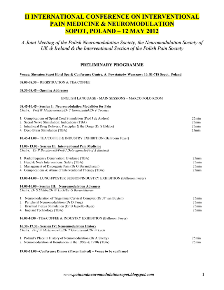 II INTERNATIONAL CONFERENCE ON INTERVENTIONAL PAIN MEDICINE & NEUROMODULATION SOPOT, POLAND – 12 MAY 2012 A Joint Meeting of the Polish Neuromodulation Society, the Neuromodulation Society of UK & Ireland & the Interventional Section of the Polish Pain Society PRELIMINARY PROGRAMME Venue: Sheraton Sopot Hotel Spa & Conference Centre, A, Powstańców Warszawy 10, 81-718 Sopot, Poland 08.00-08.30 – REGISTRATION & TEA/COFFEE 08.30-08.45 - Opening Addresses ENGLISH LANGUAGE - MAIN SESSIONS – MARCO POLO ROOM 08.45-10.45 - Session I: Neuromodulation Modalities for Pain Chairs: Prof W Maksymowicz/Dr T Goroszeniuk/Dr P Toomey 1. 2. 3. 4. Complications of Spinal Cord Stimulation (Prof J de Andres) Sacral Nerve Stimulation: Indications (TBA) Intrathecal Drug Delivery: Principles & the Drugs (Dr S Eldabe) Deep Brain Stimulation (TBA) 25min 25min 25min 25min 10.45-11.00 – TEA/COFFEE & INDUSTRY EXHIBITION (Ballroom Foyer) 11.00- 13.00 - Session II: Interventional Pain Medicine Chairs: Dr P Buczkowski/Prof/J Dobrogowski/Prof A Basinski 1. 2. 3. 4. Radiofrequency Denervation: Evidence (TBA) Head & Neck Interventions: Safety (TBA) Management of Discogenic Pain (Dr G Baranidharan) Complications & Abuse of Interventional Therapy (TBA) 25min 25min 25min 25min 13.00-14.00 – LUNCH/POSTER SESSION/INDUSTRY EXHIBITION (Ballroom Foyer) 14.00-16.00 - Session III: Neuromodulation Advances Chairs: Dr S Eldabe/Dr W Lach/Dr G Baranidharan 1. 2. 3. 4. Neuromodulation of Trigeminal Cervical Complex (Dr JP van Buyten) Peripheral Neuromodulation (Dr D Pang) Brachial Plexus Stimulation (Dr B Jagiello-Bajer) Implant Technology (TBA) 25min 25min 25min 25min 16.00-1630 - TEA/COFFEE & INDUSTRY EXHIBITION (Ballroom Foyer) 16.30- 17.30 - Session IV: Neuromodulation History Chairs: Prof W Maksymowicz/Dr T Goroszeniuk/Dr W Lach 1. Poland’s Place in History of Neuromodulation (Dr A Shetty) 2. Neuromodulation at Konstancin in the 1960s & 1970s (TBA) 25min 25min 19.00-21.00 –Conference Dinner (Places limited) – Venue to be confirmed www.painandneuromodulationsopot.blogspot.com 1 II INTERNATIONAL CONFERENCE ON INTERVENTIONAL PAIN MEDICINE & NEUROMODULATION SOPOT, POLAND – 12 MAY 2012 A Joint Meeting of the Polish Neuromodulation Society, the Neuromodulation Society of UK & Ireland & the Interventional Section of the Polish Pain Society PRELIMINARY PROGRAMME ENGLISH LANGUAGE – PARALLEL SESSIONS –COLUMBUS ROOM C 11.00-13.00 - Session II: Neuromodulation & Function Chairs: Prof W Maksymowicz/Mr B Simpson/Dr S Eldabe 1. 2. 3. 4. Deep Brain Stimulation for Functional Disorders (TBA) Neuromodulation as Adjunctive Therapy in Refractory Epilepsy (Dr P Zwolinski) Gastric Stimulation: Animal & Human Studies (TBA) Stimulation for Sleep Apnoea (TBA) 25min 25min 25min 25min 14.00-16.00 - Session III: Imaging for Interventional Procedures Chairs: Dr P Buzkowski/Dr A Nicolaou/Dr J Rykowski 1. 2. 3. 4. Comparison of CT and C-arm Imaging for Interventional Procedures (Dr P Strulak) Ultrasound in Pain Medicine: Suprascapular, Paravertebral,Intercostal (Dr R Rapcan) Ultrasound in Pain Medicine: Greater Occipital, Cervical Roots, Stellate Ganglion (Dr A Krol) Direct Vision Approach with 7StarScope (TBA) www.painandneuromodulationsopot.blogspot.com 25min 25min 25min 25min 2 II INTERNATIONAL CONFERENCE ON INTERVENTIONAL PAIN MEDICINE & NEUROMODULATION SOPOT, POLAND – 12 MAY 2012 A Joint Meeting of the Polish Neuromodulation Society, the Neuromodulation Society of UK & Ireland & the Interventional Section of the Polish Pain Society INVITED FACULTY Prof Hans G. Kress, President of EFIC, Department of Anaesthesia & Pain Therapy. Medical University, Vienna, Austria Prof Jan Dobrogowski, President of Polish Pain Society (PTBB), Jagiellonian University, Krakow, Poland Prof Andrzej Basinski, Council Member, Polish Pain Society (PTBB), Medical University of Gdansk, Poland Prof W.S. Maksymowicz, President, Polish Neuromodulation Society, University of Varmia & Masuria, Olsztyn, Poland Dr Wieslaw Lach, Secretary of Polish Neuromodulation Society, Szczecin, Poland Dr Teo Goroszeniuk, Board Member of Polish Neuromodulation Society, Guy’s & St Thomas’ Hospital, London, UK Dr Sam Eldabe, President Elect NSUKI, James Cook University Hospital, Middlesbrough, UK Dr Peter Toomey, NSUKI Secretary, York Hospital, York, UK Dr Ganesan Baranidharan, NSUKI Board Member, St James’s University Hospital, Leeds, UK Mr Brian Simpson, Past President of INS, Department of Neurosurgery, University of Wales, Cardiff, UK Dr Piotr Buzkowski, President of Interventional Section, Polish Pain Society (PTBB), Derby Hospital, Derbyshire, UK Prof Marek Harat, Head of Neurosurgery, Military Hospital, Bydgoszcz, Poland Prof Jerzy Kiwerski, Rector of Rehabilitation Centre, Konstancin, Warsaw, Poland Dr Barbara Jagiełło-Bajer, Consultant Neurosurgeon, Department of Neurosurgery, Regional Hospital, Tarnow, Poland Dr Michal Sobstyl, Department of Neurosurgery, Warsaw Postgraduate Medical Centre, Poland Dr Piotr Zwolinski, Department of Neurosurgery, Memorial Child Hospital, Warsaw, Poland Prof Jose de Andres, General Secretary of ESRA, Head of Pain Service, University Hospital Valencia, Spain Dr Jean-Pierre van Buyten, ECMT Chairman, Multidisciplinary Pain Center, AZ Nikolaas, Sint-Niklaas, Belgium Dr Maciej Stepniewski, Past-President Swiss Society for Interventional Pain Management, Aarau, Switzerland Dr Andrzej Krol, Expert in Ultrasound for Pain Medicine, St George’s Hospital, London, UK Dr Robert Rapcan, Expert in Interventional Pain Medicine, Neuromodulation & Ultrasound, Bardejov, Slovakia Dr David Pang, Senior Neuromodulation Fellow, Guy’s & St Thomas’ Hospital, London, UK Dr Jan Rykowski, Consultant Anaesthetist, Orebro Hospital, Sweden Dr Przemyslaw Strulak, Consultant Anaesthetist & Pain Specialist, Graz, Austria www.painandneuromodulationsopot.blogspot.com 3