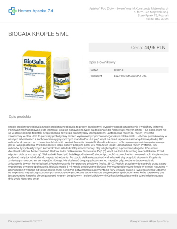 Apteka " Pod Złotym Lwem" mgr M.Konstancja Majewska, dr n. farm. Jan Majewski sp.j. Stary Rynek 75, Poznań +48 61 852 30 24 BIOGAIA KROPLE 5 ML Cena: 44,95 PLN Opis słownikowy Postać KROPLE Producent EWOPHARMA AG SP.Z O.O. Opis produktu Krople probiotyczne BioGaia Krople probiotyczne BioGaia to prosty, bezpieczny i wygodny sposób uzupełnienia Twojej flory jelitowej. Ponieważ można dodawać je do jedzenia i picia lub podawać na łyżce, są doskonałe dla niemowląt i małych dzieci – lub osób, które nie są w stanie połknąć tabletek. Krople BioGaia zawierają probiotyczny szczep bakterii Lactobacillus reuteri (L. reuteri) Protectis zawieszony w oleju. Jest to pierwszy probiotyczny szczep wyizolowany z pozbawionego toksyn mleka matki – obecnie produkowany w naszych laboratoriach z zachowaniem rygorystycznych standardów. Już pięć kropli na dzień zapewnia zalecaną dobową dawkę 100 milionów aktywnych, prozdrowotnych bakterii L. reuteri Protectis. Krople BioGaia® w łatwy sposób zapewnią prawidłową równowagę jelit u Twojego dziecka. Wielkość porcji:5 kropli, Ilość w porcji:25 porcji w 5 ml butelce Skład: Lactobacillus reuteri Protectis, 100 milionów żywych, aktywnych komórek* Inne składniki: Olej słonecznikowy, olej trójglicerydowy o pośredniej długości łańcuchów, dwutlenek silikonu. Może zawierać śladowe ilości białka mleka. Stosowanie Pięć (5) kropli na dzień lub według zaleceń lekarza. Przed użyciem dobrze wstrząsnąć. Wskazówki Przechylić butelkę pod kątem 45 stopni i pozwolić na powolne formowanie kropli. Krople można podawać na łyżce lub dodać do napoju lub jedzenia. Po użyciu delikatnie popukać w dno butelki, aby oczyścić dozownik. Krople nie zmieniają smaku potraw ani napojów. (Uwaga: Nie dodawać do gorących potraw lub napojów, gdyż może to doprowadzić do zniszczenia żywych kultur bakterii.) Przechowywanie Temperatura pokojowa (maks. 25°C). Produkt przydatny do spożycia przez cztery tygodnie po otwarciu opakowania. BioGaia krople 5 ml Krople probiotyczne BioGaia: Pierwsze probiotyczne krople W całości naturalne – pochodzące z wolnego od toksyn mleka matki Klinicznie potwierdzona suplementacja flory jelitowej Twojej i Twojego dziecka Odporne na większość najczęściej stosowanych antybiotyków (skuteczne także w trakcie antybiotykoterapii) Odporne na kwas żołądkowy (nie jest potrzebna kapsułka chroniąca przed kwasem żołądkowym i solami żółciowymi) Całkowicie bezpieczne dla dzieci od pierwszego dnia życia Neutralny smak Plik wygenerowano: 02-03-2017 Powered by TCPDF (www.tcpdf.org) Oprogramowanie sklepu: AptusShop