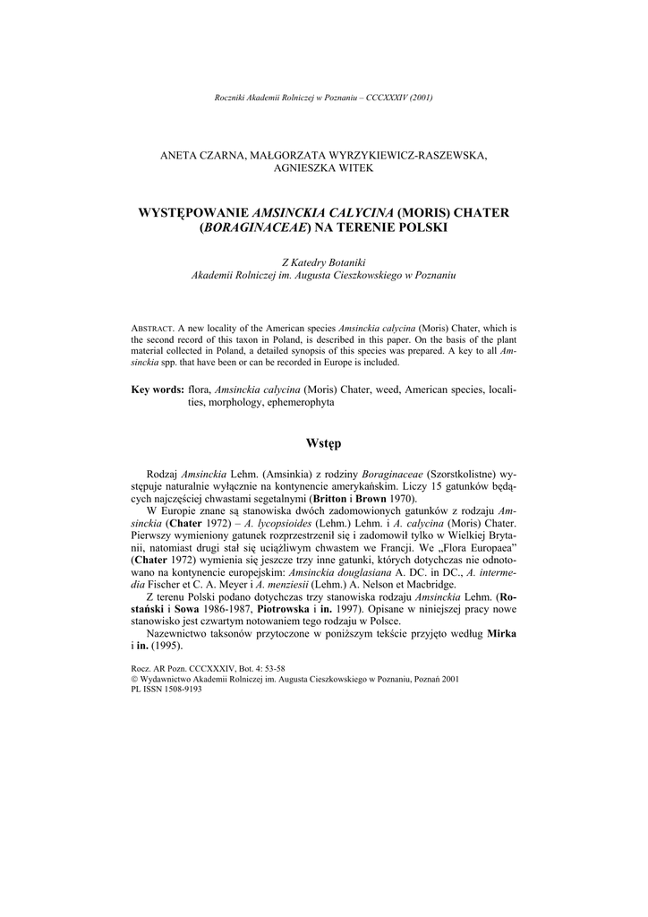 WYSTĘPOWANIE AMSINCKIA CALYCINA (MORIS) CHATER