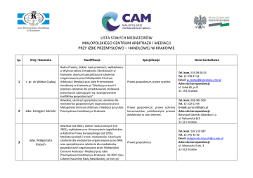 LISTA STAŁYCH MEDIATORÓW MAŁOPOLSKIEGO CENTRUM ARBITRAŻU I MEDIACJI PRZY IZBIE PRZEMYSŁOWO – HANDLOWEJ W KRAKOWIE Lp. 1 2 3 Imię i Nazwisko r. pr. dr Wiktor Czabaj adw. Grzegorz Górecki adw. Małgorzata Kożuch Kwalifikacje Radca Prawny, doktor nauk prawnych, wykładowca w Wyższej Szkole Zarządzania i Bankowości w Krakowie, ukończył specjalistyczne szkolenie zorganizowane przez Małopolskie Centrum Arbitrażu i Mediacji przy Izbie PrzemysłowoHandlowej w Krakowie pt ”Mediacja w teorii i praktyce-szkolenie dla przedstawicieli środowisk prawniczych zajmujących się rozwiązywaniem konfliktów gospodarczych”. Adwokat, ukończył specjalistyczne szkolenie dla mediatorów gospodarczych organizowane przez Małopolskie Centrum Arbitrażu i Mediacji przy Izbie Przemysłowo-Handlowej w Krakowie Adwokat (od 2001), doktor nauk prawnych (od 2001), wykładowca na Uniwersytecie Jagiellońskim w Katedrze Prawa Europejskiego (od 1995). Mediator praktyk i trener mediatorów. Ukończyła szkolenie dla mediatorów organizowane przez NRA oraz specjalistyczne szkolenie dla mediatorów gospodarczych organizowane przez Małopolskie Centrum Arbitrażu i Mediacji przy Izbie Przemysłowo-Handlowej w Krakowie. Od 2007 roku Członek Naczelnej Rady Adwokackiej, (w tym jej Specjalizacje Dane kontaktowe Prawo gospodarcze, prawo cywilne. Tel. kom. 535 09 08 53 Tel. 12 378 97 61 Email: [email protected] Adres do korespondencji: ul. Szlak 65, p.IX 31-153, Kraków Prawo gospodarcze, prawo ochrony konsumentów, problematyka prawna działalności w sieci Internet. Tel. kom. 696 083 960 Tel. 12 222 52 04 E-mail: [email protected] Adres do korespondencji: Bieszczad Górecki Adwokaci s.c. ul. Rakowicka 8/3 31-511 Kraków Prawo gospodarcze Tel. kom. 502 210 987 Tel. 12 341 42 36 Email: [email protected] Adres do korespondencji: ul. Moniuszki 4 lok. 3 31-513 Kraków LISTA STAŁYCH MEDIATORÓW MAŁOPOLSKIEGO CENTRUM ARBITRAŻU I MEDIACJI PRZY IZBIE PRZEMYSŁOWO – HANDLOWEJ W KRAKOWIE prezydium 2007-2010), od 2008 i nadal przedstawiciel Adwokatury Polskiej w International Bar Association. Od 2013r. członek Zespołu do spraw systemowych rozwiązań w zakresie polubownych metod rozwiązywania sporów gospodarczych 4 5 adw. Krzysztof Labe r. pr. Karolina Lempart Adwokat, arbiter i wiceprezes Stałego Sądu Polubownego przy IPH w Krakowie, ukończył specjalistyczne szkolenie dla mediatorów gospodarczych organizowane przez Małopolskie Centrum Arbitrażu i Mediacji przy Izbie Przemysłowo-Handlowej w Krakowie Radca Prawny, absolwentka Wydziału Prawa i Administracji Uniwersytetu Jagiellońskiego. Wpisana na listę prowadzoną przez Okręgową Izbę Radców Prawnych w Krakowie pod numerem KR2217, na podstawie egzaminu radcowskiego złożonego w roku 2012 z najlepszym wynikiem na roku. Specjalizuje się w prawie rynków kapitałowych (ustawa o ofercie publicznej, ustawa o obrocie, ustawa o obligacjach) oraz prawie korporacyjnym (prawo spółek), a także prawie cywilnym – ze szczególnym uwzględnieniem Prawo gospodarcze, prawo cywilne, prawo administracyjne Tel. kom. 507 005 060 Tel. 12 429 12 57, Email:[email protected] www: http://krzysztoflabe.wixsite.com/mojawitryna2/dokumenty Adres do korespondencji: Labe i Wspólnicy Kancelaria Radców Prawnych i Adwokatów Spółka jawna ul. Krupnicza 3, 31-123 Kraków Prawo gospodarcze, prawo spółek, prawo rynków kapitałowych, prawo cywilne, prawo administracyjne i prawo postępowania administracyjnego Tel. kom. 606 535 107 Tel. 12 426 43 94 Email: [email protected] Adres do korespondencji: Lempart Feliński Kancelaria Radców Prawnych partnerska ul. Królowej Jadwigi 103/1 30 – 209 Kraków Spółka LISTA STAŁYCH MEDIATORÓW MAŁOPOLSKIEGO CENTRUM ARBITRAŻU I MEDIACJI PRZY IZBIE PRZEMYSŁOWO – HANDLOWEJ W KRAKOWIE postępowań cywilnych i postępowań arbitrażowych – oraz w prawie karnym i prawie karnym procesowym. Ukończyła specjalistyczne szkolenie dla mediatorów gospodarczych prowadzone przez Małopolskie Centrum Arbitrażu i Mediacji przy Izbie Przemysłowo-Handlowej w Krakowie 6 Adw. Magdalena Makieła Adwokat, absolwentka prawa na UJ, doktor nauk prawnych ze specjalnością prawo międzynarodowe publiczne, ukończyła szkolenie dla mediatorów organizowane przez Centrum Mediacyjne przy Naczelnej Radzie Adwokackiej w Warszawie. Odbyła specjalistyczne szkolenie, zorganizowane przez Małopolskie Centrum Arbitrażu i Mediacji przy Izbie Przemysłowo-Handlowej w Krakowie pt ”Mediacja w teorii i praktyce-szkolenie dla przedstawicieli środowisk prawniczych zajmujących się rozwiązywaniem konfliktów gospodarczych”. Uczestniczyła w szkoleniu zorganizowanym przez Harvard University Extension School. Członek Grupy Polskiej Stowarzyszenia Prawa Międzynarodowego. Prawo gospodarcze, prawo cywilne Tel.Kom. 501 148 545 E-Mail: [email protected] Adres do korespondencji: Śledziejowice 361 32-020 Wieliczka - Kraków LISTA STAŁYCH MEDIATORÓW MAŁOPOLSKIEGO CENTRUM ARBITRAŻU I MEDIACJI PRZY IZBIE PRZEMYSŁOWO – HANDLOWEJ W KRAKOWIE 7 8 9 R. pr. Jerzy Muzyk Adw. Joanna Wsołek adw. Andrzej Zacharzewski Radca prawny, ukończył specjalistyczne szkolenie dla mediatorów gospodarczych prowadzone przez Małopolskie Centrum Arbitrażu i Mediacji przy Izbie Przemysłowo-Handlowej w Krakowie adwokat, absolwent prawa na Uniwersytecie Jagiellońskim oraz LL.M z Columbus School of Law w Catholic University of America w Waszyngtonie, ukończyła szkolenie zawodowe mediatorów organizowane przez Centrum Mediacji przy Naczelnej Radzie Adwokackiej w Warszawie oraz specjalistyczne szkolenie dla mediatorów gospodarczych organizowane przez Małopolskie Centrum Arbitrażu i Mediacji przy Izbie Przemysłowo-Handlowej w Krakowie. . Adwokat; absolwent prawa na UJ, Southwestern Methodist University w Dallas oraz DePaul University College of Law w Chicago; Arbiter sądów polubownych: przy Izbie Przemysłowo-Handlowej w Krakowie oraz przy Związku Banków Polskich; Ukończ
