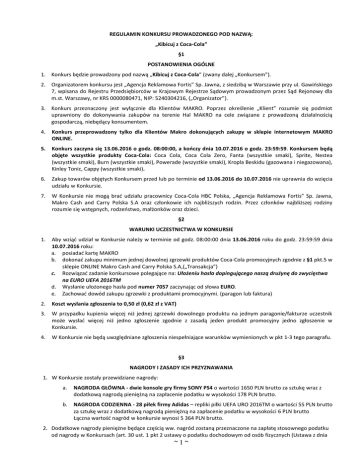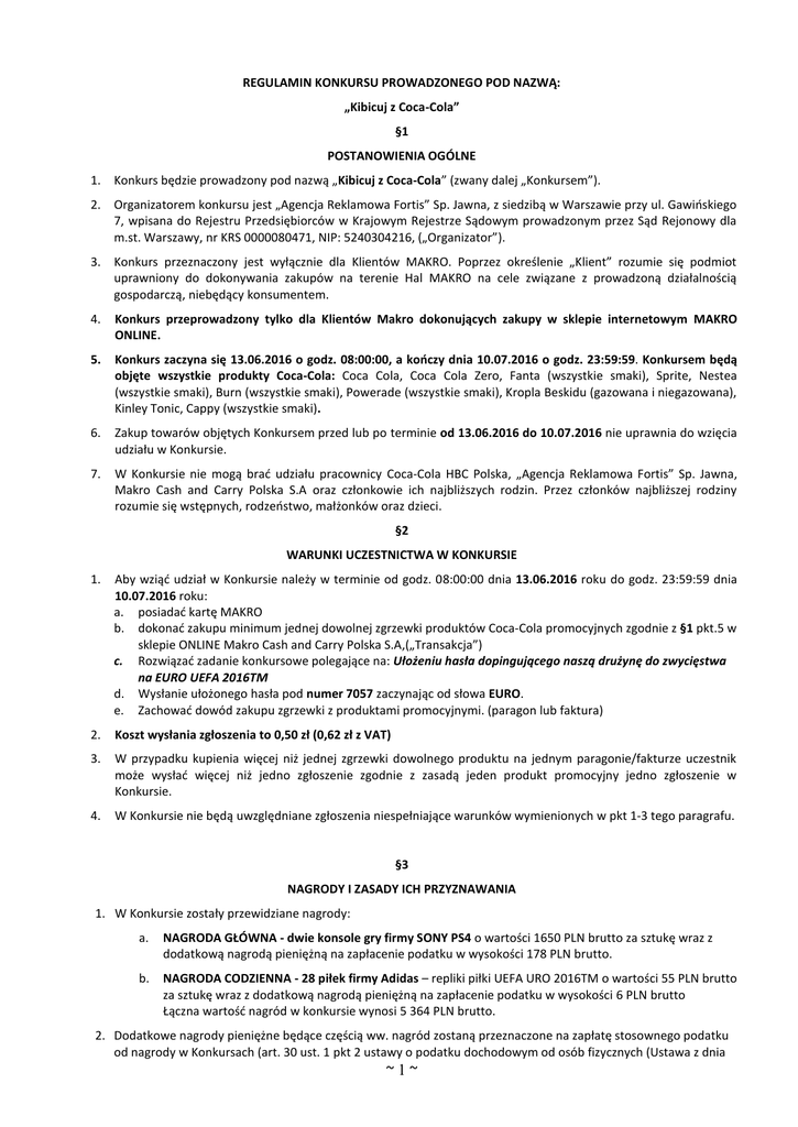 REGULAMIN KONKURSU PROWADZONEGO POD NAZWĄ: „Kibicuj z Coca-Cola” §1 POSTANOWIENIA OGÓLNE 1. Konkurs będzie prowadzony pod nazwą „Kibicuj z Coca-Cola” (zwany dalej „Konkursem”). 2. Organizatorem konkursu jest „Agencja Reklamowa Fortis” Sp. Jawna, z siedzibą w Warszawie przy ul. Gawińskiego 7, wpisana do Rejestru Przedsiębiorców w Krajowym Rejestrze Sądowym prowadzonym przez Sąd Rejonowy dla m.st. Warszawy, nr KRS 0000080471, NIP: 5240304216, („Organizator”). 3. Konkurs przeznaczony jest wyłącznie dla Klientów MAKRO. Poprzez określenie „Klient” rozumie się podmiot uprawniony do dokonywania zakupów na terenie Hal MAKRO na cele związane z prowadzoną działalnością gospodarczą, niebędący konsumentem. 4. Konkurs przeprowadzony tylko dla Klientów Makro dokonujących zakupy w sklepie internetowym MAKRO ONLINE. 5. Konkurs zaczyna się 13.06.2016 o godz. 08:00:00, a kończy dnia 10.07.2016 o godz. 23:59:59. Konkursem będą objęte wszystkie produkty Coca-Cola: Coca Cola, Coca Cola Zero, Fanta (wszystkie smaki), Sprite, Nestea (wszystkie smaki), Burn (wszystkie smaki), Powerade (wszystkie smaki), Kropla Beskidu (gazowana i niegazowana), Kinley Tonic, Cappy (wszystkie smaki). 6. Zakup towarów objętych Konkursem przed lub po terminie od 13.06.2016 do 10.07.2016 nie uprawnia do wzięcia udziału w Konkursie. 7. W Konkursie nie mogą brać udziału pracownicy Coca-Cola HBC Polska, „Agencja Reklamowa Fortis” Sp. Jawna, Makro Cash and Carry Polska S.A oraz członkowie ich najbliższych rodzin. Przez członków najbliższej rodziny rozumie się wstępnych, rodzeństwo, małżonków oraz dzieci. §2 WARUNKI UCZESTNICTWA W KONKURSIE 1. Aby wziąć udział w Konkursie należy w terminie od godz. 08:00:00 dnia 13.06.2016 roku do godz. 23:59:59 dnia 10.07.2016 roku: a. posiadać kartę MAKRO b. dokonać zakupu minimum jednej dowolnej zgrzewki produktów Coca-Cola promocyjnych zgodnie z §1 pkt.5 w sklepie ONLINE Makro Cash and Carry Polska S.A,(„Transakcja”) c. Rozwiązać zadanie konkursowe polegające na: Ułożeniu hasła dopingującego naszą drużynę do zwycięstwa na EURO UEFA 2016TM d. Wysłanie ułożonego hasła pod numer 7057 zaczynając od słowa EURO. e. Zachować dowód zakupu zgrzewki z produktami promocyjnymi. (paragon lub faktura) 2. Koszt wysłania zgłoszenia to 0,50 zł (0,62 zł z VAT) 3. W przypadku kupienia więcej niż jednej zgrzewki dowolnego produktu na jednym paragonie/fakturze uczestnik może wysłać więcej niż jedno zgłoszenie zgodnie z zasadą jeden produkt promocyjny jedno zgłoszenie w Konkursie. 4. W Konkursie nie będą uwzględniane zgłoszenia niespełniające warunków wymienionych w pkt 1-3 tego paragrafu. §3 NAGRODY I ZASADY ICH PRZYZNAWANIA 1. W Konkursie zostały przewidziane nagrody: a. NAGRODA GŁÓWNA - dwie konsole gry firmy SONY PS4 o wartości 1650 PLN brutto za sztukę wraz z dodatkową nagrodą pieniężną na zapłacenie podatku w wysokości 178 PLN brutto. b. NAGRODA CODZIENNA - 28 piłek firmy Adidas – repliki piłki UEFA URO 2016TM o wartości 55 PLN brutto za sztukę wraz z dodatkową nagrodą pieniężną na zapłacenie podatku w wysokości 6 PLN brutto Łączna wartość nagród w konkursie wynosi 5 364 PLN brutto. 2. Dodatkowe nagrody pieniężne będące częścią ww. nagród zostaną przeznaczone na zapłatę stosownego podatku od nagrody w Konkursach (art. 30 ust. 1 pkt 2 ustawy o podatku dochodowym od osób fizycznych (Ustawa z dnia ~1~ 26 lipca 1991 r.; tekst jednolity Dz.U. z 2000 r. nr 14, poz 176, z późn. zm.), Organizator potrąci te kwoty przy wydaniu nagród. 3. Każdy z uczestników może otrzymać w Konkursie tylko jedną nagrodę w postaci konsoli PS4 i jednej w postaci Piłki Adidas. 4. Wszystkie prawidłowe zgłoszenia konkursowe dokonane od 8:00:00 dnia 13.06.2016 roku do 23:59:59 dnia 10.07.2016 roku będą walczyć o nagrody. 4. Wybór laureatów nagród odbywać się będzie codziennie od 13.06.2015 roku do 10.07.2015 roku. 5. Komisja Konkursowa będzie wybierać 1 najlepsze hasło z przesłanych od 13.06.2015 roku do 10.07.2015 roku. Jeśli któregoś dnia nie będzie odpowiedniej ilości zgłoszeń konkursowych nagrody z danego dnia przechodzą na kolejny. 6. Dodatkowo kolejne 3 zgłoszenia z każdego dnia, zostanie umieszczone na liście rezerwowej w kolejności wyboru (według oceny kreatywności wykonania zadania ocenianego przez Komisję Konkursową). 7. Nagrody główne w postaci 2 konsol PS4 zostaną wybrane z wszystkich nadesłanych zgłoszeń od 13.06.2015 roku do 10.07.2015 roku 8. Dodatkowo kolejne 3 zgłoszenia, zostaną umieszczone na liście rezerwowej w kolejności wyboru (według oceny kreatywności wykonania zadania ocenianego przez Komisję Konkursową). 9. Wyboru najlepszych rozwiązań zadań konkursowych dokonywać będzie Komisja Konkursowa składająca się z 3 osób. 10. Posiedzenia Komisji Konkursowej odbywać się będą codziennie – każdego następnego dnia roboczego - od dnia od 13.06.2015 roku do 10.07.2015 roku 11. W ocenie wykonania zadania konkursowego przez Uczestników, Komisja Konkursowa będzie stosowała następujące kryteria (do wyboru przez Komisję): c. oryginalność wykonania zadania d. pomysłowość e. słownictwo i stylistykę 12. Do zadań Komisji należy: a. zapewnienie uczestnictwa w konkursie wszystkim prawidłowym zgłoszeniom, b. rozstrzygnięcie konkursu zgodnie z postanowieniami niniejszego regulaminu oraz zasadami pełnej rzetelności przeprowadzonych czynności, c. podpisanie listy osób – laureatów konkursu, które otrzymały prawo do nagrody, d. prowadzenie postępowań reklamacyjnych. 13. Weryfikacja prawa do nagrody będzie przeprowadzona na podstawie danych zakupowych z systemu Makro Cash and Carry Polska S.A 14. Procedura weryfikacyjna dla nagród zakończy się najpóźniej w dniu 27.07.2016 roku. 15. Uczestnik traci prawo do nagrody, gdy: a. nie dopełni w terminie któregoś z warunków Regulam