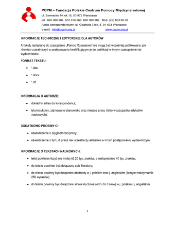 PCPM – Fundacja Polskie Centrum Pomocy Międzynarodowej ul. Sarmacka 14 lok.15, 00-972 Warszawa tel.: 690 900 987, 510 616 660, 690 900 387, faks: (22) 833 60 22 Adres korespondencyjny: ul. Gdańska 3 lok. 5, 01-633 Warszawa e-mail: [email protected] www.pcpm.org.pl INFORMACJE TECHNICZNE I EDYTORSKIE DLA AUTORÓW Artykuły nadsyłane do czasopisma „Pomoc Rozwojowa” nie mogą być wcześniej publikowane, jak również uczestniczyć w postępowaniu kwalifikującym je do publikacji w innym czasopiśmie lub wydawnictwie. FORMAT TEKSTU: *.doc *.docx *.rtf INFORMACJA O AUTORZE: dokładny adres do korespondencji; tytuł naukowy, zajmowane stanowisko oraz miejsce pracy (tylko w przypadku artykułów naukowych). DODATKOWO PROSIMY O: oświadczenie o oryginalności pracy; oświadczenie o tym, iż praca nie uczestniczy aktualnie w innym postępowaniu wydawniczym. INFORMACJE O TEKSTACH NAUKOWYCH: tekst powinien liczyć nie mniej niż 20 tys. znaków, a maksymalnie 40 tys. znaków; do tekstu powinien być dołączony spis literatury; do tekstu powinny być dołączone abstrakty w j. polskim oraz j. angielskim (liczące maksymalnie 250 wyrazów); do tekstu powinny być dołączone słowa kluczowe (od 5 do 8 słów) w j. polskim i j. angielskim. 1 PCPM – Fundacja Polskie Centrum Pomocy Międzynarodowej ul. Sarmacka 14 lok.15, 00-972 Warszawa tel.: 690 900 987, 510 616 660, 690 900 387, faks: (22) 833 60 22 Adres korespondencyjny: ul. Gdańska 3 lok. 5, 01-633 Warszawa e-mail: [email protected] www.pcpm.org.pl INFORMACJE O TEKSTACH POPULARYZATORSKICH: tekst powinien liczyć nie mniej niż 8 tys. znaków, a maksymalnie 20 tys. znaków. SPIS LITERATURY: spis powinien być uporządkowany alfabetycznie; w tytułach dzieł oraz artykułów należy stosować kursywę; tytuły czasopism należy pisać stylem prostym w cudzysłowie; nie należy podawać nazw wydawnictw. W przypadku książki – nazwisko autora i pierwsza litera imienia (imion), kropka, rok wydania w nawiasie, przecinek, tytuł kursywą, przecinek, miejsce wydania, kropka. Jasiewicz Z. (2004), Rodzina, społeczność lokalna i grupa etniczna w Polsce i Azji Środkowej, Poznań. W przypadku prac zbiorowych – nazwisko (nazwiska) redaktorów, pierwsza litera imienia (imion), kropka (red.), rok wydania w nawiasie, przecinek, tytuł kursywą, przecinek, miejsce wydania, kropka: Górak-Sosnowska K., Markowska U. (red.) (2011), Oblicza Azji, Afryki i Ameryki Łacińskiej. Materiały do zajęć z edukacji globalnej, Warszawa. Sajoo A. B. (red.) (2002), Civil society in the Muslim World: Contemporary Perspectives, London. W przypadku tekstów w pracach zbiorowych – nazwisko autora i pierwsza litera imienia (imion), kropka, rok wydania w nawiasie, przecinek, tytuł kursywą, [w:], nazwisko redaktora i pierwsza litera imienia (imion), kropka, (red.), przecinek, tytuł kursywą, przecinek, miejsce wydania, kropka: Zapaśnik, S. (2010) Tolerancja a odmienni kulturowo [w:] Jakubowska – Branicka I. (red.), O Tolerancji we Współczesnym Świecie Demokracji Liberalnej, Warszawa. W przypadku artykułu w czasopiśmie: tygodniku, dwutygodniku itp. – nazwisko autora i pierwsza litera imienia (imion), kropka, rok wydania w nawiasie, przecinek, tytuł kursywą, przecinek, tytuł czasopisma w cudzysłowie, przecinek, kolejny numer czasopisma: Peshkova S. (2009), Muslim Women Leaders in the Ferghana Valley: Whose leadership is it anyway?, „Journal of International Women’s Studies”, nr 11/1. 2 PCPM – Fundacja Polskie Centrum Pomocy Międzynarodowej ul. Sarmacka 14 lok.15, 00-972 Warszawa tel.: 690 900 987, 510 616 660, 690 900 387, faks: (22) 833 60 22 Adres korespondencyjny: ul. Gdańska 3 lok. 5, 01-633 Warszawa e-mail: [email protected] www.pcpm.org.pl Wojciechowski M. (2013), Antropolodzy z CIA. Broń antropologiczna, „Polityka”, nr 37/2924 W przypadku artykułu w gazecie codziennej – nazwisko autora i pierwsza litera imienia (imion) – o ile są znane, kropka, rok publikacji w nawiasie, przecinek, tytuł artykułu kursywą, przecinek, tytuł gazety (w cudzysłowie), przecinek, data dzienna wydania, kropka: Zawadzki M. (2013), Ameryka stanęła, „Gazeta Wyborcza”, 2 października. Uwaga: W przypadku artykułu podpisanego inicjałem, skrótem lub niejednoznacznym pseudonimem dane autora należy pominąć, a w przypisie zamieścić jedynie tytuł artykułu, tytuł gazety i datę. W przypadku wywiadu w gazecie codziennej – nazwisko autora i pierwsza litera imienia (imion) – o ile są znane, kropka, rok publikacji w nawiasie, przecinek, tytuł artykułu kursywą, przecinek, tytuł gazety (w cudzysłowie), przecinek, data dzienna wydania, kropka: Becler, R., 2011, O śmierci trzeba mówić prawdę, rozm. przepr. A. Wacławik-Orpik, „Gazeta Wyborcza”, 11 marca W przypadku tekstów z Internetu nazwisko autora i pierwsza litera imienia (imion), przecinek, rok publikacji artykułu, przecinek, tytuł kursywą, przecinek, data dzienna publikacji, przecinek, <adres internetowy>, przecinek, [dostęp: (data w formacie miesiąc i rok)], kropka: Romodanowskij K. (2011), Rossija stała terpimee k trudowym migrantom, 04.05.2011, <http://www.memoid.ru>, [dostęp: maj 2012]. Uwaga: w przypadku raportów jw.; po tytule dajemy nazwę raportu, przecinek, nazwę organizacji, która raport przygotowała, (jeśli podany miesiąc i rok, również je wpisujemy), przecinek, <adres internetowy>, przecinek, [dostęp: (data w formacie miesiąc rok)], kropka. Beyond Borders: Exploring Links between Trafficking and Migration (2010), GAATW Working Papers Series, Global Alliance Against Traffic in Women, <http://www.gaatw.org>, [dostęp: wrzesień 2013]. PRZYPISY: Przypisy należy umieszczać na końcu strony, służą one jedynie dla uzupełnienia informacji znajdujących się w tekście głównym, nie zaś do cytowania źródeł, chyba że informacje zawarte w tekście były uzyskane podczas pracy w terenie (badań, pracy w organizacjach pomocowych etc.), n