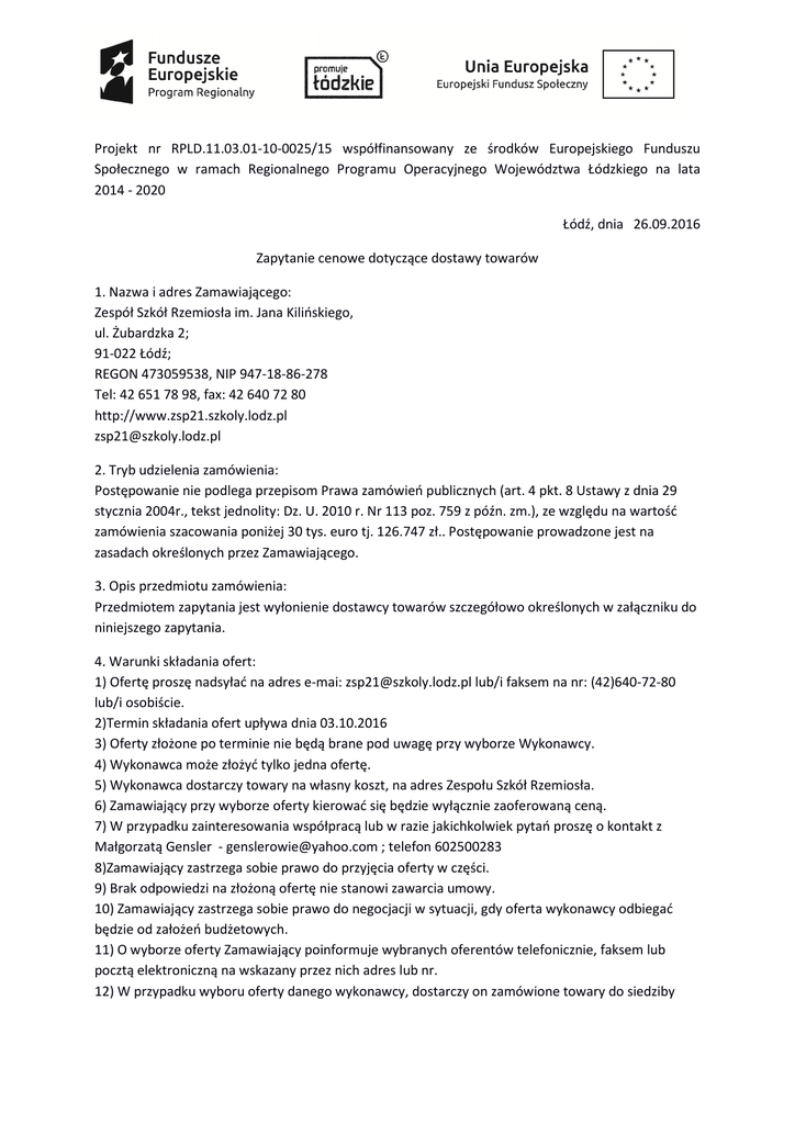 Projekt nr RPLD.11.03.01-10-0025/15 współfinansowany ze środków Europejskiego Funduszu Społecznego w ramach Regionalnego Programu Operacyjnego Województwa Łódzkiego na lata 2014 - 2020 Łódź, dnia 26.09.2016 Zapytanie cenowe dotyczące dostawy towarów 1. Nazwa i adres Zamawiającego: Zespół Szkół Rzemiosła im. Jana Kilińskiego, ul. Żubardzka 2; 91-022 Łódź; REGON 473059538, NIP 947-18-86-278 Tel: 42 651 78 98, fax: 42 640 72 80 http://www.zsp21.szkoly.lodz.pl [email protected] 2. Tryb udzielenia zamówienia: Postępowanie nie podlega przepisom Prawa zamówień publicznych (art. 4 pkt. 8 Ustawy z dnia 29 stycznia 2004r., tekst jednolity: Dz. U. 2010 r. Nr 113 poz. 759 z późn. zm.), ze względu na wartość zamówienia szacowania poniżej 30 tys. euro tj. 126.747 zł.. Postępowanie prowadzone jest na zasadach określonych przez Zamawiającego. 3. Opis przedmiotu zamówienia: Przedmiotem zapytania jest wyłonienie dostawcy towarów szczegółowo określonych w załączniku do niniejszego zapytania. 4. Warunki składania ofert: 1) Ofertę proszę nadsyłać na adres e-mai: [email protected] lub/i faksem na nr: (42)640-72-80 lub/i osobiście. 2)Termin składania ofert upływa dnia 03.10.2016 3) Oferty złożone po terminie nie będą brane pod uwagę przy wyborze Wykonawcy. 4) Wykonawca może złożyć tylko jedna ofertę. 5) Wykonawca dostarczy towary na własny koszt, na adres Zespołu Szkół Rzemiosła. 6) Zamawiający przy wyborze oferty kierować się będzie wyłącznie zaoferowaną ceną. 7) W przypadku zainteresowania współpracą lub w razie jakichkolwiek pytań proszę o kontakt z Małgorzatą Gensler - [email protected] ; telefon 602500283 8)Zamawiający zastrzega sobie prawo do przyjęcia oferty w części. 9) Brak odpowiedzi na złożoną ofertę nie stanowi zawarcia umowy. 10) Zamawiający zastrzega sobie prawo do negocjacji w sytuacji, gdy oferta wykonawcy odbiegać będzie od założeń budżetowych. 11) O wyborze oferty Zamawiający poinformuje wybranych oferentów telefonicznie, faksem lub pocztą elektroniczną na wskazany przez nich adres lub nr. 12) W przypadku wyboru oferty danego wykonawcy, dostarczy on zamówione towary do siedziby zamawiającego w terminach ustalonych przez strony. Zamawiający zastrzega, że terminy dostaw mogą ulec zmianie. 13) Płatność za towary nastąpi do 30 dni po wystawieniu faktury, na rachunek wskazany przez sprzedającego Jednocześnie informujemy, że: - nie zwracamy kosztów przygotowania oferty dla celów niniejszego zapytania; - niniejsze pismo nie jest ofertą w rozumieniu przepisów kodeksu cywilnego; - odpowiemy jedynie na wybrane oferty i jednocześnie zastrzegamy sobie prawo do odstąpienia od dokonania wyboru oferty najkorzystniejszej bez podania przyczyny; - nie odsyłamy nadesłanych ofert. Załącznik: Aparat ultradźwiękowy do przedłużania i zagęszczania włosów – moc 25 W Włosy naturalne 42 cm pod mikroringi – pasemka naturalne o strukturze europejskiej, waga: 0,5 grama/pasemko, opakowanie 20 pasm Włosy naturalne 42 cm pod keratynę– pasemka naturalne o strukturze europejskiej, waga: 0,5 grama/pasemko, opakowanie 20 pasm Włosy na taśmie CLIP IN - CLIP ON naturalne długość 40 cm – zestaw 7 pasm Mikroringi z sylikonem – opakowanie 100 szt. Tulejki termokurczliwe – opakowanie 100 szt. Pałki keratynowe (przeźroczyste) – długość 10 cm; średnica 7mm Cążki do usuwania keratyny Cążki do ściskania ringów Szydełko z pętelką Szydełko z zapadką Pistolet do keratyny Podgrzewacz do keratyny Szczotka do włosów przedłużanych Zgrzewarka do przedłużania włosów – regulacja temperatury od 80 do 180 stopni Ochraniacze na palce, tworzywo guma 3 szt. ok 50 opakowań ok 50 opakowań ok 10 zestawów ok 6 opakowań ok 6 opakowań ok 80 szt. 6 szt. 6 szt. 8 szt. 8 szt. 3 szt. 2 szt. 12szt. 12 szt. 24 szt. FORMULARZ OFERTOWY ..................................... (miejscowość i data) ....................................................... ....................................................... ....................................................... (Nazwa i adres oferenta) OFERTA Zespół Szkół Rzemiosła im. Jana Kilińskiego, ul. Żubardzka 2 91-022 Łódź; REGON 470359538, NIP 947-18-86-278 Tel: 42 651 78 98, fax: 42 640 72 80 http://www.zsp21.szkoly.lodz.pl [email protected] (nazwa i adres zamawiającego) Odpowiadając na zapytanie o cenę oferujemy wykonanie niniejszego zamówienia: Lp. 1 2 3 4 5 6 7 Razem Przedmiot Jednostka Zamówienia miary n/d n/d Ilość Cena jednostkowa netto n/d n/d Wartość netto Stawka VAT (%) n/d Wartość VAT Wartość brutto