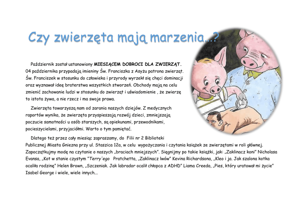 Czy zwierzęta mają marzenia…? Październik został ustanowiony MIESIĄCEM DOBROCI DLA ZWIERZĄT. 04 października przypadają imieniny Św. Franciszka z Asyżu patrona zwierząt. Św. Franciszek w stosunku do człowieka i przyrody wyrzekł się chęci dominacji oraz wyznawał ideę braterstwa wszystkich stworzeń. Obchody mają na celu zmienić zachowanie ludzi w stosunku do zwierząt i uświadomienie , że zwierzę to istota żywa, a nie rzecz i ma swoje prawa. Zwierzęta towarzyszą nam od zarania naszych dziejów. Z medycznych raportów wynika, że zwierzęta przyspieszają rozwój dzieci, zmniejszają poczucie samotności u osób starszych, są opiekunami, przewodnikami, pocieszycielami, przyjaciółmi. Warto o tym pamiętać. Dlatego też przez cały miesiąc zapraszamy, do Filii nr 2 Biblioteki Publicznej Miasta Gniezna przy ul. Staszica 12a, w celu wypożyczania i czytania książek ze zwierzętami w roli głównej. Zapoczątkujmy modę na czytanie o naszych „braciach mniejszych”. Sięgnijmy po takie książki, jak: „Zaklinacz koni” Nicholasa Evansa, „Kot w stanie czystym ”Terry'ego Pratchetta, „Zaklinacz lwów” Kevina Richardsona, „Kleo i ja. Jak szalona kotka ocaliła rodzinę” Helen Brown, „Szczeniak. Jak labrador ocalił chłopca z ADHD” Liama Creeda, „Pies, który uratował mi życie” Isabel George i wiele, wiele innych...