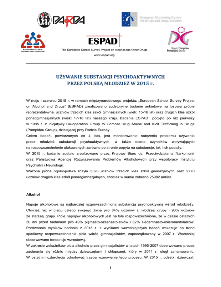 The European School Survey Project on Alcohol and Other Drugs www.espad.org UŻYWANIE SUBSTANCJI PSYCHOAKTYWNYCH PRZEZ POLSKĄ MŁODZIEŻ W 2015 r. W maju i czerwcu 2015 r. w ramach międzynarodowego projektu: „European School Survey Project on Alcohol and Drugs” (ESPAD) zrealizowano audytoryjne badanie ankietowe na losowej próbie reprezentatywnej uczniów trzecich klas szkół gimnazjalnych (wiek: 15-16 lat) oraz drugich klas szkół ponadgimnazjalnych (wiek: 17-18 lat) naszego kraju. Badania ESPAD podjęto po raz pierwszy w 1995 r. z inicjatywy Co-operation Group to Combat Drug Abuse and Illicit Trafficking in Drugs (Pompidou Group), działającej przy Radzie Europy. Celem badań, powtarzanych co 4 lata, jest monitorowanie natężenia problemu używania przez młodzież substancji psychoaktywnych, a także ocena czynników wpływających na rozpowszechnienie ulokowanych zarówno po stronie popytu na substancje, jak i ich podaży. W 2015 r. badanie zostało zrealizowane przez Krajowe Biuro ds. Przeciwdziałania Narkomanii oraz Państwową Agencję Rozwiązywania Problemów Alkoholowych przy współpracy Instytutu Psychiatrii i Neurologii. Ważona próba ogólnopolska liczyła 3526 uczniów trzecich klas szkół gimnazjalnych oraz 2770 uczniów drugich klas szkół ponadgimnazjalnych, chociaż w sumie zebrano 25982 ankiet. Alkohol Napoje alkoholowe są najbardziej rozpowszechnioną substancją psychoaktywną wśród młodzieży. Chociaż raz w ciągu całego swojego życia piło 84% uczniów z młodszej grupy i 96% uczniów ze starszej grupy. Picie napojów alkoholowych jest na tyle rozpowszechnione, że w czasie ostatnich 30 dni przed badaniem piło 49% piętnasto-szesnastolatków i 82% siedemnasto-osiemnastolatków. Porównanie wyników badania z 2015 r. z wynikami wcześniejszych badań wskazuje na trend spadkowy rozpowszechnienia picia wśród gimnazjalistów, zapoczątkowany w 2007 r. Wcześniej obserwowano tendencje wzrostową. W zakresie wskaźników picia alkoholu przez gimnazjalistów w latach 1995-2007 obserwowano proces zacierania się różnic między dziewczętami i chłopcami, który w 2011 r. uległ zahamowaniu. W ostatnim czteroleciu odnotować trzeba wznowienie tego procesu. W 2015 r. odsetki dziewcząt, 1 które piły w czasie ostatnich 30 przed badaniem są niemal takie same jak analogiczne odsetki chłopców. Stało się tak za sprawą większego spadku rozpowszechnienia picia wśród chłopców niż wśród dziewcząt. Najbardziej popularnym napojem alkoholowym wśród całej młodzieży jest piwo, a najmniej – wino. Wysoki odsetek badanych przyznaje się do przekraczania progu nietrzeźwości. W czasie ostatnich 30 dni przed badaniem, 13% uczniów z młodszej kohorty i 20% ze starszej grupy wiekowej chociaż raz upiło się w takim stopniu, że doświadczało zaburzeń równowagi, mowy lub nie pamiętało co się z nimi działo. We wcześniejszych edycjach badania ESPAD pytano o nietrzeźwość w trochę inny sposób, stąd wyniki obecnego badania nie są porównywalne z wcześniejszym trendem. Pytanie o upijanie się w obecnej postaci zadano jednak także w 2011 r. Między 2011 r. i 2015 r. nie odnotowano większych zmian. Uwagę zwraca wysoki poziom dostępności napojów alkoholowych, przejawiający się w ocenach respondentów. W zakresie ocen dostępności napojów alkoholowych odnotować trzeba powolną, ale konsekwentnie pozytywną tendencję zmniejszania się odsetków uczniów, określających swój dostęp jako bardzo łatwy. Ponadto zmniejszają się też odsetki uczniów, dokonujących zakupów napojów alkoholowych, zwłaszcza piwa. Większość młodzieży jest dobrze zorientowana w zakresie ryzyka szkód zdrowotnych i społecznych związanych z piciem alkoholu. O stopniu ryzyka, według ocen respondentów, w znacznym stopniu decyduje wzór picia. W 2015 r. odnotować trzeba zahamowanie tendencji spadkowej traktowania picia alkoholu, jako zachowania bardzo ryzykownego. Narkotyki Zgodnie z oczekiwaniami, wyniki badania wskazują na znacznie niższy poziom rozpowszechnienia używania substancji nielegalnych, niż legalnych, zwłaszcza alkoholu. Większość badanych nigdy po substancje nielegalne nie sięgała. Wśród tych, którzy mają za sobą takie doświadczenia większość stanowią osoby, które co najwyżej eksperymentowały z marihuaną lub haszyszem. Chociaż raz w ciągu całego życia używało tych substancji 24,3% młodszych uczniów i 37,3% starszych uczniów. Na drugim miejscu pod względem rozpowszechnienia wśród substancji nielegalnych jest amfetamina ok. 4,6% wśród uczniów gimnazjów i 8,3% wśród uczniów szkół wyższego poziomu. Aktualne, okazjonalne używania substancji nielegalnych, czego wskaźnikiem jest używanie w czasie ostatnich 12 miesięcy, także stawia przetwory konopi na pierwszym miejscu pod względem rozpowszechnienia. W klasach trzecich gimnazjów używa tego środka 19% uczniów, w klasach drugich szkół ponadgimnazjalnych – 32%. W czasie ostatnich 30 dni przed badaniem 10% uczniów klas trzecich gimnazjów i 15% uczniów klas drugich szkół ponadgimnazjalnych używało marihuany lub haszyszu. W zakresie używania przetworów konopi obserwowaliśmy podobne tendencje w obu grupach wiekowych, jednak wyniki w 2015 r. sugerują odmienności. Wzrost wszystkich trzech wskaźników w młodszej grupie uległ zahamowaniu, podczas gdy w starszej tylko odsetki używających w czasie ostatnich 30 dni nie uległy zmianie. 2 Zarówno eksperymentowanie z substancjami nielegalnymi, jak ich okazjonalne używanie, jest bardziej rozpowszechnione wśród chłopców niż wśród dziewcząt. Inne wskaźniki problemu marihuany i haszyszu, takie jak postrzegana dostępność czy oferty tych substancji, jak również zasięg używania ich w otoczeniu badanych, wykazują podobne tendencje jak rozpowszechnienie używania. W młodszej grupie w 2015 r. zaznaczył się spadek, w starszej stabilizacja lub lekki wzrost. Potwier