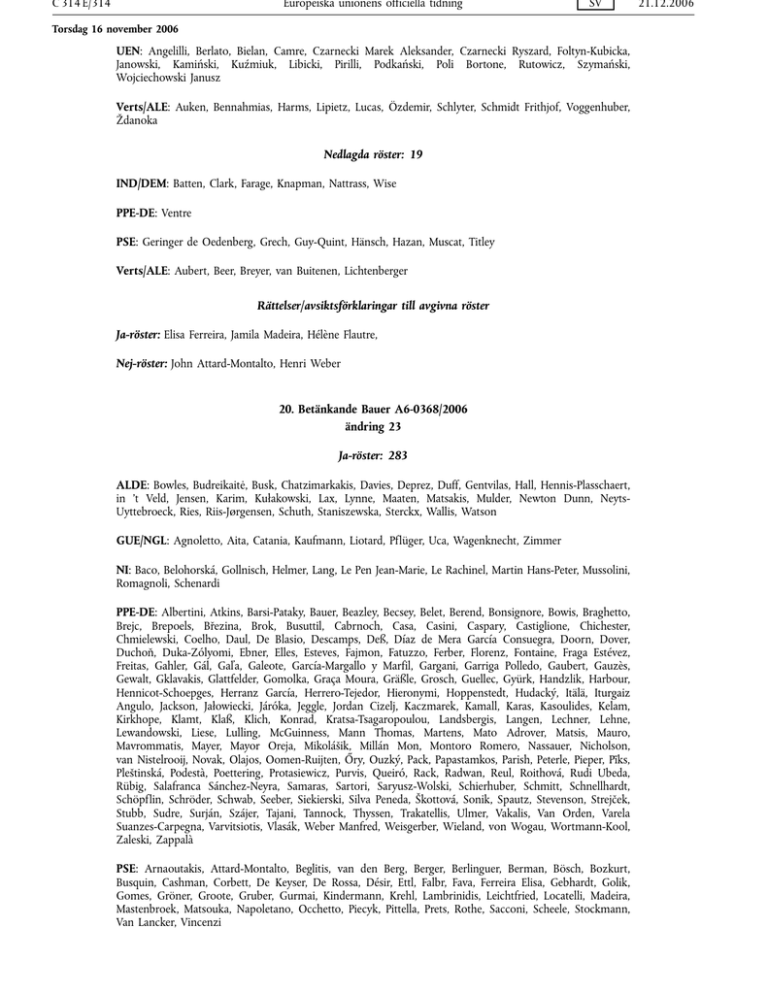C 314 E/314 Europeiska unionens officiella tidning SV Torsdag 16 november 2006 UEN: Angelilli, Berlato, Bielan, Camre, Czarnecki Marek Aleksander, Czarnecki Ryszard, Foltyn-Kubicka, Janowski, Kamiński, Kuźmiuk, Libicki, Pirilli, Podkański, Poli Bortone, Rutowicz, Szymański, Wojciechowski Janusz Verts/ALE: Auken, Bennahmias, Harms, Lipietz, Lucas, Özdemir, Schlyter, Schmidt Frithjof, Voggenhuber, Ždanoka Nedlagda röster: 19 IND/DEM: Batten, Clark, Farage, Knapman, Nattrass, Wise PPE-DE: Ventre PSE: Geringer de Oedenberg, Grech, Guy-Quint, Hänsch, Hazan, Muscat, Titley Verts/ALE: Aubert, Beer, Breyer, van Buitenen, Lichtenberger Rättelser/avsiktsförklaringar till avgivna röster Ja-röster: Elisa Ferreira, Jamila Madeira, Hélène Flautre, Nej-röster: John Attard-Montalto, Henri Weber 20. Betänkande Bauer A6-0368/2006 ändring 23 Ja-röster: 283 ALDE: Bowles, Budreikaitė, Busk, Chatzimarkakis, Davies, Deprez, Duff, Gentvilas, Hall, Hennis-Plasschaert, in 't Veld, Jensen, Karim, Kułakowski, Lax, Lynne, Maaten, Matsakis, Mulder, Newton Dunn, NeytsUyttebroeck, Ries, Riis-Jørgensen, Schuth, Staniszewska, Sterckx, Wallis, Watson GUE/NGL: Agnoletto, Aita, Catania, Kaufmann, Liotard, Pflüger, Uca, Wagenknecht, Zimmer NI: Baco, Belohorská, Gollnisch, Helmer, Lang, Le Pen Jean-Marie, Le Rachinel, Martin Hans-Peter, Mussolini, Romagnoli, Schenardi PPE-DE: Albertini, Atkins, Barsi-Pataky, Bauer, Beazley, Becsey, Belet, Berend, Bonsignore, Bowis, Braghetto, Brejc, Brepoels, Březina, Brok, Busuttil, Cabrnoch, Casa, Casini, Caspary, Castiglione, Chichester, Chmielewski, Coelho, Daul, De Blasio, Descamps, Deß, Díaz de Mera García Consuegra, Doorn, Dover, Duchoň, Duka-Zólyomi, Ebner, Elles, Esteves, Fajmon, Fatuzzo, Ferber, Florenz, Fontaine, Fraga Estévez, Freitas, Gahler, Gál, Gaľa, Galeote, García-Margallo y Marfil, Gargani, Garriga Polledo, Gaubert, Gauzès, Gewalt, Gklavakis, Glattfelder, Gomolka, Graça Moura, Gräßle, Grosch, Guellec, Gyürk, Handzlik, Harbour, Hennicot-Schoepges, Herranz García, Herrero-Tejedor, Hieronymi, Hoppenstedt, Hudacký, Itälä, Iturgaiz Angulo, Jackson, Jałowiecki, Járóka, Jeggle, Jordan Cizelj, Kaczmarek, Kamall, Karas, Kasoulides, Kelam, Kirkhope, Klamt, Klaß, Klich, Konrad, Kratsa-Tsagaropoulou, Landsbergis, Langen, Lechner, Lehne, Lewandowski, Liese, Lulling, McGuinness, Mann Thomas, Martens, Mato Adrover, Matsis, Mauro, Mavrommatis, Mayer, Mayor Oreja, Mikolášik, Millán Mon, Montoro Romero, Nassauer, Nicholson, van Nistelrooij, Novak, Olajos, Oomen-Ruijten, Őry, Ouzký, Pack, Papastamkos, Parish, Peterle, Pieper, Pīks, Pleštinská, Podestà, Poettering, Protasiewicz, Purvis, Queiró, Rack, Radwan, Reul, Roithová, Rudi Ubeda, Rübig, Salafranca Sánchez-Neyra, Samaras, Sartori, Saryusz-Wolski, Schierhuber, Schmitt, Schnellhardt, Schöpflin, Schröder, Schwab, Seeber, Siekierski, Silva Peneda, Škottová, Sonik, Spautz, Stevenson, Strejček, Stubb, Sudre, Surján, Szájer, Tajani, Tannock, Thyssen, Trakatellis, Ulmer, Vakalis, Van Orden, Varela Suanzes-Carpegna, Varvitsiotis, Vlasák, Weber Manfred, Weisgerber, Wieland, von Wogau, Wortmann-Kool, Zaleski, Zappalà PSE: Arnaoutakis, Attard-Montalto, Beglitis, van den Berg, Berger, Berlinguer, Berman, Bösch, Bozkurt, Busquin, Cashman, Corbett, De Keyser, De Rossa, Désir, Ettl, Falbr, Fava, Ferreira Elisa, Gebhardt, Golik, Gomes, Gröner, Groote, Gruber, Gurmai, Kindermann, Krehl, Lambrinidis, Leichtfried, Locatelli, Madeira, Mastenbroek, Matsouka, Napoletano, Occhetto, Piecyk, Pittella, Prets, Rothe, Sacconi, Scheele, Stockmann, Van Lancker, Vincenzi 21.12.2006 21.12.2006 SV Europeiska unionens officiella tidning C 314 E/315 Torsdag 16 november 2006 UEN: Crowley, Ó Neachtain Verts/ALE: Cramer, Evans Jill, de Groen-Kouwenhoven, Hammerstein Mintz, Harms, Jonckheer, Kusstatscher, Lambert, Özdemir, Onesta, Romeva i Rueda, Rühle, Schmidt Frithjof, Schroedter, Smith, Staes, Turmes Nej-röster: 113 ALDE: Attwooll, Beaupuy, Carlshamre, Cavada, De Sarnez, Drčar Murko, Ek, Griesbeck, Harkin, Jäätteenmäki, Juknevičienė, Kacin, Lehideux, Losco, Mohácsi, Ortuondo Larrea, Oviir, Piskorski, Prodi, Resetarits, Sbarbati, Schmidt Olle, Susta, Szent-Iványi, Toia, Veraldi, Virrankoski GUE/NGL: de Brún, Figueiredo, Flasarová, Guerreiro, Henin, Holm, Kohlíček, Manolakou, Maštálka, Meyer Pleite, Papadimoulis, Ransdorf, Remek, Seppänen, Strož, Svensson, Toussas, Triantaphyllides, Wurtz IND/DEM: Bonde, Goudin, Grabowski, Lundgren, Pęk, Rogalski, Sinnott, Tomczak, Zapałowski NI: Allister, Chruszcz, Claeys, Dillen, Giertych, Wojciechowski Bernard Piotr PPE-DE: Cederschiöld, Coveney, Demetriou, De Veyrac, Fjellner, Grossetête, Higgins, Hökmark, Kauppi, Marques, Mitchell, Panayotopoulos-Cassiotou, Seeberg, Wohlin PSE: Chiesa, Christensen, De Vits, Estrela, Jørgensen, Kósáné Kovács, Koterec, Kuc, Myller, Riera Madurell, Sakalas, dos Santos, Schaldemose, Thomsen UEN: Angelilli, Berlato, Bielan, Camre, Czarnecki Marek Aleksander, Czarnecki Ryszard, Janowski, Kamiński, Kuźmiuk, Libicki, Pirilli, Poli Bortone, Rutowicz, Szymański, Wojciechowski Janusz Verts/ALE: Auken, Bennahmias, Breyer, Flautre, Lipietz, Lucas, Schlyter, Voggenhuber, Ždanoka Nedlagda röster: 89 ALDE: Takkula IND/DEM: Batten, Clark, Farage, Knapman, Nattrass, Wise NI: Battilocchio PPE-DE: Deva, Posselt, Ventre PSE: Andersson, Arif, Assis, Ayala Sender, Badia I Cutchet, Berès, Bono, Bourzai, Capoulas Santos, Carlotti, Carnero González, Castex, Cercas, Correia, Douay, El Khadraoui, Fernandes, Ferreira Anne, Fruteau, García Pérez, Geringer de Oedenberg, Grabowska, Grech, Guy-Quint, Hänsch, Hamon, Harangozó, Hazan, Hedh, Hedkvist Petersen, Herczog, Honeyball, Howitt, Jöns, Laignel, Leinen, Lienemann, McAvan, Maňka, Medina Ortega, Miguélez Ramos, Mikko, Moreno Sánchez, Muscat, Obiols i Germà, Paasilinna, Pahor, Poignant, Rasmussen, Reynaud, Rosati, Rouček, Roure, Salinas García, Sánchez Presedo, Savary,