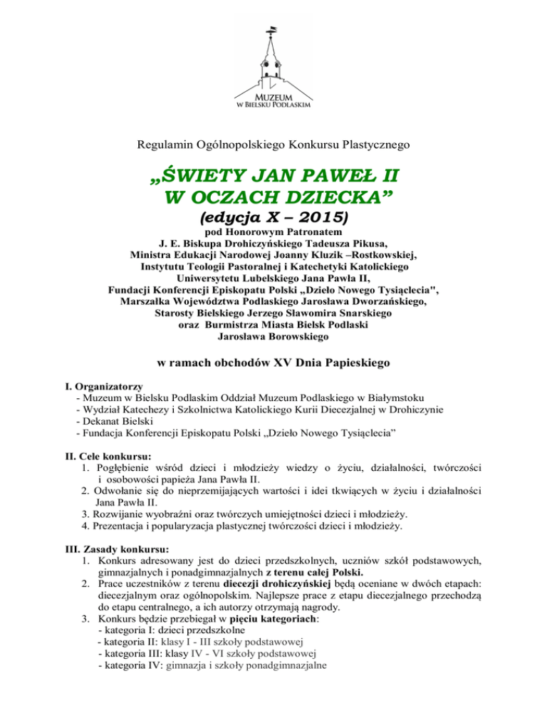 Regulamin Ogólnopolskiego Konkursu Plastycznego „ŚWIETY JAN PAWEŁ II W OCZACH DZIECKA” (edycja X – 2015) pod Honorowym Patronatem J. E. Biskupa Drohiczyńskiego Tadeusza Pikusa, Ministra Edukacji Narodowej Joanny Kluzik –Rostkowskiej, Instytutu Teologii Pastoralnej i Katechetyki Katolickiego Uniwersytetu Lubelskiego Jana Pawła II, Fundacji Konferencji Episkopatu Polski „Dzieło Nowego Tysiąclecia", Marszałka Województwa Podlaskiego Jarosława Dworzańskiego, Starosty Bielskiego Jerzego Sławomira Snarskiego oraz Burmistrza Miasta Bielsk Podlaski Jarosława Borowskiego w ramach obchodów XV Dnia Papieskiego I. Organizatorzy - Muzeum w Bielsku Podlaskim Oddział Muzeum Podlaskiego w Białymstoku - Wydział Katechezy i Szkolnictwa Katolickiego Kurii Diecezjalnej w Drohiczynie - Dekanat Bielski - Fundacja Konferencji Episkopatu Polski „Dzieło Nowego Tysiąclecia” II. Cele konkursu: 1. Pogłębienie wśród dzieci i młodzieży wiedzy o życiu, działalności, twórczości i osobowości papieża Jana Pawła II. 2. Odwołanie się do nieprzemijających wartości i idei tkwiących w życiu i działalności Jana Pawła II. 3. Rozwijanie wyobraźni oraz twórczych umiejętności dzieci i młodzieży. 4. Prezentacja i popularyzacja plastycznej twórczości dzieci i młodzieży. III. Zasady konkursu: 1. Konkurs adresowany jest do dzieci przedszkolnych, uczniów szkół podstawowych, gimnazjalnych i ponadgimnazjalnych z terenu całej Polski. 2. Prace uczestników z terenu diecezji drohiczyńskiej będą oceniane w dwóch etapach: diecezjalnym oraz ogólnopolskim. Najlepsze prace z etapu diecezjalnego przechodzą do etapu centralnego, a ich autorzy otrzymają nagrody. 3. Konkurs będzie przebiegał w pięciu kategoriach: - kategoria I: dzieci przedszkolne - kategoria II: klasy I - III szkoły podstawowej - kategoria III: klasy IV - VI szkoły podstawowej - kategoria IV: gimnazja i szkoły ponadgimnazjalne - kategoria V: szkoły specjalne. 4. Uczestnicy wykonują pracę plastyczną zgodnie z hasłem XV Dnia Papieskiego „Jan Paweł II – Patron Rodziny”. 5. Format pracy: A-2, A-3. 6. Technika wykonania dowolna: malarstwo, grafika, rysunek (płaska, bez użycia materiałów nietrwałych: plasteliny, modeliny, bibuły, kaszy itp., z możliwością eksponowania w ramie pod szkłem). 7. Na odwrocie każdej pracy należy nakleić stopkę z danymi autora pracy załączoną do regulaminu. 8. Do prac należy dołączyć kartę zgłoszenia według załączonego wzoru. 9. Prace wraz z kartą zgłoszeniową należy składać do dnia 25 IX 2015 r. osobiście w Muzeum w Bielsku Podlaskim lub listownie (decyduje data stempla pocztowego) na adres: Muzeum w Bielsku Podlaskim ul. Mickiewicza 45 17 – 100 Bielsk Podlaski 10. Prace oceni Jury powołane przez organizatorów. 11. Autorzy najciekawszych prac zostaną nagrodzeni. 12. Prace prezentowane będą na wystawie pokonkursowej w Muzeum w Bielsku Podlaskim. 13. Rozstrzygnięcie konkursu oraz otwarcie wystawy pokonkursowej odbędzie się 16.10.2015 r. o godz. 10.00 w Muzeum Bielsku Podlaskim. V. Uwagi organizatorów: 1. Praca musi być wykonana tylko przez jednego autora (prace zbiorowe nie będą brane pod uwagę). 2. Uczestnik konkursu składa tylko jedną pracę, szkoła dowolną liczbę prac. 3. Prac konkursowych nie należy podklejać ani oprawiać. 4. Prace zrolowane, zniszczone w wyniku niewłaściwego opakowania, nadesłane po terminie oraz niezgodne z regulaminem nie będą oceniane. 5. Prace konkursowe nie podlegają zwrotowi i przechodzą na własność organizatorów. Organizatorzy zastrzegają sobie prawo do ich wystawiania i nieodpłatnego reprodukowania oraz możliwość zmian w regulaminie, o których zainteresowani zostaną powiadomieni pisemnie. 6. Organizator informuje, że dyplomy będą wydawane jedynie zwycięzcom i wyróżnionym w poszczególnych kategoriach. Organizator nie przewiduje wydawania zaświadczeń oraz dyplomów za uczestnictwo w w/w konkursie. Biuro organizacyjne: Muzeum w Bielsku Podlaskim Oddział Muzeum Podlaskiego w Białymstoku Instytucja Kultury Województwa Podlaskiego ul. Mickiewicza 45 17 – 100 Bielsk Podlaski tel./fax 85 730 22 44, tel. kom. 509 336 841 e-mail: [email protected] www.muzeum.bialystok.pl