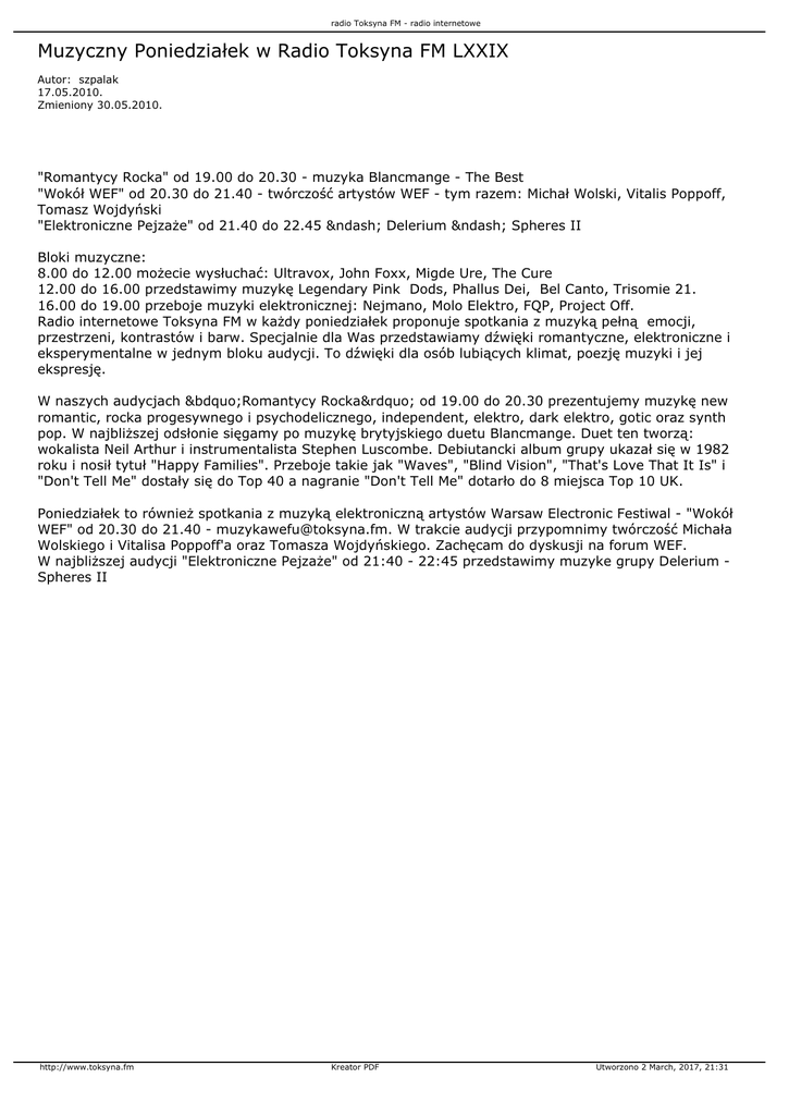 radio Toksyna FM - radio internetowe Muzyczny Poniedziałek w Radio Toksyna FM LXXIX Autor: szpalak 17.05.2010. Zmieniony 30.05.2010. "Romantycy Rocka" od 19.00 do 20.30 - muzyka Blancmange - The Best "Wokół WEF" od 20.30 do 21.40 - twórczość artystów WEF - tym razem: Michał Wolski, Vitalis Poppoff, Tomasz Wojdyński "Elektroniczne Pejzaże" od 21.40 do 22.45 – Delerium – Spheres II Bloki muzyczne: 8.00 do 12.00 możecie wysłuchać: Ultravox, John Foxx, Migde Ure, The Cure 12.00 do 16.00 przedstawimy muzykę Legendary Pink Dods, Phallus Dei, Bel Canto, Trisomie 21. 16.00 do 19.00 przeboje muzyki elektronicznej: Nejmano, Molo Elektro, FQP, Project Off. Radio internetowe Toksyna FM w każdy poniedziałek proponuje spotkania z muzyką pełną emocji, przestrzeni, kontrastów i barw. Specjalnie dla Was przedstawiamy dźwięki romantyczne, elektroniczne i eksperymentalne w jednym bloku audycji. To dźwięki dla osób lubiących klimat, poezję muzyki i jej ekspresję. W naszych audycjach „Romantycy Rocka” od 19.00 do 20.30 prezentujemy muzykę new romantic, rocka progesywnego i psychodelicznego, independent, elektro, dark elektro, gotic oraz synth pop. W najbliższej odsłonie sięgamy po muzykę brytyjskiego duetu Blancmange. Duet ten tworzą: wokalista Neil Arthur i instrumentalista Stephen Luscombe. Debiutancki album grupy ukazał się w 1982 roku i nosił tytuł "Happy Families". Przeboje takie jak "Waves", "Blind Vision", "That's Love That It Is" i "Don't Tell Me" dostały się do Top 40 a nagranie "Don't Tell Me" dotarło do 8 miejsca Top 10 UK. Poniedziałek to również spotkania z muzyką elektroniczną artystów Warsaw Electronic Festiwal - "Wokół WEF" od 20.30 do 21.40 - [email protected]. W trakcie audycji przypomnimy twórczość Michała Wolskiego i Vitalisa Poppoff'a oraz Tomasza Wojdyńskiego. Zachęcam do dyskusji na forum WEF. W najbliższej audycji "Elektroniczne Pejzaże" od 21:40 - 22:45 przedstawimy muzyke grupy Delerium Spheres II http://www.toksyna.fm Kreator PDF Utworzono 2 March, 2017, 21:31