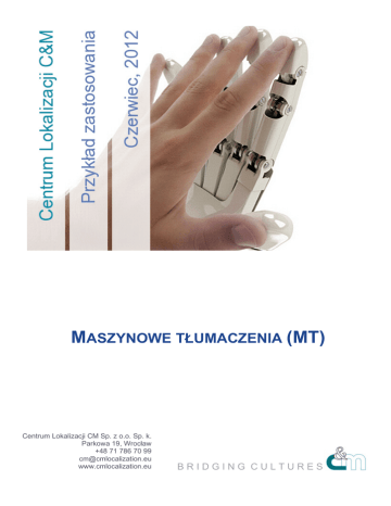 MASZYNOWE TŁUMACZENIA (MT) Centrum Lokalizacji CM Sp. z o.o. Sp. k. Parkowa 19, Wrocław +48 71 786 70 99 [email protected] www.cmlocalization.eu BRIDGING CULTURES C&M WWW.CMLOCALIZATION.EU FIRMA I SYSTEM IFS to jeden z pięciu czołowych w świecie producentów i dostawców aplikacji biznesowych. Zatrudnia ponad 3 000 pracowników i prowadzi sprzedaż w 46 krajach. System IFS Applications to zestaw ponad 60 modułów funkcjonalnych stosowanych w produkcji, zarządzaniu łańcuchem dostaw, zarządzaniu relacjami z klientem, finansach, projektowaniu, konserwacji i remontach oraz zarządzaniu zasobami ludzkimi. ZADANIE I CEL Aktualizacja polskiej wersji systemu ERP zawierała około 800 000 słów, z czego 500 000 w nowych zdaniach, niewystępujących w starszych wersjach, a więc wcześniej nietłumaczonych. Ze względu na napięte terminy wdrożeń tłumaczenie musiało być wykonane w ciągu 30 dni roboczych, a jego koszt musiał zmieścić się w budżecie, który nie pozwalał na dodatkowe opłaty za ekspresową usługę. ROZWIĄZANIE Przetłumaczenie 800 000 słów w 30 dni wymagałoby zaangażowania około 10 tłumaczy oraz kilku korektorów. Tak duży zespół nie byłby w stanie zapewnić wymaganej spójności tłumaczenia, a jego koszt nie zmieściłby się w budżecie. Dlatego firma Centrum Lokalizacji CM zdecydowała się zastosować metodę statystycznego tłumaczenia maszynowego (SMT) połączonego z korektą tekstu (postediting). Jako system komputerowego tłumaczenia zastosowano program Moses, a jako dane treningowe dotychczas przetłumaczone materiały z poprzednich wersji systemu IFS Applications o objętości około 4 milionów słów. Tak przygotowany korpus angielsko-polski został użyty jako model języka i za jego pomocą wykonano tłumaczenie całej aktualizacji systemu w ciągu kilku godzin. Następnie wykonano korektę tłumaczenia maszynowego, w której wziął udział 3-osobowy zespół korektorów wewnętrznych. Dzięki takiemu rozwiązaniu zadanie udało się wykonać terminowo, a jego koszt był o 50% niższy w stosunku do tradycyjnego tłumaczenia. KORZYŚCI Dzięki zastosowaniu statystycznego tłumaczenia maszynowego udało się osiągnąć wydajność około 30 000 słów dziennie przy zaangażowaniu tylko 3-osobowego zespołu. Klient otrzymał tłumaczenie nieodbiegające jakością od tłumaczenia tradycyjnego za 50% kosztów. Przygotowany korpus językowy może służyć do tłumaczenia kolejnych aktualizacji systemu oraz innych materiałów z tej tematyki. B R I D G I N G C U L T U R E S