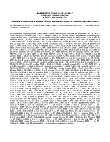 ZARZĄDZENIE NR OR-I.120.1.19.2017 PREZYDENTA MIASTA OPOLA z dnia 31 stycznia 2017 r. zmieniające zarządzenie w sprawie nadania Regulaminu organizacyjnego Urzędu Miasta Opola. Na podstawie art. 33 ust. 2 ustawy z dnia 8 marca 1990 r. o samorządzie gminnym (Dz.U. z 2016.446 ze zm.) – ustalam, co następuje: §1 W Regulaminie organizacyjnym Urzędu Miasta Opola, stanowiącym załącznik do zarządzenia Nr OR.I-015294/06 Prezydenta Miasta Opola z dnia 1 sierpnia 2006 r. w sprawie nadania Regulaminu organizacyjnego Urzędu Miasta Opola, zmienionym zarządzeniami Prezydenta Miasta Opola Nr: OR.I-0152-125/06 z dnia 29 września 2006 r., OR.I-0152-131/06 z dnia 24 października 2006 r.,OR.I-0152-20/07 z dnia 26 stycznia 2007 r., OR.I-0152-44/07 z dnia 21 marca 2007 r., OR.I-0152-47/07 z dnia 30 marca 2007 r., OR.I-0152-77/07 z dnia 30 maja 2007 r., OR.I-152-126/07 z dnia 18 września 2007 r., OR.I-0152-142/07 z dnia 30 października 2007 r., OR.I-0152-148/07 z dnia 9 listopada 2007 r., OR.I-0152-186/08 z dnia 31 stycznia 2008 r., OR.I0152-194/08 z dnia 25 lutego 2008 r., OR.I-0152-208/08 z dnia 18 marca 2008 r., OR.I-0152-219/08 z dnia 17 kwietnia 2008 r., OR.I-0152-238/08 z dnia 30 maja 2008 r., OR.I-0152-263/08 z dnia 22 lipca 2008 r., OR.I-0152-323/08 z dnia 31 października 2008 r., OR.I-0152-334/08 z dnia 27 listopada 2008 r., OR.I-0152419/09 z dnia 1 kwietnia 2009 r., OR.I-0152-438/09 z dnia 7 maja 2009 r., OR.I-0152-488/09 z dnia 12 sierpnia 2009 r., OR.I-0152-514/09 z dnia 14 października 2009 r., OR.I-0152-550/09 z dnia 17 grudnia 2009 r., OR.I-0152-560/10 z dnia 15 stycznia 2010 r., OR.I-0152-564/10 z dnia 27 stycznia 2010 r., OR.I-0152608/10 z dnia 1 kwietnia 2010 r., OR.I-0152-621/10 z dnia 30 kwietnia 2010 r., OR.I-0152-646/10 z dnia 30 czerwca 2010 r., OR.I-0152-699/10 z dnia 29 października 2010 r., OR.I-0152-1/10 z dnia 9 grudnia 2010 r., OR.I-0152-13/10 z dnia 29 grudnia 2010 r., OR.I-0152-36/11 z dnia 28 stycznia 2011 r., OR.I-0152-52/11 z dnia 10 marca 2011 r., OR.I-0152-63/11 z dnia 12 kwietnia 2011 r., OR.I-0152-74/11 z dnia 10 maja 2011 r., OR.I-0152-76/11 z dnia 13 maja 2011 r., OR.I-0152-86/11 z dnia 31 maja 2011 r., OR-I.120.1.7.2011 z dnia 15 lipca 2011 r., OR.I.120.1.11.2011 z dnia 1 sierpnia 2011 r., OR-I.120.1.20.2011 z dnia 16 sierpnia 2011 r., OR.I.120.1.36.2011 z dnia 19 września 2011 r., OR-I.120.1.53.2011 z dnia 25 października 2011 r., ORI.120.1.60.2011 z dnia 10 listopada 2011 r., OR-I.120.1.74.2011 z dnia 30 listopada 2011 r., ORI.120.1.95.2011 z dnia 30 grudnia 2011 r., OR-I.120.1.40.2012 z dnia 29 lutego 2012 r., OR-I.120.1.55.2012 z dnia 28 marca 2012 r., OR-I.120.1.70.2012 z dnia 11 maja 2012 r., OR-I.120.1.78.2012 z dnia 1 czerwca 2012 r., OR-I.120.1.92.2012 z dnia 10 lipca 2012 r.,OR-I.120.1.96.2012 z dnia 11 lipca 2012 r., ORI.120.1.107.2012 z dnia 8 sierpnia 2012 r., OR-I.120.1.117.2012 z dnia 25 września 2012 r., ORI.120.1.133.2012 z dnia 29 października 2012 r., OR-I.120.1.141.2012 z dnia 30 listopada 2012 r., ORI.120.1.153.2012 z dnia 31 grudnia 2012 r., OR-I.120.1.5.2013 z dnia 16 stycznia 2013 r., ORI.120.1.25.2013 z dnia 28 lutego 2013 r., OR-I.120.1.37.2013 z dnia 29 marca 2013 r., OR-I.120.1.63.2013 z dnia 28 maja 2013 r., OR-I.120.1.84.2013 z dnia 19 lipca 2013 r., OR-I.120.1.96.2013 z dnia 27 września 2013 r., OR-I.120.1.106.2013 z dnia 15 października 2013 r., OR-I.120.1.112.2013 z dnia 30 października 2013 r., OR-I.120.1.116.2013 z dnia 6 listopada 2013 r., OR-I.120.1.125.2013 z dnia 29 listopada 2013 r., OR-I.120.1.131.2013 z dnia 11 grudnia 2013 r., OR-I.120.1.137.2013 z dnia 30 grudnia 2013 r., ORI.120.1.5.2014 z dnia 13 stycznia 2014 r., OR-I.120.1.12.2014 z dnia 29 stycznia 2014 r., OR-I.120.1.19.2014 z dnia 19 lutego 2014 r., OR-I.120.1.27.2014 z dnia 27 marca 2014 r., OR-I.120.1.47.2014 z dnia 28 maja 2014 r., OR-I.120.1.68.2014 z dnia 27 czerwca 2014 r.,OR-I.120.1.98.2014 z dnia 1 października 2014 r., ORI.120.1.119.2014 z dnia 26 listopada 2014 r., OR-I.120.1.124.2014 z dnia 5 grudnia 2014 r., ORI.120.1.134.2014 z dnia 23 grudnia 2014 r., OR-I.120.1.26.2015 z dnia 6 marca 2015 r., OR-I.120.1.31.2015 z dnia 23 marca 2015 r., OR-I.120.1.34.2015 z dnia 31 marca 2015 r., OR-I.120.1.51.2015 z dnia 28 maja 2015 r., OR-I.120.1.69.2015 z dnia 25 sierpnia 2015 r., OR-I.120.1.73.2015 z dnia 30 września 2015 r., ORI.120.1.88.2015 z dnia 30 października 2015 r., OR-I.120.1.101.2015 z dnia 11 grudnia 2015 r., ORI.120.1.5.2016 z dnia 13 stycznia 2016 r., OR-I.120.1.9.2016 z dnia 21 stycznia 2016 r., OR-I.120.1.28.2016 z dnia 7 marca 2016 r., OR-I.120.1.36.2016 z dnia 21 marca 2016 r., OR-I.120.1.41.2016 z dnia 24 marca 2016 r., OR-I.120.1.46.2016 z dnia 31 marca 2016 r. i OR-I.120.1.66.2016 z dnia 13 czerwca 2016 r., ORI.120.1.76.2016 z dnia 29 czerwca 2016 r., Nr OR-I.120.1.118.2016 z dnia 10 listopada 2016 r. i Nr ORI.120.1.151.2016 z dnia 30 grudnia 2016 r., wprowadzam następujące zmiany: 1) § 27 otrzymuje brzmienie: „§ 27 1. Wydział Gospodarki Odpadami Komunalnymi (Symbol GOK) dzieli się na stanowiska pracy i referaty: 1) Wymiaru Opłaty, 2) Gospodarowania Odpadami Komunalnymi, 3) Nadzoru Odbioru Odpadów Komunalnych. 2. Do zakresu działania Wydziału należy: 1) realizacja zadań wynikających z ustawy o utrzymaniu czystości i porządku w gminach w zakresie gospodarowania odpadami komunalnymi, w szczególności w zakresie: a) realizowania zadań związanych z wypełnieniem przez Prezydenta Miasta Opola funkcji organu podatkowego w zakresie opłaty za gospodarowanie odpadami komunalnymi, w tym prowadzenie postępowań podatkowych, dokonywanie czynności sprawdzających z wyłączeniem kontroli podatkowych oraz postępowań podatkowych dotyczących ulg podatkowych, b) tworzenia systemu gospodarki odpadami komunalnymi wraz z przygotowaniem uchwał z tym związanych, c) zorganizowania odbierania odpadów komunalnych od właścicieli nieruchomości, na których zamieszkują mieszkańcy i na których nie zamieszkują