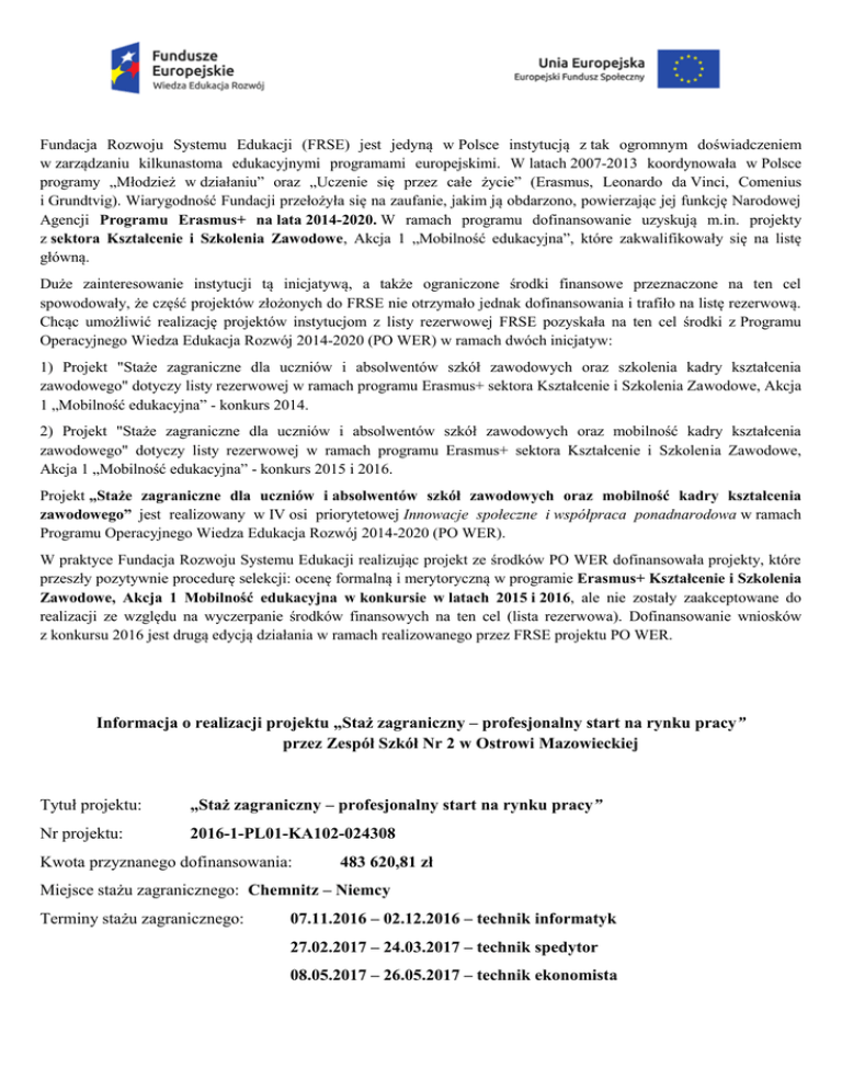 Fundacja Rozwoju Systemu Edukacji (FRSE) jest jedyną w Polsce instytucją z tak ogromnym doświadczeniem w zarządzaniu kilkunastoma edukacyjnymi programami europejskimi. W latach 2007-2013 koordynowała w Polsce programy „Młodzież w działaniu” oraz „Uczenie się przez całe życie” (Erasmus, Leonardo da Vinci, Comenius i Grundtvig). Wiarygodność Fundacji przełożyła się na zaufanie, jakim ją obdarzono, powierzając jej funkcję Narodowej Agencji Programu Erasmus+ na lata 2014-2020. W ramach programu dofinansowanie uzyskują m.in. projekty z sektora Kształcenie i Szkolenia Zawodowe, Akcja 1 „Mobilność edukacyjna”, które zakwalifikowały się na listę główną. Duże zainteresowanie instytucji tą inicjatywą, a także ograniczone środki finansowe przeznaczone na ten cel spowodowały, że część projektów złożonych do FRSE nie otrzymało jednak dofinansowania i trafiło na listę rezerwową. Chcąc umożliwić realizację projektów instytucjom z listy rezerwowej FRSE pozyskała na ten cel środki z Programu Operacyjnego Wiedza Edukacja Rozwój 2014-2020 (PO WER) w ramach dwóch inicjatyw: 1) Projekt "Staże zagraniczne dla uczniów i absolwentów szkół zawodowych oraz szkolenia kadry kształcenia zawodowego" dotyczy listy rezerwowej w ramach programu Erasmus+ sektora Kształcenie i Szkolenia Zawodowe, Akcja 1 „Mobilność edukacyjna” - konkurs 2014. 2) Projekt "Staże zagraniczne dla uczniów i absolwentów szkół zawodowych oraz mobilność kadry kształcenia zawodowego" dotyczy listy rezerwowej w ramach programu Erasmus+ sektora Kształcenie i Szkolenia Zawodowe, Akcja 1 „Mobilność edukacyjna” - konkurs 2015 i 2016. Projekt „Staże zagraniczne dla uczniów i absolwentów szkół zawodowych oraz mobilność kadry kształcenia zawodowego” jest realizowany w IV osi priorytetowej Innowacje społeczne i współpraca ponadnarodowa w ramach Programu Operacyjnego Wiedza Edukacja Rozwój 2014-2020 (PO WER). W praktyce Fundacja Rozwoju Systemu Edukacji realizując projekt ze środków PO WER dofinansowała projekty, które przeszły pozytywnie procedurę selekcji: ocenę formalną i merytoryczną w programie Erasmus+ Kształcenie i Szkolenia Zawodowe, Akcja 1 Mobilność edukacyjna w konkursie w latach 2015 i 2016, ale nie zostały zaakceptowane do realizacji ze względu na wyczerpanie środków finansowych na ten cel (lista rezerwowa). Dofinansowanie wniosków z konkursu 2016 jest drugą edycją działania w ramach realizowanego przez FRSE projektu PO WER. Informacja o realizacji projektu „Staż zagraniczny – profesjonalny start na rynku pracy” przez Zespół Szkół Nr 2 w Ostrowi Mazowieckiej Tytuł projektu: „Staż zagraniczny – profesjonalny start na rynku pracy” Nr projektu: 2016-1-PL01-KA102-024308 Kwota przyznanego dofinansowania: 483 620,81 zł Miejsce stażu zagranicznego: Chemnitz – Niemcy Terminy stażu zagranicznego: 07.11.2016 – 02.12.2016 – technik informatyk 27.02.2017 – 24.03.2017 – technik spedytor 08.05.2017 – 26.05.2017 – technik ekonomista Po raz pierwszy uczniowie Technikum nr 2 im. Powstańców Styczniowych w Zespole Szkół nr 2 w Ostrowi Mazowieckiej odbędą zagraniczną praktykę zawodową w Chemnitz w ramach programu unijnego. W stażu zagranicznym uczestniczyć będzie po 16 uczniów kształcących się w zawodach: technik informatyk, technik spedytor, technik ekonomista oraz 6 nauczycieli – opiekunów. Celem kształcenia zawodowego naszej szkoły jest przede wszystkim przygotowanie młodzieży do życia w warunkach współczesnego świata, wykonywania pracy zawodowej i aktywnego funkcjonowania na zmieniającym się rynku pracy. Kształcąc zawodowo nasza szkoła wychodzi naprzeciw zmianom społecznogospodarczym jakie miały miejsce w ostatnich latach i które dotyczą m.in. rosnącego udziału handlu międzynarodowego, mobilności geograficznej i zawodowej, nowych technik i technologii, a także wzrostu oczekiwań pracodawców w zakresie poziomu wiedzy i umiejętności pracowników. Pomysł przystąpienia do projektu powstał w wyniku diagnozy potrzeb uczniów naszej szkoły, analizy rynku pracy oraz wniosków wynikających ze współpracy szkoły z lokalnymi zakładami pracy. Chcemy, jako szkoła, sprostać wymaganiom stawianym naszym absolwentom przez lokalnych, regionalnych, a także europejskich pracodawców. Obecny pracodawca poszukuje pracowników przedsiębiorczych, mobilnych, znających języki obce oraz charakteryzujących się dużymi umiejętnościami zawodowymi, potwierdzonymi odbytą praktyką, referencjami, i międzynarodowymi certyfikatami. Nabyte doświadczenia w firmach niemieckich będą dla uczestników projektu doskonałym uzupełnieniem procesu kształcenia. Przystępując do projektu pragniemy poprawić jakość oferowanego kształcenia zawodowego w naszej szkole poprzez wspieranie uczniów w nabywaniu kompetencji (wiedzę, umiejętności i postawy) w celu poszerzenia ich możliwości rozwoju osobistego i zwiększenia szansy na zatrudnienie na europejskim rynku pracy i poza jego granicami, poprawę znajomości języka niemieckiego, zwiększenie samodzielności i otwartości. Główne cele projektu: podniesienie jakości i efektywności kształcenia zawodowego, zdobycie praktycznych umiejętności zawodowych na poziomie europejskim, wykorzystanie najnowszych technologii informacyjno-komunikacyjnych w procesie kształcenia, doskonalenie języka niemieckiego w aspekcie zawodowym, zwiększenie mobilności uczniów, zwiększenie atrakcyjności kształcenia zawodowego, poznanie dziedzictwa kulturowego Niemiec, zwiększenie szans zatrudnienia na europejskim rynku pracy. Partnerzy projektu: Beneficjent projektu - Zespół Szkół nr 2 w Ostrowi Mazowieckiej ; Partner zagraniczny - F+U Sachsen gGmbH Internationale Projekte (Rathausstraße 7, 09111 Chemnitz, Niemcy). Organizacja ta specjalizuje się w realizacji międzynarodowych projektów dla młodzieży szkolnej i studentó