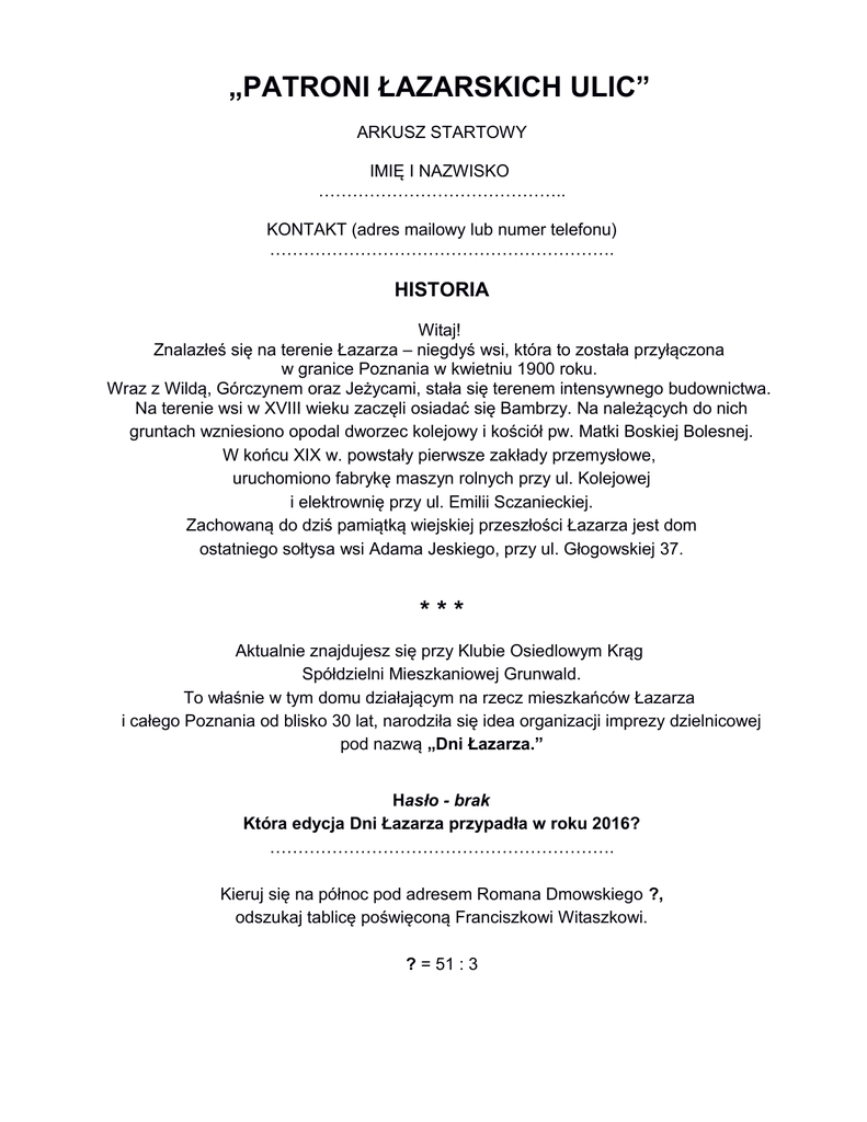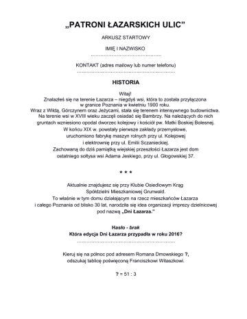 „PATRONI ŁAZARSKICH ULIC” ARKUSZ STARTOWY IMIĘ I NAZWISKO …………………………………….. KONTAKT (adres mailowy lub numer telefonu) ……………………………………………………. HISTORIA Witaj! Znalazłeś się na terenie Łazarza – niegdyś wsi, która to została przyłączona w granice Poznania w kwietniu 1900 roku. Wraz z Wildą, Górczynem oraz Jeżycami, stała się terenem intensywnego budownictwa. Na terenie wsi w XVIII wieku zaczęli osiadać się Bambrzy. Na należących do nich gruntach wzniesiono opodal dworzec kolejowy i kościół pw. Matki Boskiej Bolesnej. W końcu XIX w. powstały pierwsze zakłady przemysłowe, uruchomiono fabrykę maszyn rolnych przy ul. Kolejowej i elektrownię przy ul. Emilii Sczanieckiej. Zachowaną do dziś pamiątką wiejskiej przeszłości Łazarza jest dom ostatniego sołtysa wsi Adama Jeskiego, przy ul. Głogowskiej 37. *** Aktualnie znajdujesz się przy Klubie Osiedlowym Krąg Spółdzielni Mieszkaniowej Grunwald. To właśnie w tym domu działającym na rzecz mieszkańców Łazarza i całego Poznania od blisko 30 lat, narodziła się idea organizacji imprezy dzielnicowej pod nazwą „Dni Łazarza.” Hasło - brak Która edycja Dni Łazarza przypadła w roku 2016? ……………………………………………………. Kieruj się na północ pod adresem Romana Dmowskiego ?, odszukaj tablicę poświęconą Franciszkowi Witaszkowi. ? = 51 : 3 Hasło - 2 wers 11 litera POMOC Franciszek Józef Witaszek (ur. 08.09.1908 roku w Śmiglu, zm. 8.01.1943 roku w Poznaniu, zamordowany przez Niemców w poznańskim Forcie VII) - lekarz, w czasie II wojny światowej, członek podziemnej organizacji bojowej Ojczyzna, szef Związku Odwetu,Okręgu Poznańskiego, części Związku Walki Zbrojnej w randze kapitana czasu wojny. Pseudonimy: Warta, Kur, Myszkowski, Funiu. Odznaczony pośmiertnie Krzyżem Walecznych. Czym zasłużył się dla Łazarza Franciszek Witaszek? ……………………………………………………….. kieruj się dalej w kierunku północnym pod adres + y = o Hasło - 1 wers 7 litera *** GWARA Pytanie zadanie przetłumacz słowa: mela - ……………………………...... tytka - ……………………………....... na szagę - ………………………….... redyski - …………………………....... szneka z glancem - ……………….. kejter - ……………………………....... Obróć się o 180 stopni odczytaj adres kolejnego punktu z wiersza WERS 1 2 3 4 5 6 7 5 3 11 5 LITERA 13 3, 9 14 10 17 i 20 5, 23 4,16,17 12,13 1 5, 6,10, 22 17, 20 Hasło - 2 litera nazwiska bohatera skweru na którym się znajdujesz PRZYGODA Kazimierz Nowak ur. 11.01.1897 roku w Stryju, zm. 13.10.1937 roku w Poznaniu, polski podróżnik. W latach 1931-1936 przebył samotnie kontynent afrykański z północy na południe i z powrotem. Czterdzieści tysięcy rowerem, pieszo, konno, na wielbłądzie, czółnem oraz pociągiem. W której dekadzie XX wieku Kazimierz Nowak wyruszył do Afryki? .................................................. Kazimierz Nowak wyruszając w swoją „podróż życia” wsiadł na rower kierując się z ul. Lodowej na Rynek Łazarski i dalej ul. Małeckiego w kierunku Dworca Zachodniego. Kieruj się jego śladem! Odszukaj miejsce ze zdjęcia! Hasło - 4 zamazana litera (szyld) Antoni Małecki (ur. 16.07.1821r. w Objezierzu k. Poznania, zm. 7.10.1913 we Lwowie) - polski historyk literatury, historyk - mediewista, językoznawca, filolog klasyczny, heraldyk, dramaturg, rektor Uniwersytetu Lwowskiego, profesor uniwersytetów: Jagiellońskiego, Lwowskiego, oraz w Innsbrucku, poseł na Sejm Krajowy Galicji. Wymień trzy sąsiadujące ulice! ………......................………………......................................…... podążaj dalej ulicą A. Małeckiego, aż do ulicy „Wielkiego Ptaka”(?) Hasło - literę do hasła odnajdziesz w tej kamienicy SERCE ŁAZARZA jest to 1 litera z 3 nazwiska na domofonie klatki nr 3 SERCE ŁAZARZA Józef Struś ur. 1510 w Poznaniu, zm. 16 marca lub po 27 lipca 1568 tamże – humanista, tłumacz, nadworny lekarz Zygmunta Starego i Zygmunta Augusta, burmistrz Poznania, naukowiec wsławiony badaniami tętna. Ile wynosi tętno zdrowego człowieka? ……………………………………………. Idąc dalej ul. A. Małeckiego, skręć na zachód w kolejną przecznicę. Podaj adresy miejsc ze zdjęć ..................................................... ...................................................... .............................................................. Kierując się dalej na zachód i przekraczając ul. Głogowską wchodzimy na górny taras Łazarza. Po drodze mijamy Park Wilsona, który jest jednym z najbardziej zadbanych, a także najpiękniejszych i najciekawszych parków Poznania. Jest także najstarszym ogrodem botanicznym. Powstał w 1834 roku na terenie dawnej szkółki drzew i krzewów według projektu dyrektora Ogrodów Miejskich - Hermana Kube. Usytuowany jest między ulicami Głogowską, R. Berwińskiego, a J.Matejki, blisko dworca PKP. Zajmuje powierzchnię około 7 ha. Park podzielony jest na dwie części: geometryczną oraz krajobrazową. W części geometrycznej znajduje się palmiarnia, największa atrakcja parku, a także Muszla Koncertowa. Część krajobrazowa składa się z dwóch sztucznych stawów zasilanych przez strumień spływający z wybudowanego tam alpinarium. Stawy te zamieszkane są przez ptactwo wodne. Budynek szkolny przy ul. Berwińskiego zbudowano w latach 1903 -1 905. Historia Szkoły ściśle związana jest z założeniem w 1834r. Towarzystwa do Upiększania Miasta. Dbając o materialne i duchowe bogactwo miasta, członkowie Towarzystwa zakupili znaczne tereny, położone od ówczesnej szosy Głogowskiej po ul. Wyspiańskiego wraz z dzisiejszym Parkiem Wilsona. Na części tych terenów urządzono szkółkę drzew i krzewów. Wśród drzew najczęściej powtar