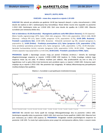 Biuletyn dzienny 20.08.2014 99 WALUTY, ZŁOTO, ROPA EUR/USD – nowe dno, wsparcie w rejonie 1.33 USD EUR/USD We wtorek po południu po godzinie 14:30 (po lepszych danych z rynku nieruchomości z USA) doszło do wybicia w dół z wielosesyjnej fazy konsolidacji. Nowe blisko roczne dno wypadło na poziomie 1.3313 USD. Zamknięcie nisko po 1.3318 USD. Dziś rano doszło do spadku do 1.3292 USD. Obecnie eurodolar jest notowany blisko dna. Dziś w kalendarzu: 01:30 (Australia) - Wystąpienie publiczne szefa RBA (Glenn Stevens), 01:50 (Japonia) Bilans handlu zagranicznego (JPY), lipiec (-964 mld, prognoza -702,5 mld, poprzednio -822,2 mld), 08:00 (Niemcy) - Inflacja PPI (r/r), lipiec (-0,8%, prognoza -0,7%, poprzednio -0,7%), 10:30 (Wlk. Brytania) Protokół z posiedzenia BoE, 12:00 (Wlk. Brytania) - Wskaźnik zamówień wg CBI, sierpień (prognoza 4, poprzednio 2), 14:00 (Polska) - Produkcja przemysłowa (r/r), lipiec (prognoza 2,2%, poprzednio 1,7%), Ceny produkcji sprzedanej przemysłu (r/r), lipiec (prognoza -1,8%, poprzednio -1,7%), 14:30 (Kanada) Sprzedaż hurtowników (m/m), czerwiec (prognoza 0,4%, poprzednio 2,2%), 16:30 (USA) - Tygodniowa zmiana zapasów ropy (poprzednio 1,4 mln brk), 20:00 (USA) - Protokół z posiedzenia FOMC, lipiec. PROGNOZA: Spadki z lipcowego szczytu mają już postać 5-falowej struktury i dotarły do ważnego długoterminowego wsparcia w rejonie 1.3290-1.3300 USD (wykres 1). Próba trwałego rozbicia tego wsparcia może się nie udać. W efekcie możliwe jest odbicie. Aby przekształciło się ono w silny 2-3 tygodniowy ruch w górę (fala 4-ta) konieczne jest przebicie oporu w rejonie 1.3340 USD. Krytyczny opór znajduje się w rejonie 1.3512 USD. Nie powinien być osiągnięty. W dalszej kilkumiesięcznej perspektywie możliwa kolejna fala spadków. Wykres 1. Eurodolar w perspektywie średnioterminowej GBP/USD We wtorek kurs funta spadł do nowego kilkutygodniowego dna na poziomie 1.6611 USD. Zamknięcie wypadło nisko na poziomie 1.6615 USD. Dziś rano kurs funta spadł do 1.6601 USD. Obecnie funt jest notowany po 1.6615 USD (wykres 2). PROGNOZA: Osiągnięte zostało psychologiczne wsparcie na poziomie 1.66 USD. To może być wykorzystane przez popyt do zainicjowania odbicia, które z czasem może Strona 1 Biuletyn dzienny 20.08.2014 99 się przekształcić w trwalsze 2-3 tygodniowe odbicie. Po jego zakończeniu możliwa kolejna kilkutygodniowa fala spadków. Wykres 2. Funt w relacji do dolara (GBP/USD) USD/JPY We wtorek kurs dolara przebił opór w rejonie 102.70 JPY, dzienne maksimum wypadło na poziomie 102.93 JPY. W środę osiągnięty został kolejny szczyt na poziomie 103.33 JPY, obecnie dolar jest notowany blisko szczytu (wykres 3). PROGNOZA: Próba trwałego przełamania oporu w rejonie 103.07 JPY może się nie udać. W dalszej perspektywie oczekuję na mocniejszy 2-3 tygodniowy ruch w dół. Wykres 3. Dolar amerykański w relacji do jena (USD/JPY) USD/PLN We wtorek kurs dolara wzrósł do poziomu 3.1422 PLN, zamknięcie po 3.1371 PLN. Dziś rano doszło do wzrostu do 3.1448 PLN, obecnie dolar jest notowany po 3.1422 PLN. PROGNOZA: Kilkutygodniowa fala wzrostów może przyjąć postać 5-falowej struktury (wykres 4). W krótkim Strona 2 Biuletyn dzienny 20.08.2014 99 kilkusesyjnym terminie możliwy jest jeszcze jeden szczyt i niewielkie przekroczenie oporu w rejonie 3.153.16 PLN. Potem gdy rozpocznie się trwalsze odbicie na eurodolarze możliwe są korekcyjne spadki na wykresie USD/PLN. Wsparcie znajduje się w rejonie 3.10-3.11 PLN. Potem możliwy jest jeszcze jeden szczyt. Wykres 4. Dolar amerykański w relacji do złotego (USD/PLN) Kontrakty CFD na złoto We wtorek kurs złota spadł do poziomu 1293.90 USD, pod koniec dnia doszło do niewielkiego odbicia, zamknięcie po 1295.47 USD. Obecnie złoto jest notowane po 1293.10 USD (wykres 5). PROGNOZA: Krótkoterminowe ważne wsparcie znajduje się w rejonie 1294 USD. W krótkim terminie możliwe jest odbicie. Jest ryzyko, ze może być ono korekcyjne. W takim razie kolejny test wsparcia na 1294 USD może przynieść jego przełamanie. Wtedy możliwy jest powrót na lipcowy dołek. Wykres 5. Kontrakty CFD na złoto Strona 3 Biuletyn dzienny 20.08.2014 99 Kontrakty CFD na ropę We wtorek kurs ropy spadł do poziomu 92.66 USD, zamknięcie nisko po 92.83 USD. Obecnie ropa jest notowana po 92.92 USD (wykres 6). Wykres 6. Kontrakty CFD na ropę PROGNOZA: Długoterminowe dołki są w okolicy 91.30-93.20 USD. Za kilka sesji może dojść do przesilenia i rozpocznie się mocniejsze wielosesyjne odbicie znoszące np. 38% spadków z tegorocznego szczytu. Sławomir Dębowski Dział Analiz Globtrex.com / Felson.pl Prezentowany komentarz został przygotowany w celach informacyjnych i nie stanowi rekomendacji w rozumieniu przepisów Rozporządzenia Ministra Finansów z dnia 19 października 2005r. (Dz.U. 2005, poz. 206 nr 1715) oraz Ustawy z dnia 29 lipca 2005r. (Dz.U. 2005, Nr 183, poz. 1538 z późn. zm.). Przedstawiony raport jest wyrazem wiedzy i poglądów autora według stanu na dzień sporządzenia i w żadnym wypadku nie może być podstawą działań inwestycyjnych. Inwestorzy powinni mieć swoją własną ocenę co do właściwości i celowości inwestowania w którykolwiek z wymienianych instrumentów finansowych, opartą na analizie danego instrumentu, ryzyka z nim związanego, ich własnej strategii inwestycyjnej oraz przy uwzględnieniu ich prawnej, podatkowej i finansowej sytuacji. Strona 4