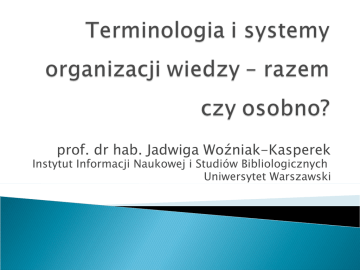 prof. dr hab. Jadwiga Woźniak-Kasperek Instytut Informacji Naukowej i Studiów Bibliologicznych Uniwersytet Warszawski ▸ ▸ ▸ Rola języka i semantyki w procesach reprezentowania i wyszukiwania treści Możliwości współczesnych koncepcji terminologicznych dla organizacji wiedzy i systemów organizacji wiedzy Plusy i minusy systemów o kontrolowanej semantyce 2 3 Praktykowaniu komunikacji jednocześnie jest barierą w dostępie do treści Wyrażaniu myśli i uczuć Organizowaniu i trasmitowaniu informacji i wiedzy 4 5 ▸ ▸ ▸ czyjeś wyobrażenie o czymś wyobrażenie niezmysłowe (umysłowa reprezentacja rzeczywistości) treść nazwy lub sposób rozumienia wyrażenia (znaczenie) 6 7 Pojęć używamy w różnych funkcjach poznawczych (myślenie, pamiętanie, rozumowanie, komunikowanie językowe). Jeśli brakuje umysłowej reprezentacji pewnego fragmentu rzeczywistości, fragment ten dla nas nie istnieje. Pojęcia, które dokonują podziału rzeczywistości na sensowne jednostki, noszą nazwę kategorii. 8 a) b) c) każdy umysł ujmuje rzeczywistość w kategorie jednostek i ich zespołów; częściowo kategorie są wynikiem konwencji, częściowo – cech osobniczych; odbijają się w języku. 9 10 11 12 Indeksując, staramy się dokonać swoistego mapowania struktury pojęciowo-kategorialnej na analogiczną strukturę stosowanego systemu organizacji wiedzy. 13 Współczesne koncepcje terminologiczne 14 F. Gaudin, early 90's 15 M. T. Cabré Castellví 16 Zakłada, że język uczestniczy w pojmowaniu rzeczywistości,rzeczywistość jest częściowo obecna w umyśle i że nie da się oddzielić rozumienia języka od rozumienia świata. ▸ Duży nacisk kładzie na organizację pojęć (głównie w postaci kategorii prototypowych). ▸ R. Temmerman, ok. 2000 17 1) 2) Znaczenie węższe ≈ teoria i praktyka JIW Znaczenie szersze ≈ semantyka opisu świata, uwarunkowania epistemologiczne i ontologiczne, badanie struktur konceptualnych, badanie społecznych procesów organizacji wiedzy oraz odwzorowanych w niej struktur rzeczywistości. 18 1) 2) 3) Pragmatyczne = ukierunkowane na dostosowanie struktur organizacji wiedzy do aktualnych czynników związanych z ich stosowaniem; Epistemologiczne = oparte na zgodnym stanowisku naukowym, edukacyjnym, kulturowym; Ontologiczne = ukierunkowane na odwzorowanie w strukturze organizacji wiedzy struktury obiektów i zjawisk, których wiedza ta dotyczy. 19 ▸ ▸ ▸ ▸ zróżnicowane co do zakresu tematycznego, cech strukturalnych i użytkowych w różny sposób przystosowane do zastosowania w środowisku cyfrowym kontrolujące semantykę do przejęcia i po ew. zmodyfikowaniu do zastosowania w wielu innych domenach 20 Dzisiaj struktura modelu SOW na ogół odwołuje się do idei wieloaspektowej, fasetowej organizacji pojęć (nie tematów, zagadnień czy wyrażeń). Postkoordynacyjne modele indeksowania, wyszukiwania i nawigowania fasetowego wykorzystujące wskazywane przez użytkownika kryteria relewancji są podstawą tzw. discovery tools. 21 Systemy organizacji wiedzy są dobrym punktem wyjścia do budowania ontologii. 22 Zalety: a)Kontrolują semantykę, tworząc wspólną płaszczyznę komunikacji b)Organizują pola semantyczne c)Ułatwiają wyszukiwanie informacji Wady: a)Niekiedy zbyt daleko posunięta kontrola (sztuczność) b)Niekiedy zbyt mało ekwiwalentów wyszukiwawczych c)W wielu wypadkach nieintuicyjna gramatyka 23 Słowa kluczowe Tagi 24 Zalety: Intuicyjna gramatyka Otwarty słownik 25 Ważniejsze wady: Brak kontroli pojęć synonimicznych i bliskoznacznych Brak kontroli ekwiwalencji wyszukiwawczej różnych pojęć i ich kategorii Brak kontroli wieloznaczności nazw pospolitych i wielodenotacyjności nazw własnych Brak możliwości oznaczania relacji pomiędzy słowami kluczowymi 26 Tezaurus to słownik języka deskryptorowego przeznaczony do indeksowania obiektów (tezaurus indeksujący), ich wyszukiwania (tezaurus wyszukiwawczy) lub jednego i drugiego. 27 Definiują pojęcia (choć nie zawsze wprost) ▸ Pokazują synonimy (relacja same as) ▸ i inne relacje, np. antonimii (opposite of) czy hierarchii (broader than, narrower than) ▸ Często porządkują pojęcia w postaci taksonomii ▸ 28 1. 2. 3. 4. Być otwartym - na nową wiedzę naukową, nowe rozwiązania technologiczne, nowe zachowania i normy społeczne. Nie ulegać stereotypom i naiwnemu obrazowi świata Nie ulegać pokusie fałszywie pojmowanej innowacyjności Mierzyć zamiary według sił 29