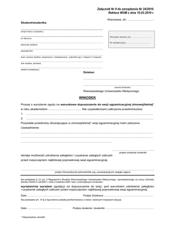 Załącznik Nr 9 do zarządzenia Nr 24/2010. Rektora WUM z dnia 10.03.2010 r. Warszawa, dn. ……………………… Student/studentka ………………………………………………………………………… (imię/ imiona i nazwisko) ………………………………………………………………………… (nr albumu) …………………………………………………………………………………………… (kierunek studiów) Wniosek złożony dn. …………………… Nr ewidencyjny:.………………………… …………………………………………………………………………………………… (specjalność) …………………………………………………………………………………………… (tryb i poziom studiów: stacjonarne / niestacjonarne , jednolite mgr / I stopnia / II stopnia) …………………………………………………………………………………………… (rok studiów, semestr) …………………………………………………………………………………………… (telefon kontaktowy) Dziekan …………………………………………………………..…. ……………………………………………………………… (nazwa Wydziału) Warszawskiego Uniwersytetu Medycznego WNIOSEK Proszę o wyrażenie zgody na warunkowe dopuszczenie do sesji egzaminacyjnej zimowej/letniej* w roku akademickim ……………………………. Nie uzyskałem(am) zaliczenia przedmiotu(ów): 1. ……………………………………………………………..………………………………………………….. 2. …………………………………………………………………………………………………………………. Pozostałe przedmioty obowiązujące w zimowej/letniej* sesji egzaminacyjnej mam zaliczone. Uzasadnienie: ……………………………………………………………………………………………………………………… ……………………………………………………………………………………………………………………… ………………………………………………………………………………… ……………………………………. podpis studenta/ studentki Istnieje możliwość odrobienia zaległości i uzyskania zaległych zaliczeń przed rozpoczęciem najbliższej poprawkowej sesji egzaminacyjnej. ………………………………………………………………………………………………………………………. podpis Kierownika/ów jednostki/tek org. prowadzącej/ych zaległe zajęcia Na podstawie § 13 ust. 5 Regulaminu Studiów Warszawskiego Uniwersytetu Medycznego, wprowadzonego na mocy Uchwały Senatu WUM nr 22/2007 z dnia 2 kwietnia 2007 roku z późniejszymi zmianami, wyrażam/nie wyrażam zgodę(y) na dopuszczenie do sesji, pod warunkiem odrobienia zaległości i uzyskania zaległych zaliczeń przed rozpoczęciem najbliższej poprawkowej sesji egzaminacyjnej. Data ………………………………… Podpis Dziekana …………………………………………..…… Na podstawie art. 14 § 2 kpa strona została poinformowana o treści i istotnych motywach decyzji. Data …………………………………. * Niepotrzebne skreślić. Podpis studenta / studentki ………………………….……………………