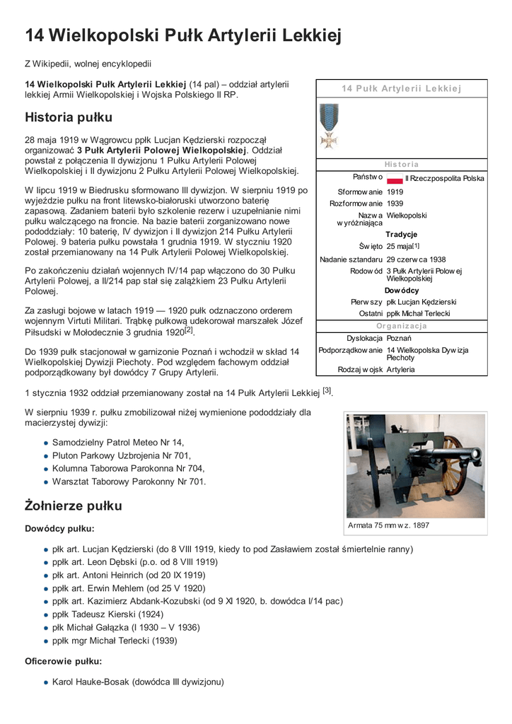 14 Wielkopolski Pułk Artylerii Lekkiej Z Wikipedii, wolnej encyklopedii 14 Wielkopolski Pułk Artylerii Lekkiej (14 pal) – oddział artylerii lekkiej Armii Wielkopolskiej i Wojska Polskiego II RP. 14 P uł k Artyl e ri i Le kki e j Historia pułku 28 maja 1919 w Wągrowcu ppłk Lucjan Kędzierski rozpoczął organizować 3 Pułk Artylerii Polowej Wielkopolskiej. Oddział powstał z połączenia II dywizjonu 1 Pułku Artylerii Polowej Wielkopolskiej i II dywizjonu 2 Pułku Artylerii Polowej Wielkopolskiej. W lipcu 1919 w Biedrusku sformowano III dywizjon. W sierpniu 1919 po wyjeździe pułku na front litewsko-białoruski utworzono baterię zapasową. Zadaniem baterii było szkolenie rezerw i uzupełnianie nimi pułku walczącego na froncie. Na bazie baterii zorganizowano nowe pododdziały: 10 baterię, IV dywizjon i II dywizjon 214 Pułku Artylerii Polowej. 9 bateria pułku powstała 1 grudnia 1919. W styczniu 1920 został przemianowany na 14 Pułk Artylerii Polowej Wielkopolskiej. His t o r ia Państw o Sformow anie 1919 Rozformow anie 1939 Nazw a Wielkopolski w yróżniająca Tradycje Św ięto 25 maja[1] Nadanie sztandaru 29 czerw ca 1938 Po zakończeniu działań wojennych IV/14 pap włączono do 30 Pułku Artylerii Polowej, a II/214 pap stał się zalążkiem 23 Pułku Artylerii Polowej. Rodow ód 3 Pułk Artylerii Polow ej Wielkopolskiej Dow ódcy Pierw szy płk Lucjan Kędzierski Za zasługi bojowe w latach 1919 — 1920 pułk odznaczono orderem wojennym Virtuti Militari. Trąbkę pułkową udekorował marszałek Józef Piłsudski w Mołodecznie 3 grudnia 1920[2]. Do 1939 pułk stacjonował w garnizonie Poznań i wchodził w skład 14 Wielkopolskiej Dywizji Piechoty. Pod względem fachowym oddział podporządkowany był dowódcy 7 Grupy Artylerii. II Rzeczpospolita Polska Ostatni ppłk Michał Terlecki Or g an iz acja Dyslokacja Poznań Podporządkow anie 14 Wielkopolska Dyw izja Piechoty Rodzaj w ojsk Artyleria 1 stycznia 1932 oddział przemianowany został na 14 Pułk Artylerii Lekkiej [3]. W sierpniu 1939 r. pułku zmobilizował niżej wymienione pododdziały dla macierzystej dywizji: Samodzielny Patrol Meteo Nr 14, Pluton Parkowy Uzbrojenia Nr 701, Kolumna Taborowa Parokonna Nr 704, Warsztat Taborowy Parokonny Nr 701. Żołnierze pułku Dowódcy pułku: Armata 75 mm w z. 1897 płk art. Lucjan Kędzierski (do 8 VIII 1919, kiedy to pod Zasławiem został śmiertelnie ranny) ppłk art. Leon Dębski (p.o. od 8 VIII 1919) płk art. Antoni Heinrich (od 20 IX 1919) ppłk art. Erwin Mehlem (od 25 V 1920) ppłk art. Kazimierz Abdank-Kozubski (od 9 XI 1920, b. dowódca I/14 pac) ppłk Tadeusz Kierski (1924) płk Michał Gałązka (I 1930 – V 1936) ppłk mgr Michał Terlecki (1939) Oficerowie pułku: Karol Hauke-Bosak (dowódca III dywizjonu) Zygmunt Kapsa Andrzej Kopa (nadetatowy) Antoni Wereszczyński (zastępca dowódcy pułku) Obsada personalna pułku we wrześniu 1939 dowódca pułku – ppłk mgr Michał Terlecki (pokojowy I zastępca dowódcy pułku) adiutant - por. Mikołaj Ignatowicz oficer zwiadowczy - ppor.Witold Lipiński oficer łączności - por.Jerzy Kulik oficer broni - ppor.inż. Józef Franciszek Ksawery Zoll pluton topograficzno - ogniowy - ppor.Stefan Burzyński dowódca I dywizjonu (12 armat 75 mm) – mjr Jan Kowalski 1 bateria - por.Jan Bronikowski 2 bateria - kpt.Zygmunt Lisowski 3 bateria - kpt.Zygmunt Piechocki dowódca II dywizjonu (12 armat 75 mm) – mjr Leszek Lubicz-Nycz 4 bateria - kpt.Marian Żuliński 5 bateria - kpt.Aleksander Lichoń 6 bateria - kpt.Stanisław Morawski dowódca III dywizjonu (12 haubic 100 mm)– mjr Jan Szwed (pokojowy II zastępca dowódcy pułku) 7 bateria - kpt.Mieczysław Hrabowski 8 bateria - por.Wojciech Nieciengiewicz 9 bateria - kpt.Franciszek Oleszczuk Odznaczeni srebrnym krzyżem Orderu „Virtuti Militari” V klasy za wojnę 1918-1920 Spis utw orzony na podstaw ie "Zarys historji w ojennej 14-go pułku artylerii polow ej" s. 31-32 st. ogn. Stanisław Bobkiewicz ogn. Józef Bodył kpr. Franciszek Boroch mjr Edward Brzeski plut. Józef Buczkowski ppłk Leon Dębski ppor. Wacław Gadomski ppor. Ludwik Gromczakiewicz kan. Aleksander Gawroński por. Karol Grocholski plut. Józef Grzesiak kpt. Karol Hauke plut. Marcin Ignasiak kpr. Bronisław Jędrzejewski ppor. Marian Jasiński plut. Antoni Kaczmarek bomb. Lech Kozielski ppor. Zygmunt Krystofiak kpr. Stanisław Majewski kpt. Zdzisław Orłowski ppor. Ignacy Ozdowski ogn. Józef Ostrowski por. Jan Pałubicki ppor. Ryszard Sypniewski ogn. Franciszek Schoener kpr. Józef Sikora bomb. Jan Szymański kpt. Wacław Świeciński ppor. Leon Wolf Symbole pułkowe Sztandar Nadanie sztandaru i zatwierdzenie jego wzoru ujęte zostało w Dodatku Tajnym nr 6 do Dziennika Rozkazów MSWojsk. z 5 maja 1938, nr 6, poz. 68. W środę 29 czerwca 1938 w Poznaniu, na placu ćwiczeń artylerii, na Golęcinie-Sołaczu gen. dyw. Juliusz Rómmel, w imieniu Prezydenta RP, wręczył dowódcy pułku sztandar ufundowany przez społeczeństwo Miasta Poznania. W trakcie ceremonii gen. Rómmel zdjął z trąbki pułkowej krzyż VM i przypiął do sztandaru [4]. Tego samego dnia sztandary otrzymały także: 17 pal, 25 pal, 7 pac, 7 dak i 7 daplot. Wszystkie sztandary Tego samego dnia sztandary otrzymały także: 17 pal, 25 pal, 7 pac, 7 dak i 7 daplot. Wszystkie sztandary poświęcone zostały przez biskupa polowego Józefa Gawlinę. Ceremonia zakończona została defiladą, którą prowadził dowódca 7 Grupy Artylerii, płk art. Michał Jancewicz. Odznaka Odznaka zatwierdzona Dz. Rozk. MSWojsk. nr 21, poz. 313 z 27 maja 1924 roku. Posiada kształt krzyża maltańskiego z ramionami pokrytymi emalią ciemnozieloną i czarną ze złoconymi krawędziami. W środku, na siedmiobocznej tarczy emaliowanej w kolorze białym numer i inicjały 14 PAP. Między ramionami krzyża lufy armatnie z wizerunkiem orłów na dolnych częściach. Jednoczęściowa - oficerska, wykonana w srebrze, emaliowana i złocona. Wymiary: 