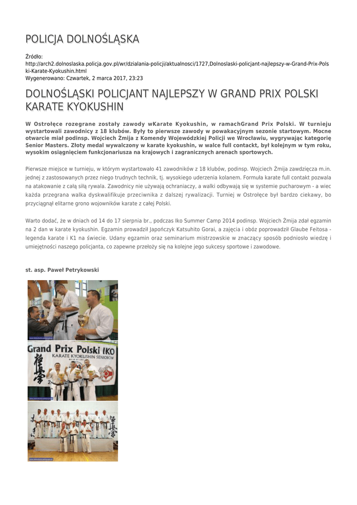 POLICJA DOLNOŚLĄSKA Źródło: http://arch2.dolnoslaska.policja.gov.pl/wr/dzialania-policji/aktualnosci/1727,Dolnoslaski-policjant-najlepszy-w-Grand-Prix-Pols ki-Karate-Kyokushin.html Wygenerowano: Czwartek, 2 marca 2017, 23:23 DOLNOŚLĄSKI POLICJANT NAJLEPSZY W GRAND PRIX POLSKI KARATE KYOKUSHIN W Ostrołęce rozegrane zostały zawody wKarate Kyokushin, w ramachGrand Prix Polski. W turnieju wystartowali zawodnicy z 18 klubów. Były to pierwsze zawody w powakacyjnym sezonie startowym. Mocne otwarcie miał podinsp. Wojciech Żmija z Komendy Wojewódzkiej Policji we Wrocławiu, wygrywając kategorię Senior Masters. Złoty medal wywalczony w karate kyokushin, w walce full contackt, był kolejnym w tym roku, wysokim osiągnięciem funkcjonariusza na krajowych i zagranicznych arenach sportowych. Pierwsze miejsce w turnieju, w którym wystartowało 41 zawodników z 18 klubów, podinsp. Wojciech Żmija zawdzięcza m.in. jednej z zastosowanych przez niego trudnych technik, tj. wysokiego uderzenia kolanem. Formuła karate full contakt pozwala na atakowanie z całą siłą rywala. Zawodnicy nie używają ochraniaczy, a walki odbywają się w systemie pucharowym - a wiec każda przegrana walka dyskwalifikuje przeciwnika z dalszej rywalizacji. Turniej w Ostrołęce był bardzo ciekawy, bo przyciągnął elitarne grono wojowników karate z całej Polski. Warto dodać, że w dniach od 14 do 17 sierpnia br., podczas Iko Summer Camp 2014 podinsp. Wojciech Żmija zdał egzamin na 2 dan w karate kyokushin. Egzamin prowadził Japończyk Katsuhito Gorai, a zajęcia i obóz poprowadził Glaube Feitosa legenda karate i K1 na świecie. Udany egzamin oraz seminarium mistrzowskie w znaczący sposób podniosło wiedzę i umiejętności naszego policjanta, co zapewne przełoży się na kolejne jego sukcesy sportowe i zawodowe. st. asp. Paweł Petrykowski Ocena: 0/5 (0) Tweetnij