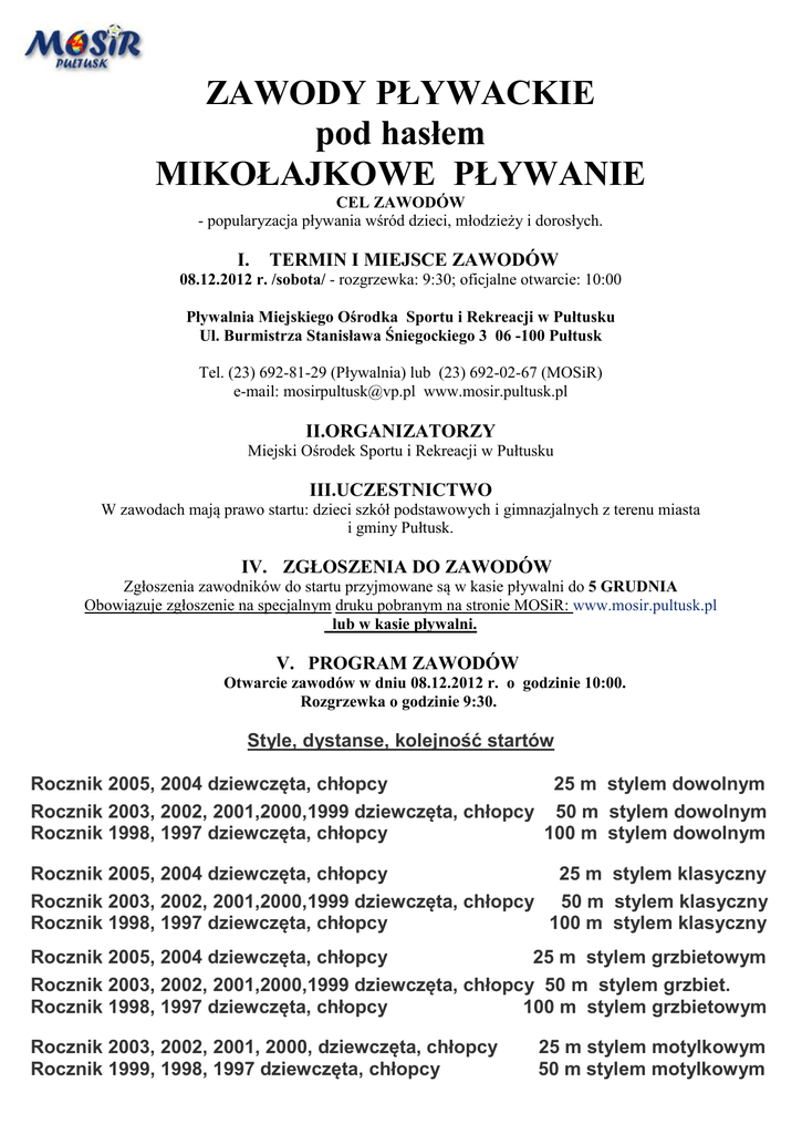 ZAWODY PŁYWACKIE pod hasłem MIKOŁAJKOWE PŁYWANIE CEL ZAWODÓW - popularyzacja pływania wśród dzieci, młodzieży i dorosłych. I. TERMIN I MIEJSCE ZAWODÓW 08.12.2012 r. /sobota/ - rozgrzewka: 9:30; oficjalne otwarcie: 10:00 Pływalnia Miejskiego Ośrodka Sportu i Rekreacji w Pułtusku Ul. Burmistrza Stanisława Śniegockiego 3 06 -100 Pułtusk Tel. (23) 692-81-29 (Pływalnia) lub (23) 692-02-67 (MOSiR) e-mail: [email protected] www.mosir.pultusk.pl II.ORGANIZATORZY Miejski Ośrodek Sportu i Rekreacji w Pułtusku III.UCZESTNICTWO W zawodach mają prawo startu: dzieci szkół podstawowych i gimnazjalnych z terenu miasta i gminy Pułtusk. IV. ZGŁOSZENIA DO ZAWODÓW Zgłoszenia zawodników do startu przyjmowane są w kasie pływalni do 5 GRUDNIA Obowiązuje zgłoszenie na specjalnym druku pobranym na stronie MOSiR: www.mosir.pultusk.pl lub w kasie pływalni. V. PROGRAM ZAWODÓW Otwarcie zawodów w dniu 08.12.2012 r. o godzinie 10:00. Rozgrzewka o godzinie 9:30. Style, dystanse, kolejność startów Rocznik 2005, 2004 dziewczęta, chłopcy 25 m stylem dowolnym Rocznik 2003, 2002, 2001,2000,1999 dziewczęta, chłopcy 50 m stylem dowolnym Rocznik 1998, 1997 dziewczęta, chłopcy 100 m stylem dowolnym Rocznik 2005, 2004 dziewczęta, chłopcy 25 m stylem klasyczny Rocznik 2003, 2002, 2001,2000,1999 dziewczęta, chłopcy 50 m stylem klasyczny Rocznik 1998, 1997 dziewczęta, chłopcy 100 m stylem klasyczny Rocznik 2005, 2004 dziewczęta, chłopcy 25 m stylem grzbietowym Rocznik 2003, 2002, 2001,2000,1999 dziewczęta, chłopcy 50 m stylem grzbiet. Rocznik 1998, 1997 dziewczęta, chłopcy 100 m stylem grzbietowym Rocznik 2003, 2002, 2001, 2000, dziewczęta, chłopcy Rocznik 1999, 1998, 1997 dziewczęta, chłopcy 25 m stylem motylkowym 50 m stylem motylkowym VI. PRZEPISY TECHNICZNE - Zawody przeprowadzone będą seriami na czas. - Każdy zawodnik ma prawo startu w dwóch konkurencjach indywidualnych. - Długość pływalni: 25 metrów, 6 torów; temperatura wody: 27 stopni C. - Pomiar czasu: ręczny. - Głębokość wody - 180 - 135 cm VII. NAGRODY Fundatorzy nagród: Miejski Ośrodek Sportu i Rekreacji, Uczniowski Klub Sportowy „Posejdon”, Szkoła Pływania „ DELFIN” VIII. ZASADY FINANSOWANIA Koszty organizacyjne zawodów pokrywa organizator. IX. POSTANOWIENIA KOŃCOWE Podczas zawodów obowiązują przepisy FINA i PZP. W sprawach spornych decyzje w dniu zawodów podejmuje Sędzia Główny Zawodów. Regulamin opracował: Józef Gryc Dyrektor MOSiR