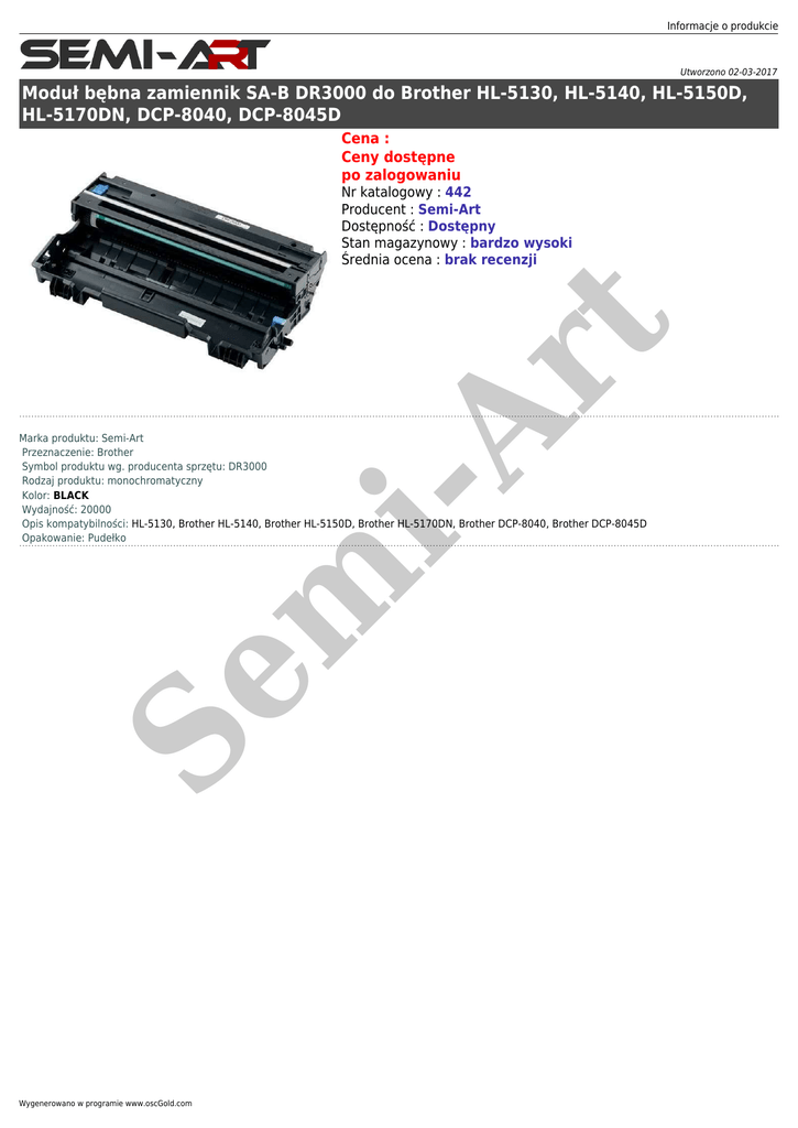 Informacje o produkcie Utworzono 02-03-2017 Moduł bębna zamiennik SA-B DR3000 do Brother HL-5130, HL-5140, HL-5150D, HL-5170DN, DCP-8040, DCP-8045D Cena : Ceny dostępne po zalogowaniu Ar t Nr katalogowy : 442 Producent : Semi-Art Dostępność : Dostępny Stan magazynowy : bardzo wysoki Średnia ocena : brak recenzji Se m i- Marka produktu: Semi-Art Przeznaczenie: Brother Symbol produktu wg. producenta sprzętu: DR3000 Rodzaj produktu: monochromatyczny Kolor: BLACK Wydajność: 20000 Opis kompatybilności: HL-5130, Brother HL-5140, Brother HL-5150D, Brother HL-5170DN, Brother DCP-8040, Brother DCP-8045D Opakowanie: Pudełko Wygenerowano w programie www.oscGold.com