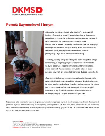 Pomóż Szymonkowi i Innym „Mamusiu, nie płacz. Jesteś taka dzielna” – to słowa 3,5 letniego Szymonka, który 22 września usłyszał diagnozę – przewlekła choroba ziarniniakowa. Jedyną szansą na powrót do zdrowia jest dla niego przeszczepienie szpiku. Mama, tata, a nawet 15-miesięczny brat Wojtek nie mogą być dla Niego lekarstwem. Jedyną osobą, która może mu teraz uratować życie jest jego niespokrewniony „bliźniak genetyczny”. Być może jesteś nim właśnie Ty. Ten mały, dzielny chłopiec odłożył na półkę wszystkie swoje samochody, a spędzając życie w szpitalnej sali nie może na żywo podziwiać koparek i traktorów, które wzbudzają w nim zachwyt. Nadal marzy o tym, żeby pójść w ślady swojego taty i tak jak on zostać kierowcą dużego samochodu. „Zawsze myślałam, że przeszczep szpiku nie dotyczy mnie ani moich bliskich, a w ciągu kilku miesięcy dowiedziałam się, że mam nieuleczalnie chore dziecko i jedyną szansą dla niego jest przeszczep komórek macierzystych. Proszę, przyjdź i zarejestruj się. Życie Szymonka i Innych zależy teraz od Twojej decyzji.” – apeluje mama Szymonka. Rejestracja jako potencjalny dawca to przeprowadzenie wstępnego wywiadu medycznego, wypełnienie formularza i pobranie wymazu z błony śluzowej z wewnętrznej strony policzka, lub 4 ml krwi, która jest niezbędna do określenia cech zgodności antygenowej. Faktycznym dawcą zostaniesz wtedy, gdy okaże się, że posiadasz takie same cechy zgodności antygenowej, jak chory pacjent. Rejestracja potencjalnych dawców szpiku odbędzie się: 18.12.2016 r. (niedziela) godz. 10:00 – 16:00 Miejsce 1: Zespół Szkół w Rudzie Talubskiej (ul. Akacjowa 10, Ruda Talubska) Miejsce 2: Publiczna Szkoła Podstawowa im. Władysława Jóźwickiego w Górznie (Górzno 109, Górzno) Miejsce 3: Urząd Gminy Garwolin (ul. Mazowiecka 16, Garwolin) Chory na nowotwór krwi dostaje szansę na nowe życie, kiedy dochodzi do przeszczepu komórek macierzystych od zgodnego genetycznie, niespokrewnionego dawcy. Istnieją dwa sposoby pobrania komórek macierzystych. Pobranie komórek macierzystych z krwi obwodowej - stosowane w ok. 80% przypadków Przed pobraniem przez 5 dni Dawca przyjmuje czynnik wzrostu G-CSF, aby zwiększyć ilość komórek macierzystych w krwi obwodowej. Jest to substancja produkowana również naturalnie w organizmie człowieka w momencie przechodzenia infekcji. Podczas przyjmowania czynnika mogą wystąpić objawy grypopodobne. Komórki pobiera się metodą zwaną aferezą. W dniu pobrania na obu przedramionach Dawcy zakładane są dojścia dożylne. Krew przepływa z jednego ramienia poprzez tzw. separator komórek i wraca drugim dojściem dożylnym do organizmu. Zabieg nie wymaga hospitalizacji i trwa około 3-4 godziny. Metoda ta znana jest na świecie od 1998 roku. Według obecnego stanu badań ryzyko wystąpienia odległych w czasie efektów ubocznych jest nieznane. Pobranie szpiku kostnego z talerza kości biodrowej – stosowane w ok. 20% przypadków Od znajdującego się pod narkozą Dawcy pobiera się z talerza kości biodrowej (nie jest to rdzeń kręgowy) ok. jednego litra mieszaniny szpiku kostnego i krwi. Mieszanina zawiera ok. 5% szpiku kostnego, regenerującego się całkowicie w organizmie w ciągu ok. dwóch tygodni. Dawca przyjmowany jest na oddział zwykle dzień przed pobraniem szpiku. W szpitalu pozostaje 2-3 dni, a jedyne zagrożenie ogranicza się do powszechnego ryzyka związanego z podaniem narkozy. Po pobraniu szpiku istnieje możliwość wystąpienia miejscowego bólu, podobnego do stłuczenia, który po kilku dniach mija. Decyzja o wyborze jednej z powyższych metod pobrania komórek macierzystych uzależniona jest od stanu zdrowia Pacjenta oraz od decyzji jego lekarza prowadzącego. W miarę możliwości brane są pod uwagę preferencje Dawcy.