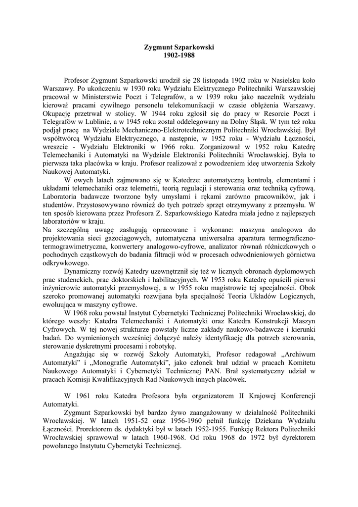 Zygmunt Szparkowski 1902-1988 Profesor Zygmunt Szparkowski urodził się 28 listopada 1902 roku w Nasielsku koło Warszawy. Po ukończeniu w 1930 roku Wydziału Elektrycznego Politechniki Warszawskiej pracował w Ministerstwie Poczt i Telegrafów, a w 1939 roku jako naczelnik wydziału kierował pracami cywilnego personelu telekomunikacji w czasie oblężenia Warszawy. Okupację przetrwał w stolicy. W 1944 roku zgłosił się do pracy w Resorcie Poczt i Telegrafów w Lublinie, a w 1945 roku został oddelegowany na Dolny Śląsk. W tym też roku podjął pracę na Wydziale Mechaniczno-Elektrotechnicznym Politechniki Wrocławskiej. Był współtwórcą Wydziału Elektrycznego, a następnie, w 1952 roku - Wydziału Łączności, wreszcie - Wydziału Elektroniki w 1966 roku. Zorganizował w 1952 roku Katedrę Telemechaniki i Automatyki na Wydziale Elektroniki Politechniki Wrocławskiej. Była to pierwsza taka placówka w kraju. Profesor realizował z powodzeniem ideę utworzenia Szkoły Naukowej Automatyki. W owych latach zajmowano się w Katedrze: automatyczną kontrolą, elementami i układami telemechaniki oraz telemetrii, teorią regulacji i sterowania oraz techniką cyfrową. Laboratoria badawcze tworzone były umysłami i rękami zarówno pracowników, jak i studentów. Przystosowywano również do tych potrzeb sprzęt otrzymywany z przemysłu. W ten sposób kierowana przez Profesora Z. Szparkowskiego Katedra miała jedno z najlepszych laboratoriów w kraju. Na szczególną uwagę zasługują opracowane i wykonane: maszyna analogowa do projektowania sieci gazociągowych, automatyczna uniwersalna aparatura termograficznotermograwimetryczna, konwertery analogowo-cyfrowe, analizator równań różniczkowych o pochodnych cząstkowych do badania filtracji wód w procesach odwodnieniowych górnictwa odkrywkowego. Dynamiczny rozwój Katedry uzewnętrznił się też w licznych obronach dyplomowych prac studenckich, prac doktorskich i habilitacyjnych. W 1953 roku Katedrę opuścili pierwsi inżynierowie automatyki przemysłowej, a w 1955 roku magistrowie tej specjalności. Obok szeroko promowanej automatyki rozwijana była specjalność Teoria Układów Logicznych, ewoluująca w maszyny cyfrowe. W 1968 roku powstał Instytut Cybernetyki Technicznej Politechniki Wrocławskiej, do którego weszły: Katedra Telemechaniki i Automatyki oraz Katedra Konstrukcji Maszyn Cyfrowych. W tej nowej strukturze powstały liczne zakłady naukowo-badawcze i kierunki badań. Do wymienionych wcześniej dołączyć należy identyfikację dla potrzeb sterowania, sterowanie dyskretnymi procesami i robotykę. Angażując się w rozwój Szkoły Automatyki, Profesor redagował „Archiwum Automatyki” i „Monografie Automatyki”, jako członek brał udział w pracach Komitetu Naukowego Automatyki i Cybernetyki Technicznej PAN. Brał systematyczny udział w pracach Komisji Kwalifikacyjnych Rad Naukowych innych placówek. W 1961 roku Katedra Profesora była organizatorem II Krajowej Konferencji Automatyki. Zygmunt Szparkowski był bardzo żywo zaangażowany w działalność Politechniki Wrocławskiej. W latach 1951-52 oraz 1956-1960 pełnił funkcję Dziekana Wydziału Łączności. Prorektorem ds. dydaktyki był w latach 1952-1955. Funkcję Rektora Politechniki Wrocławskiej sprawował w latach 1960-1968. Od roku 1968 do 1972 był dyrektorem powołanego Instytutu Cybernetyki Technicznej. Profesor był wielokrotnie wyróżniany i nagradzany. Otrzymał odznakę honorowego członka Stowarzyszenia Elektryków Polskich. Za działalność naukowo-dydaktyczną i społeczną otrzymał Odznakę Zasłużonego dla Dolnego Śląska jak też Odznakę Budowniczego miasta Wrocławia. Senat Politechniki Wrocławskiej przyznał Mu tytuł doktora honoris causa, jak również medal za wybitne zasługi dla rozwoju Politechniki Wrocławskiej. Z odznaczeń państwowych na szczególne wyróżnienie zasługują: Krzyż Kawalerski Orderu Odrodzenia Polski oraz Order Sztandaru Pracy I klasy. Był człowiekiem bardzo dokładnym i sumiennym. Ujmowała jego bezpośredniość i skromność w kontaktach ludzkich. Był bardzo aktywny. Opowiadał nawet o przypadku, jaki Mu się przydarzył w czasach PRL-u, kiedy jechał pociągiem z Warszawy do Wrocławia. Korzystając z dłuższego postoju w Łodzi wysiadł, chcąc w kiosku kupić papierosy. Zatrzymał go cywilny obywatel mówiąc: „Wasze dokumenty?”. Po wylegitymowaniu profesor zapytał, dlaczego właściwie on został skontrolowany. „A bo wy jesteście tacy aktywni” odpowiedział funkcjonariusz. Miał ogromne obycie i dystans do poruszanych i załatwianych spraw. Był człowiekiem o wspaniałej intuicji, wyrozumiałości i dobroci, ogromnie życzliwy ludziom. Odszedł na emeryturę w 1972 roku. Zmarł 7 lipca 1988 roku. Spoczywa na cmentarzu św. Wawrzyńca przy ul. Bujwida we Wrocławiu. Wrocław, 10.10.2009 r. Antoni Piątkowski Tadeusz Stanicki