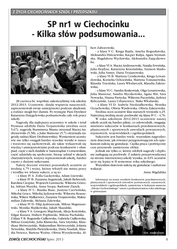 Z ˚YCIA CIECHOCI¡SKICH SZKÓ¸ I PRZEDSZKOLI SP nr1 w Ciechocinku - Kilka s∏ów podsumowania... 28 czerwca br. wspólnie zakoƒczyliÊmy rok szkolny 2012/2013. Uczniowie, dzi´ki wsparciu nauczycieli, zaprezentowali swoje umiej´tnoÊci podczas akademii, a rodzice mogli byç dumni. Po wyst´pie Pani Dyrektor Katarzyna Dzi´gelewska podsumowa∏a ca∏y rok pracy szko∏y. Nagrod´ dla najlepszej uczennicy w szkole i tytu∏ Prymusa zdoby∏a Daria Trojanowska (Êrednia ocen 5,67), nagrod´ Burmistrza Miasta otrzyma∏ Maciej Andryszewski (5,58), a Julia Mansour (5,7) otrzyma∏a nagrod´ radnej Klary Drobniewskiej. Wymienieni uczniowie nie tylko osiàgali bardzo wysokie wyniki w nauce i wzorowo si´ zachowywali, ale tak˝e wykazywali si´ wiedzà i umiej´tnoÊciami podczas konkursów i olimpiad, cz´Êç z nich dzia∏a∏a w Samorzàdzie Uczniowskim, cz´Êç udziela∏a si´ spo∏ecznie, bioràc udzia∏ w akcjach charytatywnych, wszyscy reprezentowali szko∏´, bardzo cz´sto z du˝ymi sukcesami. Nale˝y doceniç równie˝ pozosta∏ych uczniów ze Êrednià 4,75 i wy˝ej, którzy w∏o˝yli nie mniej pracy i wysi∏ku we w∏asny sukces, a sà to: - z klasy IV A: Zofia Gackowska, Adam Lisewski; - z klasy IV B: Zuzanna AuguÊciak, Jakub Behrendt, Karolina Cierpisz, Wojciech Gawinecki, Wiktoria Górecka, Adrian Muzyka, Anna Szopa, Radomir Zi´tek; - z klasy IV C: Bianka Buze, Justyna Czerwiƒska, Miko∏aj Gracz, Miko∏aj J´drzejewski, Wiktoria Kraszewska, Wiktor Ma∏kiewicz, Zuzanna Trojanowska, Maksymilian Zalewski, Melania Zalewska; - z klasy IV D: Filip J´druszczak, Mi∏osz Magnuszewski, Monika Maƒkowska, Jakub Skazalski; - z klasy V A: Grzegorz Majchrzak, Alicja KoÊciƒska, Edgar Kuzara, Hubert Pop∏awski, Milena Puchalska Z klasy V B: Bogumi∏a Cia∏kowska, Gabriela Cia∏kowska, Mi∏osz Gostyƒski, Julia Klamecka, Sara Lityƒska, Klaudiusz Mrówczyƒski, Maksymilian Mrówczyƒski, Jolanta Newelska, Matylda Pietrzykowska, Daria Szudzik, Klaudia Âwiercz, Bartosz Woêny, Oliwia Wyrzykowska, Al- ZDRÓJ CIECHOCI¡SKI lipiec 2013 bert Zaborowski; - z klasy V C: Kinga Bajda, Amelia Bogus∏awska, Aleksandra Hiƒczewska, Kacper Kulpa, Agata Szymaƒska, Magdalena W´c∏awska, Aleksandra Zajàczkowska; - z klasy VI A: Maciej Andryszewski, Natalia Erwiƒska, Julia Hejdysz, Katarzyna Krzemiƒska, Szymon Mas∏owski, Julia Szmyt, Daria Trojanowska; - z klasy VI B: Martyna Centkowska, Kinga Lewandowska, Kornelia Ochociƒska, Martyna Tomaszewska, Klaudia Trzciƒska, Laura W∏odarczyk, Klaudia Zakrzewska; - z klasy VI C: Sandra Krakowiak, Olga Lenartowska, Julia Mansour, Sandra Myczkowska, Agata MiÊ, Sara Nowacka, Hanna Partycka, Wiktoria Puczyƒska, J´drzej Rybczyƒski, Laura Urbanowicz, Maks W∏odarski; - z klasy VI D: Izabela Niedzia∏kowska, Monika Oczachowska, Oliwia Wasilewska, Oliwia Zakrzewska. Ârednia ocen uczniów klas starszych wynios∏a 4,25. Najwy˝szà Êrednià mo˝e pochwaliç si´ klasa IV C - 4,76. W roku szkolnym 2012/2013 uczniowie naszej szko∏y uczyli si´ bardzo pilnie, co udowodnili, osiàgajàc mnóstwo sukcesów w konkursach przedmiotowych, plastycznych i sportowych zawodach powiatowych, rejonowych, wojewódzkich i ogólnopolskich. Sukcesów jest bardzo wiele, wszystkim nagrodzonym dzieciom, jak równie˝ przygotowujàcym ich opiekunom nale˝à si´ gratulacje. Ci´˝ka praca i poÊwi´cony czas przynios∏y zamierzone efekty. Jednak nie tylko ci, którzy zdobyli nagrody i dyplomy zas∏ugujà na pochwa∏y. Z ankiety przeprowadzonej na stronie internetowej szko∏y wynika, ˝e 63% uczniów uczy si´ lepiej w II semestrze roku szkolnego. Wszystkim dzieciom nale˝à si´ gratulacje i zas∏u˝one wakacje. Anna Migdalska Informacje na temat wyników konkursów przedmiotowych, plastycznych i sportowych zawodów powiatowych, rejonowych, wojewódzkich i ogólnopolskich, zamieÊcimy w kolejnym numerze „Zdroju Ciechociƒskiego” razem z podsumowaniem roku szkolnego w gimnazjum. fot. nades∏ane 8