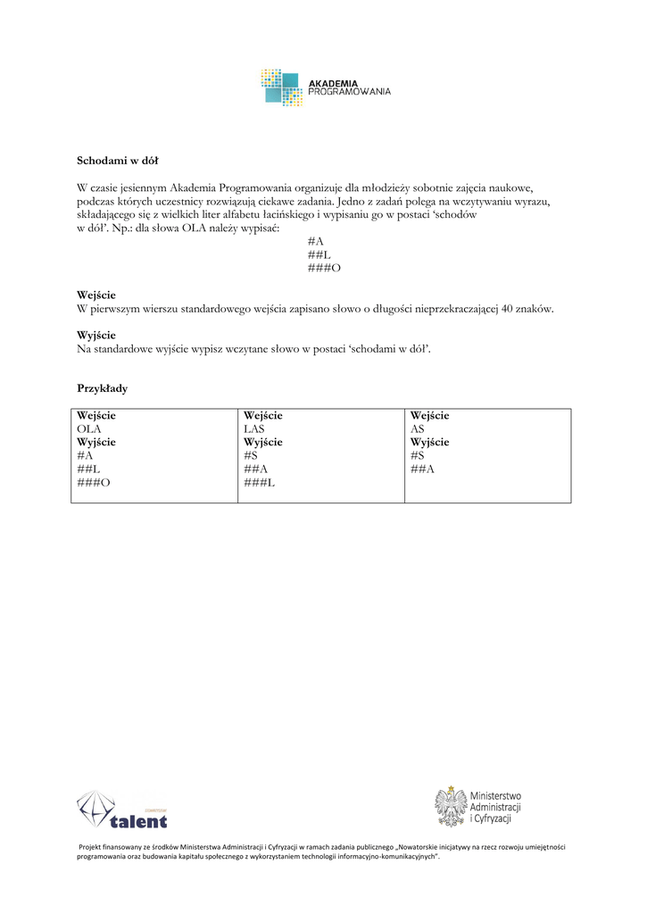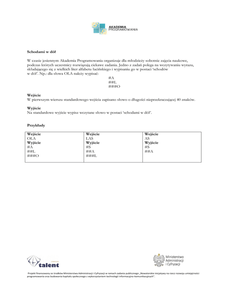 Schodami w dół W czasie jesiennym Akademia Programowania organizuje dla młodzieży sobotnie zajęcia naukowe, podczas których uczestnicy rozwiązują ciekawe zadania. Jedno z zadań polega na wczytywaniu wyrazu, składającego się z wielkich liter alfabetu łacińskiego i wypisaniu go w postaci ‘schodów w dół’. Np.: dla słowa OLA należy wypisać: #A ##L ###O Wejście W pierwszym wierszu standardowego wejścia zapisano słowo o długości nieprzekraczającej 40 znaków. Wyjście Na standardowe wyjście wypisz wczytane słowo w postaci ‘schodami w dół’. Przykłady Wejście OLA Wyjście #A ##L ###O Wejście LAS Wyjście #S ##A ###L Wejście AS Wyjście #S ##A Projekt finansowany ze środków Ministerstwa Administracji i Cyfryzacji w ramach zadania publicznego „Nowatorskie inicjatywy na rzecz rozwoju umiejętności programowania oraz budowania kapitału społecznego z wykorzystaniem technologii informacyjno-komunikacyjnych”.