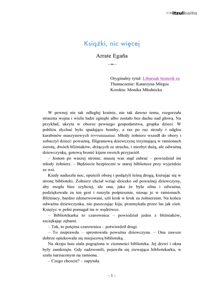 >>itzulbaita Książki, nic więcej Arrate Egaña Oryginalny tytuł: Liburuak besterik ez Tłumaczenie: Katarzyna Mirgos Korekta: Monika Młodnicka W pewnej nie tak odległej krainie, nie tak dawno temu, rozgorzała straszna wojna i wielu ludzi zginęło albo zostało bez dachu nad głową. Na przykład, ukryta w oborze pewnego gospodarstwa, grupka dzieci. W pobliżu słychać było spadające bomby, a raz po raz strzały i odgłos karabinów maszynowych trrrrataaataa. Młody żołnierz wszedł do obory i zobaczył dzieci: poważną, filigranową dziewczynę trzymającą w ramionach sierotę, dwóch bliźniaków, drżących ze strachu, i niezbyt dużą, ale odważną dziewczynkę, gotową bronić kijem swoich przyjaciół. – Jestem po waszej stronie, muszę was stąd zabrać – powiedział im młody żołnierz. – Będziecie bezpieczni w starej bibliotece przy wyjeździe ze wsi. Kiedy nadeszła noc, opuścili oborę i podążyli leśną drogą, kierując się w stronę biblioteki. Żołnierz chciał wziąć dziecko od poważnej dziewczyny, aby mogła biec szybciej, ale ona, jako że była silna i odważna, podziękowała za ten gest i ruszyła pośpiesznie, niosąc je w ramionach. Bliźniacy, bardzo zdenerwowani, szli krok w krok za żołnierzem. Na końcu odważna dziewczynka, nie puszczając kija, przemykała przez las jak cień. Księżyc w pełni pomagał im w wędrówce. – Bibliotekarka to czarownica – powiedział jeden z bliźniaków, szczękając zębami. – Tak, to potężna czarownica – potwierdził drugi. – To nieprawda – sprostowała poważna dziewczyna. – Ona zawsze dobrze opiekowała się miejscową biblioteką. Na skraju lasu stała pogrążona w ciemności biblioteka. Jej drzwi i okna były zamknięte. Gdy zadzwonili, pojawiła się ziewająca bibliotekarka, w szalu narzuconym na ramiona. – Czego chcecie? – zapytała. -1- >>itzulbaita Gasteiz – Poznan 2010 – Dzieci schronią się tutaj, ponieważ wróg zamierza spalić całą wieś. – W takim razie wejdźcie, ale nie zapalajcie światła – nakazała bibliotekarka. Weszli do środka, a dzięki wpadającemu przez kraty światłu księżyca mogli przyjrzeć się wnętrzu. Wszędzie panowała czystość i porządek, obrazy wisiały na ścianach, książki stały na półkach, a krzesła były ustawione wokół stołów, jakby w każdej chwili gotowe, na przyjęcie miejscowych dzieci. Kilka dni później żołnierza poinformowano przez radiostację, że wróg rzeczywiście podpalił wieś. Otrzymał też rozkaz, aby chronić dzieci. Z ogrodu przy bibliotece dostrzegli na ciemnym niebie pomarańczowy blask najdłuższych ognistych płomieni, słyszeli też krzyki i strzały. Przez następne dni nie słyszeli już nic. Słońce wstawało codziennie, a ptaki śpiewały. Dzieci bawiły się w lesie z żołnierzem, a nocą bibliotekarka czytała im do snu. Ta bibliotekarka nie była złym człowiekiem. Była bardzo mądrą i szczodrą kobietą, która wszystko, co miała, rozdzieliła między dzieci i nauczyła ich różnych zabaw. Przez kilka dni poruszali się tylko w okolicy biblioteki i na ścieżce prowadzącej do lasu, tak jakby znajdowali się w innym świecie, spokojnym świecie bez wojny. Poważna dziewczyna śmiała się, słuchając czułych słów żołnierza, zapomniała, że jest żołnierzem; sierota uznała bibliotekarkę za matkę, bliźniacy zamiast wciąż drżeć, wybuchali gromkim śmiechem, a odważna dziewczynka zamieniła kij na książkę. Ale wojna pozostała wojną. Pewnego razu, gdy dzieci siedziały przy bibliotekarce słuchając bajki, usłyszały radiostację żołnierza. Wróg, zabijając dom po domu pozostałych przy życiu ludzi, skierował się w stronę lasu. Następnego dnia rano dotrą do biblioteki! Dzieci znów zaczęły drżeć. Żołnierz nie wiedział, co robić, nie mieli wiele czasu na ucieczkę, a z drugiej strony nie było gdzie się ukryć! Wówczas bibliotekarka, która, jak słusznie podejrzewali bliźniacy, była czarownicą, zaproponowała niezwykłe wyjście, wyjście magiczne. – Ukryjemy się we wnętrzu książek. – Potrafisz tego dokonać? – zapytał zdumiony żołnierz. – Wejście do środka nie jest trudne, ale później ktoś będzie nas musiał stamtąd wydostać. – To bez znaczenia – powiedziała poważna dziewczyna. – Jeśli to jedyna możliwość ratunku, zróbmy to. Nie mieli zbyt wiele czasu. Z lasu dochodził hałas, wróg powalał drzewa i strzelał do wszystkiego, co się ruszało. -2- >>itzulbaita Gasteiz – Poznan 2010 – Szybko – powiedziała bibliotekarka do bliźniaków. – Dokąd chcecie się wybrać w podróż? Podoba się wam ta książka przygodowa? Albo tamta, o piratach? Bliźniacy, nie przestając drżeć, zdecydowali się wejść do wnętrza opowieści przygodowej i kobieta wysłała ich tam, szepcząc kilka magicznych słów. Odważna dziewczynka wybrała książkę o piratach, a poważna dziewczyna, ponieważ zakochała się w żołnierzu, poprosiła go, aby razem ukryli się w baśni o elfach. – Ja muszę walczyć – odpowiedział. Bibliotekarka poprosiła młodego żołnierza, aby nie zostawał, gdyż wojna jest zła, a on nie jest złym młodzieńcem. – Pomyśl, dla wielu innych ty będziesz takim samym wrogiem, jakim oni są dla nas. Będą się bali, a ty ich skrzywdzisz. Żołnierz nie uległ jednak. Oznajmił, że pewnego dnia wróci i odszuka ich wśród opowieści. – W takim razie aż do twego powrotu zostanę w baśni o Królowej Śniegu – powiedziała dziewczyna - i będę żyć w zimnie do czasu, aż wrócisz. Bibliotekarka na oczach zapłakanego żołnierza umieściła dziewczynę w baśni o Królowej Śniegu, a następnie pożegnała się z nim. Kobieta od dawna chciała odwiedzić legendę o rycerzach i zanurzyła się w jednym z takich tomów, zabierając ze sobą dziecko. Ostatnia książka zamknęła się, a żołnierz uciekł zasmucony, zanim zaczęło świtać. Wrogowie zdewa