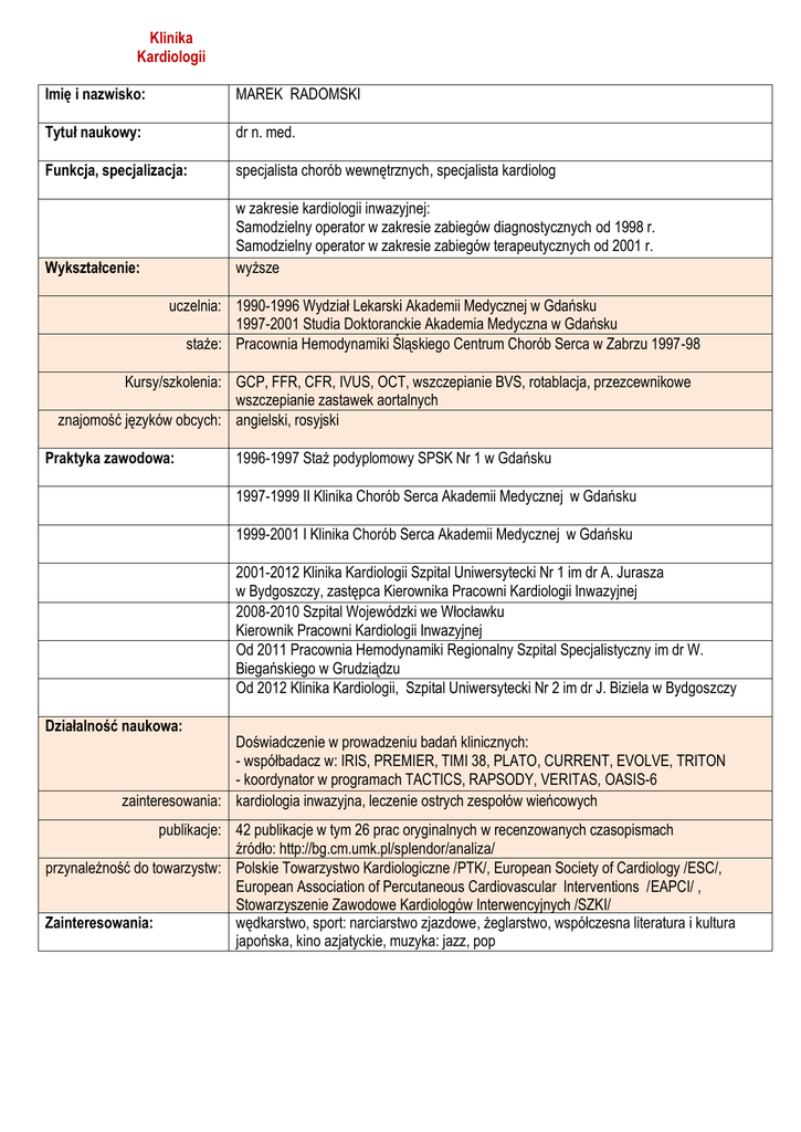 Klinika Kardiologii Imię i nazwisko: MAREK RADOMSKI Tytuł
