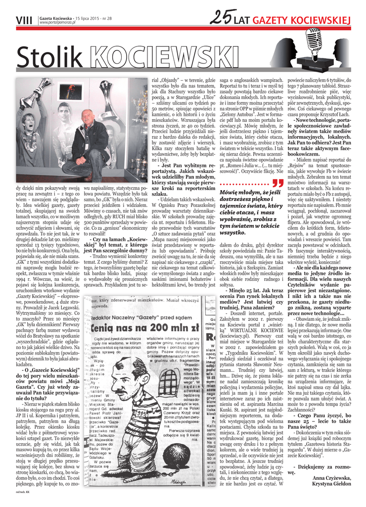 25 Stolik KOCIEWSKI VIII dy dzięki nim pokazywały swoją pracę na zewnątrz i – z tego co wiem - nawzajem się podglądały. Idea wielkiej gazety, gazety totalnej, skupiającej na swoich łamach wszystko, co w możliwym najszerszym stopniu udaje się uchwycić zdjęciem i słowami, się sprawdzała. To nie jest tak, że w drugiej dekadzie lat 90. mieliśmy sprzedaż 13 tysięcy tygodniowo, bo nie było konkurencji. Ona była, pojawiała się, ale nie miała szans. „GK” z tymi wszystkimi dodatkami naprawdę mogła budzić respekt, zwłaszcza w tymże właśnie 1994 r. Wówczas, na wieść, że pojawi się kolejna konkurencja, uruchomiłem wtorkowe wydanie „Gazety Kociewskiej” – ekspresowe, poweekendowe, 4 duże strony. Prowadził je Jacek Legawski. Wytrzymaliśmy 10 miesięcy. Co to znaczyło? Przez 10 miesięcy „GK” była dziennikiem! Pierwszy pachnący farbą numer wydawca wiózł do Bratysławy na spotkanie „wyszechradzkie”, gdzie oglądano to jak jakieś wielkie dziwo. Na poziomie sublokalnym (powiatowym) dziennik to była jakaś abrakadabra. - O „Gazecie Kociewskiej” do tej pory wielu mieszkańców powiatu mówi „Moja Gazeta”. Czy już wtedy zauważał Pan takie przywiązanie do tytułu? - Nieraz w piątek stałem blisko kiosku stojącego na rogu przy al. JP II i ul. Kopernika i patrzyłem, patrzyłem, patrzylem na długą kolejkę. Przez okienko kiosku widać było z półmetrowej wysokości sztapel gazet. To niezwykłe uczucie, gdy się widzi, jak tak masowo kupują to, co przez kilka wcześniejszych dni robiliśmy, że stoją w długiej prędko przesuwającej się kolejce, bez słowa w stronę kioskarki, co chcą, bo wiadomo było, o co im chodzi. To coś pięknego, gdy kupuje to, co znored tech. KK LAT GAZETY KOCIEWSKIEJ Gazeta Kociewska - 15 lipca 2015 - nr 28 www.portalpomorza.pl wu napisaliśmy, statystyczna połowa powiatu. Wszędzie było tak samo, bo „GK” była o nich. Nieraz przecież jeździłem i widziałem. Mówimy o czasach, nie tak znów odległych, gdy RUCH miał blisko 500 punktów sprzedaży w powiecie. Co za „geniusz” ekonomiczny to rozwalił! - Czy na łamach „Kociewskiej” był temat, z którego jest Pan szczególnie dumny? - Trudno wymienić konkretny temat. Z czego byliśmy dumni? Z tego, że tworzyliśmy gazetę będąc tak bardzo blisko ludzi, pisząc o wydawałoby się prozaicznych sprawach. Przykładem jest tu se- rial „Objazdy” – w terenie, gdzie wszystko było dla nas tematem, jak dla Stachury wszystko było poezją, a w Starogardzie „Ulice” – szliśmy ulicami co tydzień po 50 metrów, spisując opowieści z kamienic, o ich historii i o życiu mieszkańców. Wzruszająca była strona życzeń, ze 40 co tydzień. Przecież ludzie przyjeżdżali nieraz z bardzo daleka do redakcji, by zostawić zdjęcie i wierszyk. Kilka razy stoczyłem batalię w wydawnictwe, żeby były bezpłatne i były. - Jest Pan wybitnym reportażystą. Jakich wskazówek udzieliłby Pan młodym, którzy stawiają swoje pierwsze kroki na reporterskim szlaku. - Udzielam takich wskazówek. W Ognisku Pracy Pozaszkolnej prowadzę warsztaty dziennikarskie. W szkołach prowadzę zajęcia nt. reportażu i felietonu. Hasło przewodnie tych warsztatów „O sztuce zadawania pytań” oraz „Mapa naszej miejscowości jako świat przedstawiony w reportażu lub opowiadaniu”. Próbuję zwrócić uwagę na to, że nie da się napisać nic ciekawego z „czapki”, nic ciekawego na temat całkowicie wymyślonego świata z anglosaskimi imionami bohaterów i hektolitrami krwi, bo trendy jest saga o anglosaskich wampirach. Reportaż to tu i teraz i w myśl tej zasady powstają bardzo ciekawe dokonania młodych. Ich reportaże i inne formy można przeczytać na stronie OPP w piśmie młodych „Zielony Autobus”. Jest w formacie pdf lub na moim portalu kociewiacy.pl. Mówię młodym, że jeśli dostrzeżesz piękno i tajemnice świata, który ciebie otacza, i masz wyobraźnię, zrobisz z tym światem w tekście wszystko. I tak się nieraz dzieje. Pewna uczennica napisała świetne opowiadanie pt. „Romeo i Julia w... (... tu miejscowość)”. Oczywiście fikcję. Nie Mówię młodym, że jeśli dostrzeżesz piękno i tajemnice świata, który ciebie otacza, i masz wyobraźnię, zrobisz z tym światem w tekście wszystko. powiecie naliczyłem 6 tytułów, do tego 7 planowany tabloid. Straszliwe rozdrobnienie piór, więc wycinkowość, brak publicystyki, piór zewnętrznych, dyskusji, sporów. Coś ciekawego od pewnego czasu proponuje Krzysztof Łach. - Nowe technologie, portale społecznościowe zawładnęły światem także mediów informacyjnych, lokalnych. Jak Pan to odbiera? Jest Pan teraz także aktywnym facebookowiczem. - Miałem napisać reportaż do „Rejsów” na temat spustoszenia, jakie wywołuje Fb w świecie młodych. Zebrałem na ten temat mnóstwo informacji na warsztatach w szkołach. Na końcu reportażu miało być o Fb z autopsji, więc się uaktywniłem. I niestety reportażu nie napisałem. Fb mnie wciągnął, pochłonął, zaczarował i pożarł, jak wnętrze ogromneg flipera. Ale spowodował, że wróciłem do krótkich form, felietonowych, a od grudnia do opowiadań i wreszcie powieści. Tam zaczęła powstawać w odcinkach. Fb fascynuje interaktywnością, niemniej trzeba będzie z niego wkrótce wyleźć, koniecznie! - Ale nie dla każdego nowe media to jedyne źródło informacji. Dla wielu naszych Czytelników wydanie papierowe jest niezastąpione. I nikt ich a także nas nie przekona, że gazety niedługo znikną, zostaną wyparte przez nowe technologie... - Obawiam się, że jednak znikną. I nie dlatego, że nowe media lepiej przekazują informacje. One walą w coś bardzo istotnego, co było charakterytyczne dla starszych pokoleń. Walą w coś, co ja bym określił jako nawyk duchowego wyłączania się i spokojnego czytania, zamknięcia się sam na sam z lekturą, w trakcie którego nie patrzy się na czas 