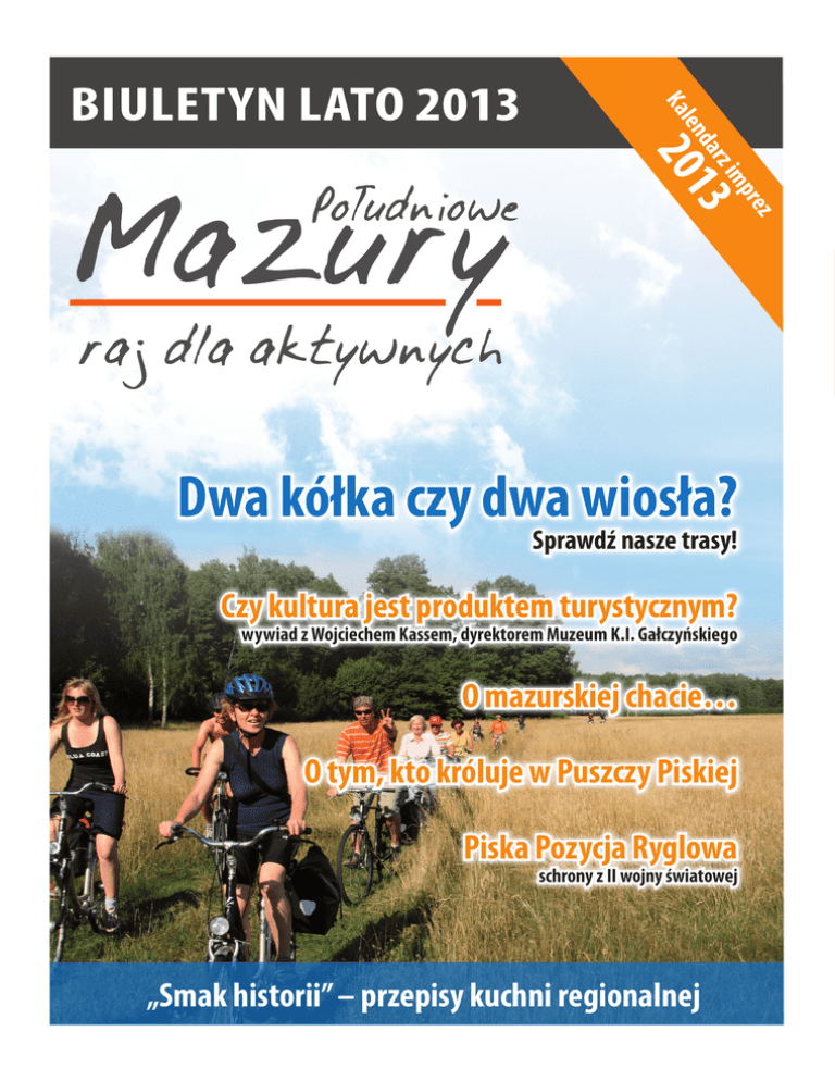 Ka rez 13 mp rz i 20 da len Biuletyn Lato 2013 Dwa kółka czy dwa wiosła? Sprawdź nasze trasy! Czy kultura jest produktem turystycznym? wywiad z Wojciechem Kassem, dyrektorem Muzeum K.I. Gałczyńskiego O mazurskiej chacie… O tym, kto króluje w Puszczy Piskiej Piska Pozycja Ryglowa schrony z II wojny światowej „Smak historii” – przepisy kuchni regionalnej 2 TURYSTYKA KAJAKOWA Szlak kajakowy rzeki Pisy • Las Ochronny Szast w Puszczy Piskiej (powstały po huraganie z 2002 roku który nawiedził Puszczę Piską) • Skansen Kurpiowski w Nowogrodzie • Charakterystyczna zabudowa wsi kurpiowskich położonych nad Pisą z ich lokalnym klimatem • Bunkry z II wojny światowej (miejscowości: Jeże, Wolisko) • Zaginione wioski Puszczy Piskiej (Niedźwiedzie, Wilki, Dziadowo, Szast, Wolisko, Paski) Proponowane trasy: • Wariant A – 1-dniowy Pisz – Dziadowo: – 18 km, czas na przepłynięcie – 4-4,5 godziny • Wariant B – 3-dniowy Pisz – Dziadowo - Jeże – Kozioł – Ptaki – 42,8 km • Wariant C – 4-dniowy Pisz – Jeże – Kozioł – Ptaki – Dobrylas – Nowogród – 81 km Rzeka Pisa 81 kilometrów długości i należy do najbardziej meandrujących rzek Europy. Początek swój bierze w wodach jeziora Roś, natomiast bieg swój kończy w Nowogrodzie, gdzie wpada do Narwi. W początkowej fazie rzeka przepływa przez Puszczę Piską (do 20 km), natomiast w dalszym biegu przepływa przez Równinę Kurpiowską. Trasa stosunkowo łatwa, na trasie brak zorganizowanych campingów, dobre warunki noclegowe wyłącznie w Piszu, Koźle i Ptakach, w pozostałych miejscach na łąkach za zgodą gospodarzy. Atrakcje turystyczne: SZLAK KAJAKOWY –––– Szlak kajakowy im. Michała Kajki jeziora: Orzyskie, Śniardwy Szlak imieniem znanego mazurskiego poety, to oferta dla osób preferujących bliski kontakt z przyrodą, poszukujących spokoju, refleksji i ucieczki od cywilizacji. Spływ rozpoczyna się na Jeziorze Zdedy, a kończy w Okartowie nad jeziorem Śniardwy. W roku 2012 szlak im. Michała Kajki został wybrany przez internautów najpiękniejszym szlakiem kajakowym na Mazurach, wyprzedzając rzekę Krutynię – Królową mazurskich rzek. Niczym nie zakłócony kontakt z dziką naturą w pełni rekompensuje brak rozbudowanej infrastruktury turystycznej. Atrakcje turystyczne: • Muzeum artysty Michała Kajki w Ogródku • Kościół w Okartowie • Pozostałości grodziska nad jeziorem Tyrkło pochodzące z prehistorycznych czasów • Ruiny starego młyna na cieku łączącym jezioro Przykop z jeziorem Rostki Proponowane trasy: • Wariant A – 1-dniowy jez. Zdedy – Jez. Lipińskie – Klusy – jez. Kraksztyn – Ogródek 13,5 km (czas płynięcia ok. 4-4,5 godz.) • Wariant B – 2-dniowy jez. Zdedy – Jez. Lipińskie – Klusy – jez. Kraksztyn – Ogródek (13,5 km) – Jez. Kaleńskie – jez. Rostki – jez. Orzysz – Orzysz (13,0 km) • Wariant C – 3-dniowy jez. Zdedy – Jez. Lipińskie – Klusy – jez. Kraksztyn – Ogródek – Jez. Kaleńskie – jez. Roski – jez. Orzysz – Orzysza – jez. Tyrkło – jez. Śniardwy – Okartowo – 34 km SZLAK KAJAKOWY –––– 3 Turystyka rowerowa TRASY ROWEROWE –––– Trasa rowerowa „Wokół jeziora Śniardwy” wariant 1 Trasa: – – – – Pisz – Niedźwiedzi Róg – Wejsuny – Popielno – Mikołajki – Dziubiele – Suchy Róg – Tuchlin – Zdęgówko – Wężewo – Okartowo – Zdory – Szczechy Wielkie – Pisz Uwaga: Trasa przebiega przez przeprawę promową przez Jezioro Bełdany na Wierzbie. Prom kursuje od maja do października. Charakterystyka: długość trasy: 100,4 km czas przejazdu: ≈8,5 godziny, Trasę można podzielić na 2 dni. Trasa o średnim stopniu trudności. Co warto zobaczyć: Trasa biegnie wokół największego jeziora w Polsce – Śniardwy, zwanego również Mazurskim Morzem. Szlak prowadzi w większości przez Mazurski Park Krajobrazowy oraz lasy Puszczy Piskiej: lasy mieszane, tereny bagienne, klify, punkty widokowe. Na trasie znajduje się wiele atrakcji: punkt widokowy Niedźwiedzi Róg na wyspy Jeziora Śniardwy – Czarci Ostrów, Pajęczą i półwysep Szeroki Ostrów; Stacja Badawcza PAN w Popielnie – rezerwat konika polskiego, przeprawa promowa na jeziorze Bełdany, jezioro Łuknajno stanowiące jedną z największych ostoi łabędzia niemego w Europie, Muzeum Reformacji w Mikołajkach, kościoły ewangelickie w Wejsunach i Mikołajkach, punkt widokowy w Okartowie i w Nowych Gutach. wariant 2 Rowerem i statkiem wokół Mazurskiego Morza Trasa: – – – – Pisz – Karwik – Niedźwiedzi Róg – Końcewo – Wejsuny – Ruciane Nida – rejs statkiem Ruciane – Mikołajki ( ok. 2,5 godzin) – Łuknajno – Dziubiele – Suchy Róg – Tuchlin – Okartowo – Nowe Guty – Kwik – Zdory – Szczechy Wielkie – Karwik Trasa rowerowa „Zaginione Wioski Puszczy Piskiej” Co warto zobaczyć: • Pozostałości po hucie i cmentarz w nieistniejącej wsi Wądołek. W miejscowości działała największa w Prusach Wschodnich huta żelaza, po jej zlikwidowaniu funkcjonował młyn i leśniczówka, a malowniczo położona nad rzeczką Rybnicą osada zyskała m.in. status atrakcji turystycznej. Obecnie po osadzie i hucie pozostały tylko ślady urządzeń hydrotechnicznych i fundamenty zabudowań, jaz na Rybnicy oraz cmentarz ewangelicki. • Las Ochronny Szast w Puszczy Piskiej. • Elementy architektury mazurskiej we wsiach Pogobie Tylne, Pogobie Średnie i Piskorzewo. • Pozostałości nieistniejących wsi Szast, Piskorzewo, Mały Wądołek. • Zabytkowa wieża ciśnień w Piszu – obecnie po gruntownej modernizacji. Charakterystyka: długość trasy: 85 km przeciętny czas przejazdu: 8-9 godz. Trasę można podzielić na 2 dni . Trasa o średnim stopniu trudności. Trasa: – – – – Charakterystyka: Pisz – Pogobie Średnie – Pogobie Tylne – Piskorzewo – Wądołek – Szast – Pisz długość trasy: 33,42 km pr